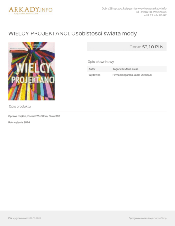 Dobra28 sp zoo. księgarnia wysyłkowa arkady.info ul. Dobra 28, Warszawa +48 22 444 86 97 WIELCY PROJEKTANCI. Osobistości świata mody Cena: 53,10 PLN Opis słownikowy Autor Tagariello Maria Luisa Wydawca Firma Księgarska Jacek Olesiejuk Opis produktu Oprawa miękka, Format 25x30cm, Stron 302 Rok wydania 2014 Plik wygenerowano: 07-03-2017 Powered by TCPDF (www.tcpdf.org) Oprogramowanie sklepu: AptusShop