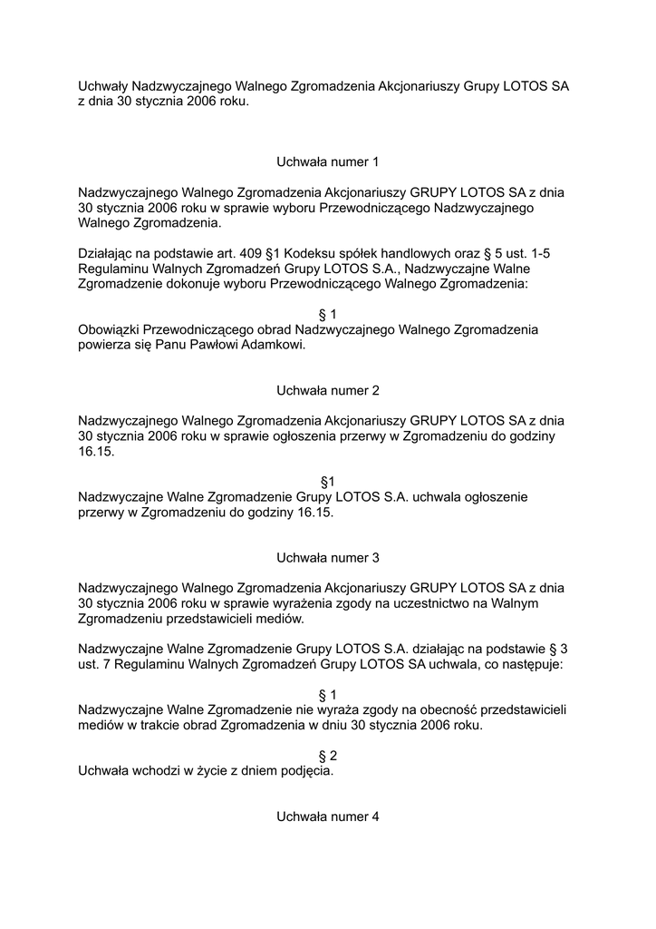 Uchwały Nadzwyczajnego Walnego Zgromadzenia Akcjonariuszy Grupy LOTOS SA z dnia 30 stycznia 2006 roku. Uchwała numer 1 Nadzwyczajnego Walnego Zgromadzenia Akcjonariuszy GRUPY LOTOS SA z dnia 30 stycznia 2006 roku w sprawie wyboru Przewodniczącego Nadzwyczajnego Walnego Zgromadzenia. Działając na podstawie art. 409 §1 Kodeksu spółek handlowych oraz § 5 ust. 1-5 Regulaminu Walnych Zgromadzeń Grupy LOTOS S.A., Nadzwyczajne Walne Zgromadzenie dokonuje wyboru Przewodniczącego Walnego Zgromadzenia: §1 Obowiązki Przewodniczącego obrad Nadzwyczajnego Walnego Zgromadzenia powierza się Panu Pawłowi Adamkowi. Uchwała numer 2 Nadzwyczajnego Walnego Zgromadzenia Akcjonariuszy GRUPY LOTOS SA z dnia 30 stycznia 2006 roku w sprawie ogłoszenia przerwy w Zgromadzeniu do godziny 16.15. §1 Nadzwyczajne Walne Zgromadzenie Grupy LOTOS S.A. uchwala ogłoszenie przerwy w Zgromadzeniu do godziny 16.15. Uchwała numer 3 Nadzwyczajnego Walnego Zgromadzenia Akcjonariuszy GRUPY LOTOS SA z dnia 30 stycznia 2006 roku w sprawie wyrażenia zgody na uczestnictwo na Walnym Zgromadzeniu przedstawicieli mediów. Nadzwyczajne Walne Zgromadzenie Grupy LOTOS S.A. działając na podstawie § 3 ust. 7 Regulaminu Walnych Zgromadzeń Grupy LOTOS SA uchwala, co następuje: §1 Nadzwyczajne Walne Zgromadzenie nie wyraża zgody na obecność przedstawicieli mediów w trakcie obrad Zgromadzenia w dniu 30 stycznia 2006 roku. §2 Uchwała wchodzi w życie z dniem podjęcia. Uchwała numer 4 Nadzwyczajnego Walnego Zgromadzenia Akcjonariuszy GRUPY LOTOS SA z dnia 30 stycznia 2006 roku w sprawie zmian w składzie Rady Nadzorczej. Nadzwyczajne Walne Zgromadzenie Grupy LOTOS S.A. działając na podstawie art. 385 § 1 Kodeksu spółek handlowych oraz § 9 pkt. 4 i § 11 ust. 2 Statutu Spółki, uchwala co następuje: §1 Odwołuje się ze składu Rady Nadzorczej Grupy LOTOS Spółki Akcyjnej Pana Grzegorza Urbana. §2 Uchwała wchodzi w życie z dniem podjęcia. Uchwała numer 5 Nadzwyczajnego Walnego Zgromadzenia Akcjonariuszy GRUPY LOTOS SA z dnia 30 stycznia 2006 roku w sprawie zmian w składzie Rady Nadzorczej. Nadzwyczajne Walne Zgromadzenie Grupy LOTOS S.A. działając na podstawie art. 385 § 1 Kodeksu spółek handlowych oraz § 9 pkt. 4 i § 11 ust. 2 Statutu Spółki, uchwala co następuje: §1 Odwołuje się ze składu Rady Nadzorczej Grupy LOTOS Spółki Akcyjnej Panią Annę Andrzejczak. §2 Uchwała wchodzi w życie z dniem podjęcia. Uchwała numer 6 Nadzwyczajnego Walnego Zgromadzenia Akcjonariuszy GRUPY LOTOS SA z dnia 30 stycznia 2006 roku w sprawie zmian w składzie Rady Nadzorczej. Nadzwyczajne Walne Zgromadzenie Grupy LOTOS S.A. działając na podstawie art. 385 § 1 Kodeksu spółek handlowych oraz § 9 pkt. 4 i § 11 ust. 2 Statutu Spółki, uchwala co następuje: §1 Odwołuje się ze składu Rady Nadzorczej Grupy LOTOS Spółki Akcyjnej Pana Piotra Krupę. §2 Uchwała wchodzi w życie z dniem podjęcia. Uchwała numer 7 Nadzwyczajnego Walnego Zgromadzenia Akcjonariuszy GRUPY LOTOS SA z dnia 30 stycznia 2006 roku w sprawie zmian w składzie Rady Nadzorczej. Nadzwyczajne Walne Zgromadzenie Grupy LOTOS S.A. działając na podstawie art. 385 § 1 Kodeksu spółek handlowych oraz § 9 pkt. 4 i § 11 ust. 2 Statutu Spółki, uchwala co następuje: §1 Odwołuje się ze składu Rady Nadzorczej Grupy LOTOS Spółki Akcyjnej Pana Roberta Karwowskiego. §2 Uchwała wchodzi w życie z dniem podjęcia. Uchwała numer 8 Nadzwyczajnego Walnego Zgromadzenia Akcjonariuszy GRUPY LOTOS SA z dnia 30 stycznia 2006 roku w sprawie zmian w składzie Rady Nadzorczej. Nadzwyczajne Walne Zgromadzenie Grupy LOTOS S.A. działając na podstawie art. 385 § 1 Kodeksu spółek handlowych oraz § 9 pkt. 4 i § 11 ust. 2 Statutu Spółki, uchwala co następuje: §1 Odwołuje się ze składu Rady Nadzorczej Grupy LOTOS Spółki Akcyjnej Pana Janusza Rachonia – Wiceprzewodniczącego Rady Nadzorczej. §2 Uchwała wchodzi w życie z dniem podjęcia. Uchwała numer 9 Nadzwyczajnego Walnego Zgromadzenia Akcjonariuszy GRUPY LOTOS SA z dnia 30 stycznia 2006 roku w sprawie zmian w składzie Rady Nadzorczej. Nadzwyczajne Walne Zgromadzenie Grupy LOTOS S.A. działając na podstawie art. 385 § 1 Kodeksu spółek handlowych oraz § 9 pkt. 4 i § 11 ust. 2 Statutu Spółki, uchwala co następuje: §1 Odwołuje się ze składu Rady Nadzorczej Grupy LOTOS Spółki Akcyjnej Pana Cezarego Nowosada – Przewodniczącego Rady Nadzorczej. §2 Uchwała wchodzi w życie z dniem podjęcia. Uchwała numer 10 Nadzwyczajnego Walnego Zgromadzenia Akcjonariuszy GRUPY LOTOS SA z dnia 30 stycznia 2006 roku w sprawie zmian w składzie Rady Nadzorczej. Nadzwyczajne Walne Zgromadzenie Grupy LOTOS S.A. działając na podstawie art. 385 § 1 Kodeksu spółek handlowych oraz § 9 pkt. 4 i § 11 ust. 2 Statutu Spółki, uchwala co następuje: §1 Odwołuje się ze składu Rady Nadzorczej Grupy LOTOS Spółki Akcyjnej Panią Katarzynę Dawidczyk – Sekretarza Rady Nadzorczej. §2 Uchwała wchodzi w życie z dniem podjęcia. Uchwała numer 11 Nadzwyczajnego Walnego Zgromadzenia Akcjonariuszy GRUPY LOTOS SA z dnia 30 stycznia 2006 roku w sprawie ustalenia liczby członków Rady Nadzorczej. Nadzwyczajne Walne Zgromadzenie Grupy LOTOS S.A. działając na podstawie § 11 ust. 1 Statutu Spółki, uchwala co następuje: §1 Ustala się liczbę członków Rady Nadzorczej na siedmiu członków. §2 Uchwała wchodzi w życie z dniem podjęcia. Uchwała numer 12 Nadzwyczajnego Walnego Zgromadzenia Akcjonariuszy GRUPY LOTOS SA z dnia 30 stycznia 2006 roku w sprawie zmian w składzie Rady Nadzorczej -powołania Przewodniczącego Rady Nadzorczej. Nadzwyczajne Walne Zgromadzenie Grupy LOTOS S.A. działając na podstawie art. 385 § 1 Kodeksu spółek handlowych oraz § 9 pkt. 4 i § 11 ust. 2 i 4 Statutu Spółki, uchwala co następuje: §1 Powołuje się Pana Jana Szomburga na funkcję Przewodniczącego Rady Nadzorczej Grupy LOTOS Spółki Akcyjnej na dalszy okres trwania VI ka