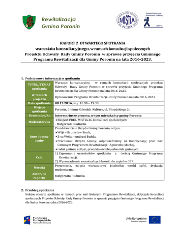 Rewitalizacja Gmina Poronin RAPORT Z OTWARTEGO SPOTKANIA warsztatu konsultacyjnego, w ramach konsultacji społecznych Projektu Uchwały Rady Gminy Poronin w sprawie przyjęcia Gminnego Programu Rewitalizacji dla Gminy Poronin na lata 2016-2023. 1. Podstawowe informacje o spotkaniu Warsztat konsultacyjny, w ramach konsultacji społecznych projektu TYTUŁ/TEMAT Uchwały Rady Gminy Poronin w sprawie przyjęcia Gminnego Programu spotkania Rewitalizacji dla Gminy Poronin na lata 2016-2023. W ramach Opracowanie Programu Rewitalizacji Gminy Poronin na lata 2016-2023 projektu Data spotkania 08.12.2016, w g. 16.30 – 19.30 Miejsce Poronin, Gminny Ośrodek Kultury, ul. Piłsudskiego 2; spotkania Uczestnicy/ki Interesariusze procesu, w tym mieszkańcy gminy Poronin Ekspert FRDL MISTiA ds. konsultacji społecznych: Moderator/ka - Małgorzata Rudnicka Przedstawiciele Urzędu Gminy Poronin, w tym: Wójt – Bronisław Stoch, Inne obecne Z-ca Wójta –Andrzej Buńda, osoby Pracownik Urzędu Gminy, odpowiedzialny za koordynację prac nad Gminnym Programem Rewitalizacji– Agnieszka Machaj, radni gminni, sołtysi, przedstawiciele jednostek gminnych. 1) Zapoznanie uczestników spotkania z treścią Gminnego Programu Cele Rewitalizacji. 2) Wprowadzenie ewentualnych korekt do zapisów GPR. Prezentacja, zajęcia warsztatowe (technika: world cafe), dyskusja Metoda moderowana. Autor/ka Małgorzata Rudnicka raportu 2. Przebieg spotkania Kolejne otwarte spotkanie w ramach prac nad Gminnym Programem Rewitalizacji, dotyczyło konsultacji społecznych Projektu Uchwały Rady Gminy Poronin w sprawie przyjęcia Gminnego Programu Rewitalizacji dla Gminy Poronin na lata 2016-2023. Uczestniczyli w nim przedstawiciele całej gminy, w tym radni, sołtysi, liderzy organizacji pozarządowych. Podczas warsztatu konsultacyjnego zastosowane zostały różne metody prowadzenia spotkania: prezentacja i dyskusja moderowana, ale 2/3 spotkania wypełniły warsztaty prowadzone tym razem metodą world cafe, z niewielką modyfikacją w stosunku do wzorca (techniki). W pierwszej części spotkania została przedstawiona struktura i kluczowe założenia Gminnego Programu Rewitalizacji (w formie prezentacji Power Point i prezentacji części dokumentu). W drugiej części uczestnicy zostali podzieleni na 5 grup. Każda z grup otrzymała opis jednego (każda innego) przedsięwzięcia podstawowego, będącego elementem Gminnego Programu Rewitalizacji. Zadaniem pracujących w grupach, było zapoznanie się z treścią i wniesienie ewentualnych wniosków/uwag do zapisów. Kolejne etapy prac warsztatowych polegały na uzupełnianiu, bądź korygowaniu uwag/wniosków do opisów wprowadzonych przez kolejne grupy. W efekcie, wszyscy uczestnicy spotkania mieli możliwość zapoznania się z opisem każdego z podstawowych przedsięwzięć i wniesieniem swoich sugestii/wniosków. Ostatnim etapem prac była prezentacja zapisów wprowadzonych przez wszystkie grupy do kolejnych przedsięwzięć. W trakcie dyskusji moderowanej, wprowadzane były korekty do ostatecznych zapisów. Uczestnicy spotkania mieli możliwość dyskusji na temat całej zawartości Gminnego Programu Rewitalizacji. WNIOSKI/UWAGI DO OPISÓW PRZEDSIĘWZIĘĆ ZAWARTYCH W GMINNYM PROGRAMIE REWITALIZACJI DLA GMINY PORONIN NA LATA 2016-2023 Zgłoszone w czasie konsultacji z mieszkańcami w dniu 8 grudnia 2016. Nr uwagi Uwaga nr 1 Część dokumentu, do którego odnosi się uwaga (numer strony dokumentu, nazwa sekcji) Opis przedsięwzięcia NR 1 PRZESTRZEŃ DLA NAS: STWORZENIE PRZESTRZENI I OFERTY CZASU WOLNEGO ORAZ MIEJSCA AKTYWIZACJI I INTEGRACJI SPOŁECZNEJ DLA MIESZKAŃCÓW GMINY PORONIN (SIEĆ GOK) Uwaga nr 2 Opis przedsięwzięcia NR 1 Uwaga nr 3 Opis przedsięwzięcia NR 1 Treść uwagi/opinii/propozycji Uzasadnienie uwagi 9-ta kropka – skorygować zapis dot. klasy VI i gimnazjum – zachować poziom ogólności (wyniki egzaminów szkolnych) Z uwagi na aktualnie przygotowywaną reformę edukacji i propozycję likwidację gimnazjów -lepiej zachować poziom ogólności przy określaniu wyników egzaminów (dla możliwości porównywania danych/wskaźników w przyszłości) Uzupełnić opis o : Doposażenie filii GOK-u w Małem Cichem o księgozbiór (książki, czasopisma) Uzupełnić opis: Utworzenie w filii GOK-u w Małem Cichem kafejki internetowej, ewentualnie podkreślić zakup sprzętu multimedialnego Brak w sołectwie Małe Ciche biblioteki Opis przedsięwzięcia zdaniem uczestników spotkania konsultacyjnego, wymaga takiego uzupełnienia Uwaga nr 4 Opis przedsięwzięcia NR 1 Uwaga nr 5 Opis przedsięwzięcia NR 1 Uwaga nr 6 Opis przedsięwzięcia NR 1 Uwaga nr 7 Opis przedsięwzięcia NR 1 Uwaga nr 8 Opis przedsięwzięcia NR 1 Uwaga nr 9 Opis przedsięwzięcia NR 2: ŚWIETLICE MIEJSCEM AKTYWIZACJI I INTEGRACJI: TWORZENIE i/lub DOPOSAŻENIE Uzupełnić opis: Utworzyć w GOK salę tradycji i historii dostępną dla turystów Uzupełnić opis: Po przeniesieniu przedszkola z GOK-u – pomieszczenie wykorzystać jako miejsce spotkań lokalnych grup Uzupełnić opis: GOK w Poroninie - przebudowa kuchni, sanitariatów – dostosowanie do obowiązujących standardów. Uzupełnić opis: Adaptacja sal po przedszkolu na sale wystawowe, zajęć tematycznych, nauki gry na instrumentach, kółka plastyczne, malarskie itp. Poszerzyć opis: W rejonie GOK-u w Poroninie wyznaczyć miejsce na stworzenie w okresie zimowym lodowiska Uzupełnić opis: dla świetlic w miejscowościach: Bustryk, Małe Ciche, Stasikówka – Opis przedsięwzięcia zdaniem uczestników spotkania konsultacyjnego, wymaga takiego uzupełnienia Opis przedsięwzięcia zdaniem uczestników spotkania konsultacyjnego, wymaga takiego uzupełnienia Opis przedsięwzięcia zdaniem uczestników spotkania konsultacyjnego, wymaga takiego uzupełnienia Opis przedsięwzięcia, zdaniem uczestników spotkania konsultacyjnego, wymaga takiego uzupełnienia W opinii uczestników spotkania konsultacyjnego, to jeszcze jedna, potrzebna