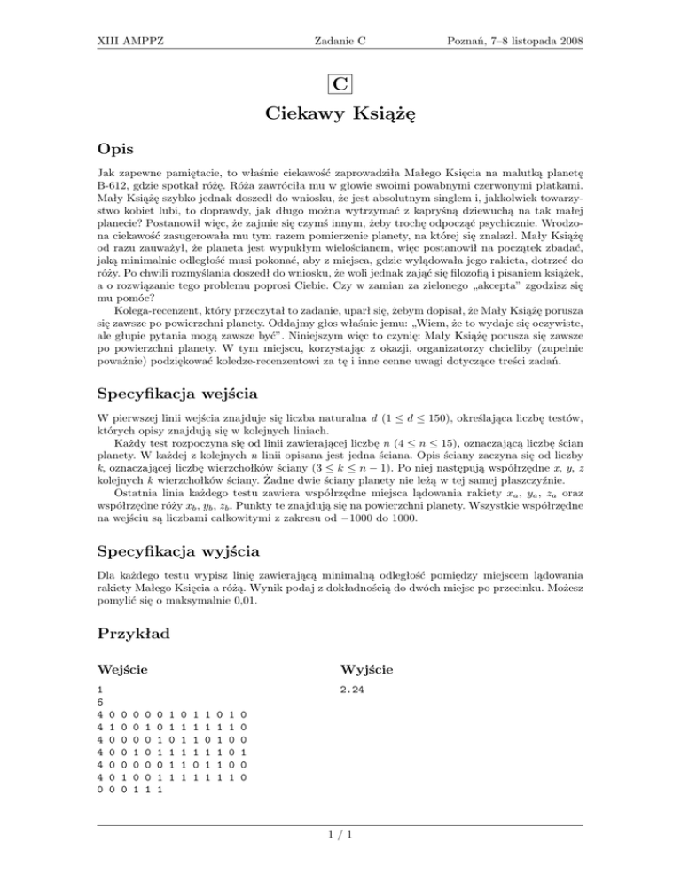 XIII AMPPZ Zadanie C Poznań, 7–8 listopada 2008 C Ciekawy Książę Opis Jak zapewne pamiętacie, to właśnie ciekawość zaprowadziła Małego Księcia na malutką planetę B-612, gdzie spotkał różę. Róża zawróciła mu w głowie swoimi powabnymi czerwonymi płatkami. Mały Książę szybko jednak doszedł do wniosku, że jest absolutnym singlem i, jakkolwiek towarzystwo kobiet lubi, to doprawdy, jak długo można wytrzymać z kapryśną dziewuchą na tak małej planecie? Postanowił więc, że zajmie się czymś innym, żeby trochę odpocząć psychicznie. Wrodzona ciekawość zasugerowała mu tym razem pomierzenie planety, na której się znalazł. Mały Książę od razu zauważył, że planeta jest wypukłym wielościanem, więc postanowił na początek zbadać, jaką minimalnie odległość musi pokonać, aby z miejsca, gdzie wylądowała jego rakieta, dotrzeć do róży. Po chwili rozmyślania doszedł do wniosku, że woli jednak zająć się filozofią i pisaniem książek, a o rozwiązanie tego problemu poprosi Ciebie. Czy w zamian za zielonego „akcepta” zgodzisz się mu pomóc? Kolega-recenzent, który przeczytał to zadanie, uparł się, żebym dopisał, że Mały Książę porusza się zawsze po powierzchni planety. Oddajmy głos właśnie jemu: „Wiem, że to wydaje się oczywiste, ale głupie pytania mogą zawsze być”. Niniejszym więc to czynię: Mały Książę porusza się zawsze po powierzchni planety. W tym miejscu, korzystając z okazji, organizatorzy chcieliby (zupełnie poważnie) podziękować koledze-recenzentowi za tę i inne cenne uwagi dotyczące treści zadań. Specyfikacja wejścia W pierwszej linii wejścia znajduje się liczba naturalna d (1 ≤ d ≤ 150), określająca liczbę testów, których opisy znajdują się w kolejnych liniach. Każdy test rozpoczyna się od linii zawierającej liczbę n (4 ≤ n ≤ 15), oznaczającą liczbę ścian planety. W każdej z kolejnych n linii opisana jest jedna ściana. Opis ściany zaczyna się od liczby k, oznaczającej liczbę wierzchołków ściany (3 ≤ k ≤ n − 1). Po niej następują współrzędne x, y, z kolejnych k wierzchołków ściany. Żadne dwie ściany planety nie leżą w tej samej płaszczyźnie. Ostatnia linia każdego testu zawiera współrzędne miejsca lądowania rakiety xa , ya , za oraz współrzędne róży xb , yb , zb . Punkty te znajdują się na powierzchni planety. Wszystkie współrzędne na wejściu są liczbami całkowitymi z zakresu od −1000 do 1000. Specyfikacja wyjścia Dla każdego testu wypisz linię zawierającą minimalną odległość pomiędzy miejscem lądowania rakiety Małego Księcia a różą. Wynik podaj z dokładnością do dwóch miejsc po przecinku. Możesz pomylić się o maksymalnie 0,01. Przykład Wejście Wyjście 1 6 4 4 4 4 4 4 0 2.24 0 1 0 0 0 0 0 0 0 0 0 0 1 0 0 0 0 1 0 0 1 0 1 0 0 0 0 1 0 0 1 1 0 1 1 1 1 0 1 1 1 0 1 1 1 1 1 1 1 1 1 0 1 1 1 0 1 1 1 0 1 1 1 1 1 1 1 0 0 0 1 0 0 0 1 0 0 1/1