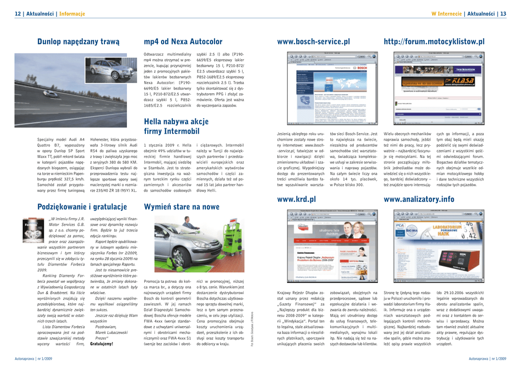 12 | AktualnoÊci | Informacje W Internecie | AktualnoÊci | 13 Dunlop nap´dzany trawà mp4 od Nexa Autocolor Odtwarzacz multimedialny mp4 mo˝na otrzymaç w prezencie, kupujàc przynajmniej jeden z promocyjnych pakietów lakierów bezbarwnych Nexa Autocolor: [P1906690/E5 lakier bezbarwny 15 l, P210-872/E2.5 utwardzacz szybki 5 l, P8521685/E2.5 rozcieƒczalnik Hohenester, która przystosowa∏a 3-litrowy silnik Audi RS4 do paliwa uzyskanego z trawy i zwi´kszy∏a jego moc z seryjnych 380 do 580 KM. Eksperci Dunlopa wybrali do przeprowadzenia testu najlepsze sportowe opony swej macierzystej marki o rozmiarze 235/40 ZR 18 (95Y) XL. 1 stycznia 2009 r. Hella obejmie 49% udzia∏ów w tureckiej firmie handlowej Intermobil, majàcej siedzib´ w Stambule. Jest to strategiczna inwestycja na wa˝nym tureckim rynku cz´Êci zamiennych i akcesoriów do samochodów osobowych http://forum.motocyklistow.pl Jesienià ubieg∏ego roku uruchomione zosta∏y nowe strony internetowe: www.bosch-service.pl, ∏atwiejsze w odbiorze i nawigacji dzi´ki zmienionemu uk∏adowi i szacie graficznej. Wygodniejszy dost´p do prezentowanych treÊci umo˝liwia bardzo ∏atwe wyszukiwanie warszta- Wielu obecnych mechaników naprawia samochody, jeêdzi te˝ nimi do pracy, lecz prywatnie – najbardziej fascynuje si´ motocyklami. Na tej stronie poczàtkujàcy mi∏oÊnik jednoÊladów mo˝e dowiedzieç si´ o nich wszystkiego, bardziej doÊwiadczony – te˝ znajdzie sporo interesujà- szybki 2.5 l] albo [P1906659/E5 ekspresowy lakier bezbarwny 15 l, P210-872/ E2.5 utwardzacz szybki 5 l, P852-1689/E2.5 ekspresowy rozcieƒczalnik 2.5 l]. Trzeba tylko skontaktowaç si´ z dystrybutorem PPG i z∏o˝yç zamówienie. Oferta jest wa˝na do wyczerpania zapasów. Hella nabywa akcje firmy Intermobil Specjalny model Audi A4 Quattro B7, wyposa˝ony w opony Dunlop SP Sport Maxx TT, pobi∏ rekord Êwiata w kategorii pojazdów nap´dzanych biogazem, osiàgajàc na torze w niemieckim Papenburgu pr´dkoÊç 327,5 km/h. Samochód zosta∏ przygotowany przez firm´ tuningowà www.bosch-service.pl i ci´˝arowych. Intermobil nale˝y w Turcji do najwi´kszych partnerów i przedstawicieli europejskich oraz amerykaƒskich wytwórców samochodów i cz´Êci zamiennych, dzia∏a te˝ od ponad 15 lat jako partner handlowy Helli. tów sieci Bosch-Service. Jest to najwi´ksza na Êwiecie, niezale˝na od producentów samochodów sieç warsztatowa, Êwiadczàca kompleksowe us∏ugi w zakresie serwisowania i naprawy pojazdów. Na ca∏ym Êwiecie liczy ona oko∏o 14 tys. placówek, w Polsce blisko 300. Podzi´kowanie i gratulacje Wymieƒ stare na nowe „W imieniu firmy J.R. Motor Services G.B. sp. z o.o. chcemy podzi´kowaç za pomoc, prace oraz zaanga˝owanie wszystkim partnerom biznesowym i tym którzy przeczynili si´ w zdobyciu tytu∏u Diamentów Forbes'a 2009. Ranking Diamenty Forbes'a powsta∏ we wspó∏pracy z Wywiadownià Gospodarczà Dun & Bradstreet. Na liÊcie wyró˝nionych znajdujà si´ przedsi´biorstwa, które najbardziej dynamicznie zwi´ksza∏y swojà wartoÊç w ostatnich trzech latach. Lista Diamentow Forbes'a opracowywana jest na podstawie szwajcarskiej metody wyceny wartoÊci firm, Promocja ta potrwa do koƒca marca br., a dotyczy ona najnowszych urzàdzeƒ firmy Bosch do kontroli geometrii zawieszeƒ. W jej ramach Dzia∏ Diagnostyki Samochodowej Boscha oferuje modele FWA 4xxx (wersje standardowe z uchwytami uniwersalnymi i obrotnicami mechanicznymi) oraz FWA 4xxx S1 (wersje bez zacisków i obrot- Autonaprawa | nr 1/2009 uwzgl´dniajàcej wyniki finansowe oraz dynamik´ rozwoju firm. B´dzie to ju˝ trzecia edycja rankingu. Raport b´dzie opublikowany w lutowym wydaniu miesi´cznika Forbes (nr 2/2009, na rynku 28 stycznia 2009) na ∏amach specjalnego Raportu. Jest to niesamowicie presti˝owe wyró˝nienie które potwierdza, ˝e zmiany dokonane w ostatnich latach by∏y w∏aÊciwe. Dzi´ki naszemu wspólnemu wysi∏kowi osiàgneliÊmy ten sukces. Jeszcze raz dzi´kuj´ Wam wszystkim Pozdrawiam, Marek Lubaczewski Prezes” Gratulujemy! nic) w promocyjnej, ni˝szej o 8 tys. cenie. Warunkiem jest dostarczenie dystrybutorowi Boscha dotychczas u˝ytkowanego sprz´tu dowolnej marki, lecz o tym samym przeznaczeniu, w celu jego utylizacji. Cena promocyjna obejmuje koszty uruchomienia urzàdzeƒ, przeszkolenie z ich obs∏ugi oraz koszty transportu do odbiorcy w kraju. Fot. Bosch, Goodyear, J.R.Motors www.krd.pl Krajowy Rejestr D∏ugów zosta∏ uznany przez redakcj´ „Gazety Finansowej” za „Najlepszy produkt dla biznesu 2008-2009” w kategorii „Windykacja”. Portal ten to legalna, stale aktualizowana baza informacji o niesolidnych p∏atnikach, uporczywie unikajàcych p∏acenia swoich cych go informacji, a poza tym obaj b´dà mieli okazj´ podzieliç si´ swymi doÊwiadczeniami z wszystkimi goÊçmi odwiedzajàcymi forum. Bogactwo dzia∏ów tematycznych obejmuje wszelkie odmian motocyklowego hobby i dane techniczne wszystkich rodzajów tych pojazdów. www.analizatory.info zobowiàzaƒ, oboj´tnych na przedprocesowe, sàdowe lub egzekucyjne dzia∏ania i wezwania do zwrotu nale˝noÊci. Majà oni utrudniony dost´p do us∏ug finansowych, telekomunikacyjnych i multimedialnych, wynajmu lokali itp. Nie nadajà si´ te˝ na naszych dostawców lub klientów. Stron´ t´ (jedynà tego rodzaju w Polsce) uruchomi∏o i prowadzi laboratorium firmy Haik. Informuje ona o urzàdzeniach warsztatowych podlegajàcych kontroli metrologicznej. Najbardziej rozbudowany jest jej dzia∏ analizatorów spalin, gdzie mo˝na znaleêç opisy prawie wszystkich (do 29.10.2006 wszystkich) legalnie wprowadzanych do obrotu analizatorów spalin, wraz z dodatkowymi uwagami oraz z kontaktem do serwisu i sprzedawcy. Mo˝na tam równie˝ znaleêç aktualne akty prawne, regulujàce dystrybucj´ i u˝ytkowanie tych urzàdzeƒ. Autonaprawa | nr 1/2009