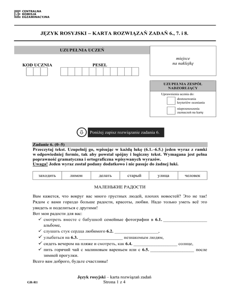 JĘZYK ROSYJSKI KARTA ROZWIĄZAŃ ZADAŃ 6., 7. i 8. UZUPEŁNIA UCZEŃ KOD UCZNIA miejsce na naklejkę PESEL UZUPEŁNIA ZESPÓŁ NADZORUJĄCY Uprawnienia ucznia do: dostosowania kryteriów oceniania nieprzenoszenia zaznaczeń na kartę Poniżej zapisz rozwiązanie zadania 6. Zadanie 6. (0–5) Przeczytaj tekst. Uzupełnij go, wpisując w każdą lukę (6.1.–6.5.) jeden wyraz z ramki w odpowiedniej formie, tak aby powstał spójny i logiczny tekst. Wymagana jest pełna poprawność gramatyczna i ortograficzna wpisywanych wyrazów. Uwaga! Jeden wyraz został podany dodatkowo i nie pasuje do żadnej luki. заходить лимон делать старый улица человек МАЛЕНЬКИЕ РАДОСТИ Вам кажется, что вокруг вас много грустных людей, плохих новостей? Это не так! Рядом с вами гораздо больше радости, красоты, любви. Надо только уметь всё это увидеть и поделиться с другими! Вот мои радости для вас: смотреть вместе с бабушкой семейные фотографии в 6.1. ___________________ альбоме, слушать стук сердца любимого 6.2. ___________________, улыбаться на 6.3. ___________________ незнакомым людям, сидеть вечером на пляже и смотреть, как 6.4. ___________________ солнце, пить горячий чай с малиновым вареньем или с 6.5. ___________________ после зимней прогулки. Всего вам доброго, будьте счастливы! GR-R1 Język rosyjski – karta rozwiązań zadań Strona 1 z 4 Poniżej zapisz rozwiązanie zadania 7. Zadanie 7. (0–5) Przetłumacz na język rosyjski podane w nawiasach fragmenty, tak aby otrzymać logiczne i gramatycznie poprawne zdania. Wymagana jest pełna poprawność ortograficzna wpisywanych fragmentów zdań. 7.1. (Ty masz) __________________________________________________________ брат? 7.2. Скажите, пожалуйста, (która godzina) ______________________________________? 7.3. Мы решили встретиться (po obiedzie) ______________________________________. 7.4. Я (byłem w parku) ________________________________________. Там так здорово! 7.5. Давай познакомимся, (mam na imię) __________________________________ Антон. Rozwiązanie zadania 8. zapisz na następnej stronie. Zadanie 8. (0–10) Rozpocząłeś/Rozpoczęłaś naukę w nowej szkole. W e-mailu do kolegi/koleżanki z Rosji: wyjaśnij, dlaczego wybrałeś(-aś) właśnie tę szkołę opisz salę lekcyjną, która najbardziej Ci się podoba zrelacjonuj wydarzenie, które miało miejsce w szkole w pierwszym dniu nauki. Podpisz się jako XYZ. Rozwiń swoją wypowiedź w każdym z trzech podpunktów, pamiętając, że długość e-maila powinna wynosić od 50 do 100 słów. Oceniana jest umiejętność pełnego przekazania informacji, spójność, bogactwo językowe oraz poprawność językowa. Język rosyjski – karta rozwiązań zadań Strona 2 z 4 GR-R1 CZYSTOPIS Новое письмо От кого: [email protected] Кому: [email protected] Тема: Привет! ………………………………………………………………………………………… ………………………………………………………………………………………… ………………………………………………………………………………………… ………………………………………………………………………………………… ………………………………………………………………………………………… ………………………………………………………………………………………… ………………………………………………………………………………………… ………………………………………………………………………………………… ………………………………………………………………………………………… ………………………………………………………………………………………… ………………………………………………………………………………………… ………………………………………………………………………………………… ………………………………………………………………………………………… ………………………………………………………………………………………… ………………………………………………………………………………………… …………………………………………………………………………………………. treść liczba punktów GR-R1 0 1 2 3 4 spójność i logika wypowiedzi zakres środków językowych poprawność środków językowych 0 0 0 1 2 1 2 Język rosyjski – karta rozwiązań zadań Strona 3 z 4 1 2 RAZEM BRUDNOPIS (nie podlega ocenie) Język rosyjski – karta rozwiązań zadań Strona 4 z 4 GR-R1
