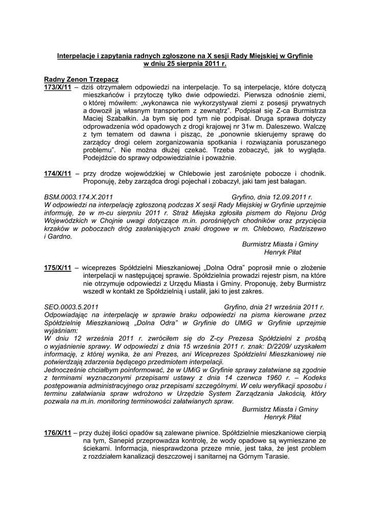 Interpelacje i zapytania radnych zgłoszone na X sesji Rady Miejskiej w Gryfinie w dniu 25 sierpnia 2011 r. Radny Zenon Trzepacz 173/X/11 – dziś otrzymałem odpowiedzi na interpelacje. To są interpelacje, które dotyczą mieszkańców i przytoczę tylko dwie odpowiedzi. Pierwsza odnośnie ziemi, o której mówiłem: „wykonawca nie wykorzystywał ziemi z posesji prywatnych a dowoził ją własnym transportem z zewnątrz”. Podpisał się Z-ca Burmistrza Maciej Szabałkin. Ja bym się pod tym nie podpisał. Druga sprawa dotyczy odprowadzenia wód opadowych z drogi krajowej nr 31w m. Daleszewo. Walczę z tym tematem od dawna i pisząc, że „ponownie skierujemy sprawę do zarządcy drogi celem zorganizowania spotkania i rozwiązania poruszanego problemu”. Nie można dłużej czekać. Trzeba zobaczyć, jak to wygląda. Podejdźcie do sprawy odpowiedzialnie i poważnie. 174/X/11 – przy drodze wojewódzkiej w Chlebowie jest zarośnięte pobocze i chodnik. Proponuję, żeby zarządca drogi pojechał i zobaczył, jaki tam jest bałagan. BSM.0003.174.X.2011 Gryfino, dnia 12.09.2011 r. W odpowiedzi na interpelację zgłoszoną podczas X sesji Rady Miejskiej w Gryfinie uprzejmie informuję, że w m-cu sierpniu 2011 r. Straż Miejska zgłosiła pismem do Rejonu Dróg Wojewódzkich w Chojnie uwagi dotyczące m.in. porośniętych chodników oraz przycięcia krzaków w poboczach dróg zasłaniających znaki drogowe w m. Chlebowo, Radziszewo i Gardno. Burmistrz Miasta i Gminy Henryk Piłat 175/X/11 – wiceprezes Spółdzielni Mieszkaniowej „Dolna Odra” poprosił mnie o złożenie interpelacji w następującej sprawie. Spółdzielnia prowadzi rejestr pism, na które nie otrzymuje odpowiedzi z Urzędu Miasta i Gminy. Proponuję, żeby Burmistrz wszedł w kontakt ze Spółdzielnią i ustalił, jaki to jest zakres. SEO.0003.5.2011 Gryfino, dnia 21 września 2011 r. Odpowiadając na interpelację w sprawie braku odpowiedzi na pisma kierowane przez Spółdzielnię Mieszkaniową „Dolna Odra” w Gryfinie do UMiG w Gryfinie uprzejmie wyjaśniam: W dniu 12 września 2011 r. zwróciłem się do Z-cy Prezesa Spółdzielni z prośbą o wyjaśnienie sprawy. W odpowiedzi z dnia 15 września 2011 r. znak: D/2209/ uzyskałem informację, z której wynika, że ani Prezes, ani Wiceprezes Spółdzielni Mieszkaniowej nie potwierdzają zdarzenia będącego przedmiotem interpelacji. Jednocześnie chciałbym poinformować, że w UMiG w Gryfinie sprawy załatwiane są zgodnie z terminami wyznaczonymi przepisami ustawy z dnia 14 czerwca 1960 r. – Kodeks postępowania administracyjnego oraz przepisami szczególnymi. W celu weryfikacji sposobu i terminu załatwiania spraw wdrożono w Urzędzie System Zarządzania Jakością, który pozwala na m.in. monitoring terminowości załatwianych spraw. Burmistrz Miasta i Gminy Henryk Piłat 176/X/11 – przy dużej ilości opadów są zalewane piwnice. Spółdzielnie mieszkaniowe cierpią na tym, Sanepid przeprowadza kontrolę, że wody opadowe są wymieszane ze ściekami. Informacja, niesprawdzona przeze mnie, jest taka, że jest problem z rozdziałem kanalizacji deszczowej i sanitarnej na Górnym Tarasie. 177/X/11 – w ostatnim czasie w Szkole Podstawowej Nr 2 nasila się ilość zdarzeń agresywnych, łącznie z tym, że został ostrzelany z wiatrówki budynek, że strzelano do pracownika ochrony, który był w jednym z pomieszczeń. Widok osoby „dającej sobie w żyłę” – nie wiem, jak się to nazywa w tej chwili, nie jest niestety rzadkim zjawiskiem. Zrobiono sobie z tego terenu miejsce do spożywania napojów alkoholowych. Uważam, że należy ten problem rozwiązać poprzez właściwy system wygrodzenia tego terenu. Nie mówię, żeby zamykać ten teren, ale żeby po godz. 22.00 to miejsce było wolne od różnych dziwnych zjawisk, jakie tam mają miejsce. BMP/ 177,179 /X/11 Gryfino,12.09.2011r. W odpowiedzi na interpelacje wniesione na Sesji Rady Miejskiej informuję jak niżej: Ad.177/X/11 – Podejmiemy działania ,celem rozwiązania zaistniałego problemu między innymi poprzez wzmożenie patroli Straży Miejskiej tego terenu. Jednocześnie przeanalizujemy i rozważymy możliwości dodatkowego wygrodzenia tego terenu, uniemożliwiając przebywanie na terenie szkoły osobom postronnym . O podjętych działaniach powiadomimy zainteresowanych odrębnym pismem. Burmistrz Miasta i Gminy Henryk Piłat 178/X/11 – kiedy PUK przystąpi do dalszego remontu, wymiany czy naprawy zasuw w drodze krajowej nr 31. Dysponuję wykazem, który uzgodniliśmy z pracownikiem PUK-u, niestety prace się zatrzymały, nic się dzieje, mieszkańcy są zdesperowani, czekają na podjęcie radykalnych działań. 179/X/11 – z problemem nanoszenia piachu na drogę nr 31 borykamy się od lat, nie mówię o ostatnim tragicznym wypadku, ale wcześniejszym. W m. Radziszewo naniesiona ziemia spowodowała, że samochód jadący z dużą prędkością 80 km/h zahamował, postawiło ciągnik siodłowy w poprzek i tylko cud sprawił, że został poobijany samochód, w tym czasie nikt nie przechodził chodnikiem. Ja wiem, że nie ma środków, ale jak najprędzej musimy coś z tym zrobić, bo środki, jakie wydajemy na usuwanie tego piachu, czyszczenie piaskownika i zamiatanie tych dróg, są naprawdę bardzo wysokie. Rozmawiałem z Naczelnik Wydziału Gospodarki Komunalnej, Mieszkaniowej i Ochrony Środowiska i ona również prosi Burmistrza, żeby podjąć działania, które docelowo ten problem rozwiążą. BMP/ 177,179 /X/11 Gryfino,12.09..2011r. Ad.179/X/11 – Gmina Gryfino podjęła działania związane z docelowym rozwiązaniem problemu wymywania piachu z dróg bocznych wzdłuż drogi krajowej nr 31 poprzez opracowanie projektu budowy dróg bocznych wzdłuż drogi krajowej nr 31 i realizuje to zadanie w ramach posiadanych środków budżetowych własnych i pozyskanych z Unii Europejskiej. Planuje się zabezpieczenie środków finansowych w planie budżetu na rok 2012 na realizacj