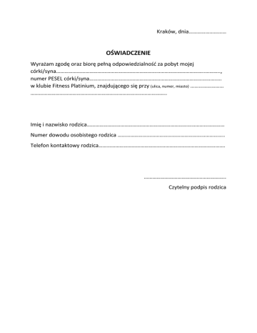 Kraków, dnia……………………… OŚWIADCZENIE Wyrażam zgodę oraz biorę pełną odpowiedzialność za pobyt mojej córki/syna……………………………………………………………………………………………..……….., numer PESEL córki/syna……………………………………………………………………………….…. w klubie Fitness Platinium, znajdującego się przy (ulica, numer, miasto) …………………… …………………………………………………………………………………….. Imię i nazwisko rodzica……………………………………………………………………………………… Numer dowodu osobistego rodzica ………………………………………………………………….. Telefon kontaktowy rodzica………………………………………………………………………………. ………………………………………………….. Czytelny podpis rodzica