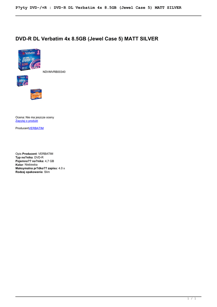 P?yty DVD-/+R : DVD-R DL Verbatim 4x 8.5GB (Jewel Case 5) MATT SILVER DVD-R DL Verbatim 4x 8.5GB (Jewel Case 5) MATT SILVER NDVMVRB00340 Ocena: Nie ma jeszcze oceny Zapytaj o produkt ProducentVERBATIM Opis Producent: VERBATIM Typ no?nika: DVD-R Pojemno?? no?nika: 4,7 GB Kolor: Niebieska Maksymalna pr?dko?? zapisu: 4.0 x Rodzaj opakowania: Slim 1 / 1 Powered by TCPDF (www.tcpdf.org)