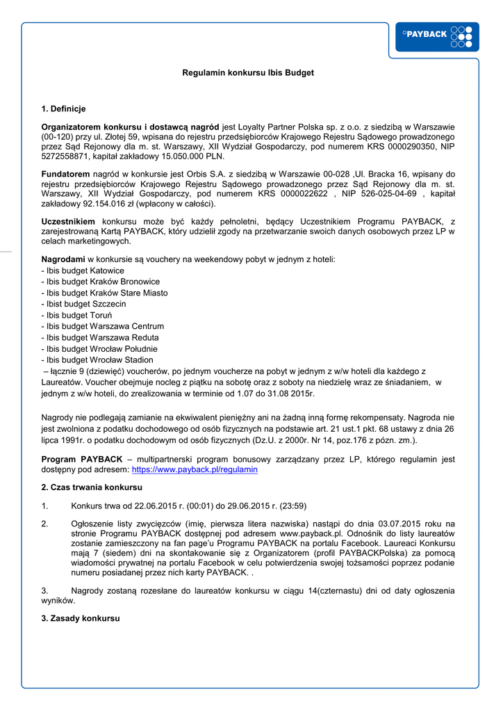 Regulamin konkursu Ibis Budget 1. Definicje Organizatorem konkursu i dostawcą nagród jest Loyalty Partner Polska sp. z o.o. z siedzibą w Warszawie (00-120) przy ul. Złotej 59, wpisana do rejestru przedsiębiorców Krajowego Rejestru Sądowego prowadzonego przez Sąd Rejonowy dla m. st. Warszawy, XII Wydział Gospodarczy, pod numerem KRS 0000290350, NIP 5272558871, kapitał zakładowy 15.050.000 PLN. Fundatorem nagród w konkursie jest Orbis S.A. z siedzibą w Warszawie 00-028 ,Ul. Bracka 16, wpisany do rejestru przedsiębiorców Krajowego Rejestru Sądowego prowadzonego przez Sąd Rejonowy dla m. st. Warszawy, XII Wydział Gospodarczy, pod numerem KRS 0000022622 , NIP 526-025-04-69 , kapitał zakładowy 92.154.016 zł (wpłacony w całości). Uczestnikiem konkursu może być każdy pełnoletni, będący Uczestnikiem Programu PAYBACK, z zarejestrowaną Kartą PAYBACK, który udzielił zgody na przetwarzanie swoich danych osobowych przez LP w celach marketingowych. Nagrodami w konkursie są vouchery na weekendowy pobyt w jednym z hoteli: - Ibis budget Katowice - Ibis budget Kraków Bronowice - Ibis budget Kraków Stare Miasto - Ibist budget Szczecin - Ibis budget Toruń - Ibis budget Warszawa Centrum - Ibis budget Warszawa Reduta - Ibis budget Wrocław Południe - Ibis budget Wrocław Stadion – łącznie 9 (dziewięć) voucherów, po jednym voucherze na pobyt w jednym z w/w hoteli dla każdego z Laureatów. Voucher obejmuje nocleg z piątku na sobotę oraz z soboty na niedzielę wraz ze śniadaniem, w jednym z w/w hoteli, do zrealizowania w terminie od 1.07 do 31.08 2015r. Nagrody nie podlegają zamianie na ekwiwalent pieniężny ani na żadną inną formę rekompensaty. Nagroda nie jest zwolniona z podatku dochodowego od osób fizycznych na podstawie art. 21 ust.1 pkt. 68 ustawy z dnia 26 lipca 1991r. o podatku dochodowym od osób fizycznych (Dz.U. z 2000r. Nr 14, poz.176 z pózn. zm.). Program PAYBACK – multipartnerski program bonusowy zarządzany przez LP, którego regulamin jest dostępny pod adresem: https://www.payback.pl/regulamin 2. Czas trwania konkursu 1. Konkurs trwa od 22.06.2015 r. (00:01) do 29.06.2015 r. (23:59) 2. Ogłoszenie listy zwycięzców (imię, pierwsza litera nazwiska) nastąpi do dnia 03.07.2015 roku na stronie Programu PAYBACK dostępnej pod adresem www.payback.pl. Odnośnik do listy laureatów zostanie zamieszczony na fan page’u Programu PAYBACK na portalu Facebook. Laureaci Konkursu mają 7 (siedem) dni na skontakowanie się z Organizatorem (profil PAYBACKPolska) za pomocą wiadomości prywatnej na portalu Facebook w celu potwierdzenia swojej tożsamości poprzez podanie numeru posiadanej przez nich karty PAYBACK. . 3. Nagrody zostaną rozesłane do laureatów konkursu w ciągu 14(czternastu) dni od daty ogłoszenia wyników. 3. Zasady konkursu 1. W czasie trwania Konkursu, na fanpage’u Programu PAYBACK na portalu Facebook dostępnej pod adresem www.facebook.com/PaybackPolska zostanie zamieszczony post z zadaniem konkursowym o treści: Odpowiedź na pytanie: Ile jest hoteli Ibis budget w Polsce ? Napisz, dlaczego chciałbyś spędzić weekend w hotelu Ibis budget? Odpowiedzi na zadanie konkursowe można udzielać za pośrednictwem fan page’u Programu PAYBACK na portalu Facebook (w komentarzu pod postem konkursowym). Każdy z uczestników może wziąć udział w Konkursie tylko jednokrotnie. Zgłoszone odpowiedzi zostaną ocenione przez komisję konkursową, składającą się z osób wybranych przez Organizatora. Komisja oceni zgłoszone odpowiedzi jako kryterium przyjmując poprawność udzielonej odpowiedzi, kreatywność Uczestników oraz unikatowość oraz prawidłowość zgłoszeń, a następnie wybierze 9 (dziewięć) najlepszych odpowiedzi spośród Uczestników, którzy odpowiedzieli na pytanie. Każdemu spośród laureatów zostanie przyznana 1 (jedna) Nagroda w postaci 1 (jednego) vouchera na weekendowy pobyt w wybranym przez Organizatora hotelu. Decyzja co do wyboru hotelu jest wyłączną decyzją Organizatora. Uczestnik ma prawo do zrealizowania vouchera w wybranym przez siebie terminie w dniach od 1.07 do 31.08 2015r. 3. Laureaci Konkursu mają 7 (siedem) dni na skontakowanie się z Organizatorem (profil: PAYBACKPolska) za pomocą wiadomości prywatnej na portalu Facebook w celu potwierdzenia swojej tożsamości poprzez podanie numeru posiadanej przez nich karty PAYBACK W przypadku niespełnienia przez Laureata obowiązku, o którym mowa w zdaniu poprzednim lub niemożliwości wydania Nagrody spowodowanej nieprawdziwością danych identyfikacyjnych, ustalanych na podstawie informacji podanych w formularzu zgłoszeniowym do Konkursu z danymi znajdującymi się w bazie danych Programu PAYBACK (uprzednio podanych przez Uczestnika w procesie rejestracji do Programu PAYBACK), co uniemożliwia ustalenie tożsamości Uczestnika, Organizator przyzna Nagrodę kolejnemu co do wysokości punktacji przyznanej przez Komisję Uczestnikowi i w tym celu skontaktuje się za pomocą portalu Facebook z danym Laureatem. 4. Czas przyjęcia odpowiedzi (data dzienna i godzina) rozstrzygany jest zgodnie z rejestracją odpowiedzi w systemie informatycznym Organizatora. Organizator zobowiązuje się dochować należytej staranności, nie odpowiada jednak za niezależne od niego zakłócenia pracy infrastruktury technicznej wykorzystywanej do zgłaszania odpowiedzi. 5. Udzielenie odpowiedzi na pytanie konkursowe jest równoznaczne z akceptacją niniejszego Regulaminu oraz udzieleniem na rzecz Organizatora niewyłącznej, nieodpłatnej, nieograniczonej terytorialnie ani czasowo licencji na komercyjne posługiwanie się udzielonymi na pytanie konkursowe odpowiedziami na następujących polach eksploatacji: utrwalanie, powielanie (bez ograniczeń dotyczących liczby kopii ani nośników danych), wprowadzenie do pamięci komputerów, sieci (zewnętrznych lub wewnętrznych, w tym sieci Internet), publiczne prezentowanie lub udostępnienie (odpłatne lub wolne od op