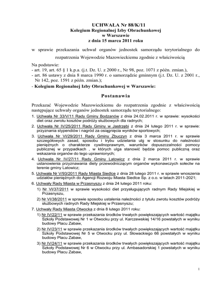 UCHWAŁA Nr 88/K/11 Kolegium Regionalnej Izby Obrachunkowej w Warszawie z dnia 15 marca 2011 roku w sprawie przekazania uchwał organów jednostek samorządu terytorialnego do rozpatrzenia Wojewodzie Mazowieckiemu zgodnie z właściwością Na podstawie: - art. 19, art. 65 § 1 k.p.a. (j.t. Dz. U. z 2000 r., Nr 98, poz. 1071 z późn. zmian.), - art. 86 ustawy z dnia 8 marca 1990 r. o samorządzie gminnym (j.t. Dz. U. z 2001 r., Nr 142, poz. 1591 z późn. zmian.); - Kolegium Regionalnej Izby Obrachunkowej w Warszawie: Postanawia Przekazać Wojewodzie Mazowieckiemu do rozpatrzenia zgodnie z właściwością następujące uchwały organów jednostek samorządu terytorialnego: 1. Uchwała Nr 33/V/11 Rady Gminy Bodzanów z dnia 24.02.2011 r. w sprawie: wysokości diet oraz zwrotu kosztów podróży służbowych dla radnych; 2. Uchwała Nr IV/25/2011 Rady Gminy w Jastrzębi z dnia 24 lutego 2011 r. w sprawie: przyznania stypendiów i nagród za osiągnięcia wyników sportowych; 3. Uchwała Nr VI/29/2011 Rady Gminy Zbuczyn z dnia 3 marca 2011 r. w sprawie szczegółowych zasad, sposobu i trybu udzielania ulg w stosunku do należności pieniężnych o charakterze cywilnoprawnym, warunków dopuszczalności pomocy publicznej w przypadkach , w których ulga stanowić będzie pomoc publiczną oraz wskazania organów do tego uprawnionych; 4. Uchwała Nr IV/27/11 Rady Gminy Latowicz z dnia 2 marca 2011 r. w sprawie ustanowienia przyznawania diety przewodniczącym organów wykonawczych sołectw na terenie gminy Latowicz; 5. Uchwała Nr V/93/2011 Rady Miasta Siedlce z dnia 28 lutego 2011 r. w sprawie wnoszenia udziałów pieniężnych do Agencji Rozwoju Miasta Siedlce Sp. z o.o. w latach 2011-2021; 6. Uchwały Rady Miasta w Przasnyszu z dnia 24 lutego 2011 roku: 1) Nr VI/37/2011 w sprawie wysokości diet przysługujących radnym Rady Miejskiej w Przasnyszu, 2) Nr VI/38/2011 w sprawie sposobu ustalenia należności z tytułu zwrotu kosztów podróży służbowych radnych Rady Miejskiej w Przasnyszu; 7. Uchwały Rady Miasta Otwocka z dnia 8 lutego 2011 roku: 1) Nr IV/22/11 w sprawie przekazania środków trwałych powiększających wartość majątku Szkoły Podstawowej Nr 1 w Otwocku przy ul. Karczewskiej 14/16 powstałych w wyniku budowy Placu Zabaw, 2) Nr IV/23/11 w sprawie przekazania środków trwałych powiększających wartość majątku Szkoły Podstawowej Nr 5 w Otwocku przy ul. Słowackiego 66 powstałych w wyniku budowy Placu Zabaw, 3) Nr IV/24/11 w sprawie przekazania środków trwałych powiększających wartość majątku Szkoły Podstawowej Nr 6 w Otwocku przy ul. Ambasadorskiej 1 powstałych w wyniku budowy Placu Zabaw, 1 4) Nr IV/25/11 w sprawie przekazania środków trwałych powiększających wartość majątku Szkoły Podstawowej Nr 8 w Otwocku przy ul. Żeromskiego 235 powstałych w wyniku budowy Placu Zabaw, 5) Nr IV/26/11 w sprawie przekazania środków trwałych powiększających wartość majątku Szkoły Podstawowej Nr 9 w Otwocku przy ul. Narutowicza 275 powstałych w wyniku budowy Placu Zabaw, 6) Nr IV/27/11 w sprawie przekazania środków trwałych powiększających wartość majątku Szkoły Podstawowej Nr 12 w Otwocku przy ul. Andriollego 76 powstałych w wyniku budowy Placu Zabaw; 8. Uchwała Nr 61/V/2011 Rady Miejskiej w Piasecznie z dnia 24.02.2011 r. w sprawie określenia szczegółowego sposobu konsultacji z organizacjami pozarządowymi i podmiotami wymienionymi w art. 3 ust. 3 ustawy z dnia 24 kwietnia 203 r. o działalności pożytku publicznego i o wolontariacie projektów aktów prawa miejscowego Gminy Piaseczno w dziedzinie dotyczącej działalności statutowej tych organizacji; 9. Uchwała Nr VI/34/2011 Rady Miejskiej w Karczewie z dnia 17 lutego 2011 roku w sprawie udziału w kosztach funkcjonowania SKM w 2011; 10. Uchwała Nr III-9/2011 Rady Miejskiej w Wołominie z dnia 2 lutego 2011 roku w sprawie zmiany Uchwały Nr XXXIV-147/09 RM w Wołominie z dnia 17 grudnia 2009 roku w sprawie zmiany uchwały Nr X-134/07 z dnia 30 sierpnia 2007 roku. UZASADNIENIE Na posiedzeniu w dniu 15 marca 2011 roku Kolegium Regionalnej Izby Obrachunkowej w Warszawie uznało, że wymienione wyżej uchwały podlegają nadzorowi Wojewody Mazowieckiemu z uwagi na to, że nie dotyczą spraw finansowych, o których mowa w art. 11 ust. 1 pkt 1-6 ustawy z dnia 7 października 1992 roku o regionalnych izbach obrachunkowych. Mając powyższe na uwadze na podstawie art. 19 i art. 65 § 1 k.p.a., art. 86 ustawy o samorządzie gminnym Kolegium postanowiło przekazać w/w uchwały Wojewodzie Mazowieckiemu do rozpatrzenia zgodnie z właściwością. Na niniejsze postanowienie przysługuje zażalenie do Ministra Spraw Wewnętrznych i Administracji w terminie 7 dni od doręczenia uchwały Kolegium RIO w Warszawie. Przewodniczący Kolegium Wojciech Balcerzak 2