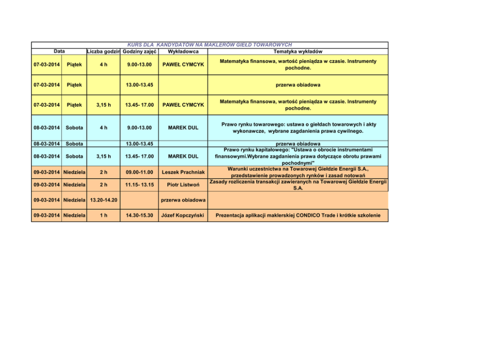 KURS DLA KANDYDATÓW NA MAKLERÓW GIEŁD TOWAROWYCH Liczba godzin Godziny zajęć Wykładowca Tematyka wykładów Data 4h 9.00-13.00 Piątek 07-03-2014 Piątek 07-03-2014 Piątek 3,15 h 13.45- 17.00 PAWEŁ CYMCYK Matematyka finansowa, wartość pieniądza w czasie. Instrumenty pochodne. 08-03-2014 Sobota 4h 9.00-13.00 MAREK DUL Prawo rynku towarowego: ustawa o giełdach towarowych i akty wykonawcze, wybrane zagdanienia prawa cywilnego. 08-03-2014 Sobota 08-03-2014 Sobota 13.00-13.45 13.00-13.45 3,15 h 13.45- 17.00 09-03-2014 Niedziela 2h 09.00-11.00 09-03-2014 Niedziela 2h 11.15- 13.15 09-03-2014 Niedziela 13.20-14.20 09-03-2014 Niedziela PAWEŁ CYMCYK Matematyka finansowa, wartość pieniądza w czasie. Instrumenty pochodne. 07-03-2014 1h przerwa obiadowa przerwa obiadowa Prawo rynku kapitałowego: "Ustawa o obrocie instrumentami MAREK DUL finansowymi.Wybrane zagdanienia prawa dotyczące obrotu prawami pochodnymi" Warunki uczestnictwa na Towarowej Giełdzie Energii S.A., Leszek Prachniak przedstawienie prowadzonych rynków i zasad notowań Zasady rozliczenia transakcji zawieranych na Towarowej Giełdzie Energii Piotr Listwoń S.A. przerwa obiadowa 14.30-15.30 Józef Kopczyński Prezentacja aplikacji maklerskiej CONDICO Trade i krótkie szkolenie