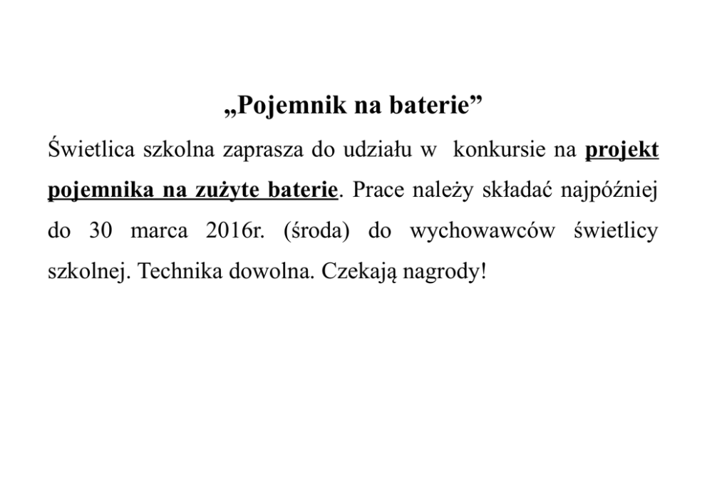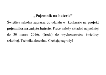 „Pojemnik na baterie” Świetlica szkolna zaprasza do udziału w konkursie na projekt pojemnika na zużyte baterie. Prace należy składać najpóźniej do 30 marca 2016r. (środa) do wychowawców świetlicy szkolnej. Technika dowolna. Czekają nagrody!