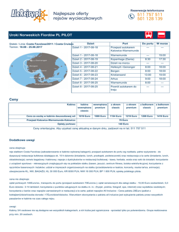 Uroki Norweskich Fiordów PL PILOT Dzień Statek / Linia: Costa Favolosa/2011 / Costa Cruises Termin: 18.08 - 25.08.2017 Dzień 1 - 2017-08-18 Port Do portu W morze Przejazd autokarem Katowice-Warnemunde --- --- Dzień 1 - 2017-08-18 Warnemunde --- 19:00 Dzień 2 - 2017-08-19 Kopenhaga (Dania) 8:30 17:30 Dzień 3 - 2017-08-20 Dzień na morzu Dzień 4 - 2017-08-21 Hellesylt i Geiranger Dzień 5 - 2017-08-22 Dzień 6 - 2017-08-23 --- --- 8:00 18:00 Bergen 8:00 18:00 Kristiansand 13:00 19:00 Dzień 7 - 2017-08-24 Arhus 9:00 18:00 Dzień 8 - 2017-08-25 Warnemunde 8:00 --- Dzień 8 - 2017-08-25 Powrót autokarem do kraju --- --- Ceny Kabina: Cena za osobę w kabinie dwuosobowej od: kabina wewnętrzna wewnętrzna premium classic 1019 Euro 1089 Euro z oknem classic z oknem premium z balkonem classic z balkonem premium 1154 Euro 1219 Euro 1289 Euro 1419 Euro Przejazd Katowice-Warnemunde-Katowice: 70 Euro Opłaty portowe: 140 Euro Ceny orientacyjne. Aby uzyskać cenę aktualną w danym dniu, zadzwoń na nr tel. 511 757 511 Dodatkowe uwagi cena obejmuje: rejs statkiem Costa Favolosa (zakwaterowanie w kabinie wybranej kategorii); przejazd autokarem do portu wg rozkładu; pełne wyżywienie - do dyspozycji restauracja bufetowa działająca ok. 10 h dziennie (śniadanie, lunch, przekąski, podwieczorek) oraz restauracja a la carte (śniadanie, lunch, obiadokolacja); serwis bagażowy i kabinowy; napoje z dystrybutorów w restauracji bufetowej - kawa, herbata, woda oraz soki do śniadań; korzystanie z urządzeń sportowo - rekreacyjnych znajdujących się na pokładzie statku (basen, jacuzzi, centrum fitness, boiska wielofunkcyjne); korzystanie z ręczników basenowych i leżaków; udział w imprezach organizowanych na statku (przedstawienia w teatrze, koncerty, nauka tańca, animacje); ubezpieczenie KL, NW, BAGAŻU; KL 30 000 Euro, KR 6000 PLN, NWI 16 000 PLN, BP 1 800 PLN; opiekę polskiego pilota. cena nie obejmuje: opłat portowych 140Euro/os.; transportu do portu (przejazd autokarem 70Euro/os.); opłat serwisowych dla załogi statku - 10,00 Euro osoba/dzień, 5,0 Euro dziecko 3-14 lat/dzień; korzystania z punktów usługowych na statku m. in.: (fryzjer, pralnia, fotograf, spa, internet) oraz wydatków osobistych; korzystania z barów oraz napojów zamawianych w restauracji a la carte; pakiet napojów All Inclusive - Cena pakietu 29Euro (pakiet z koktajlami)/dzień/osoba dorosła i 17Euro/dzień/dziecko. Warunkiem skorzystania z pakietu all inclusive jest wykupienie pakietu przez wszystkich pasażerów w kabinie na czas całego rejsu. uwagi: Kabiny 3/4 osobowe nie są dostępne we wszystkich kategoriach, a ich liczba jest ograniczona - sprzedaż tylko po potwierdzeniu. Grupa realizowana przy min. 20 osobach. Przejazd autokarem: W przypadku oferty przejazdu autokarem wyjazd następuje z Katowic dzień wcześniej, natomiast przyjazd do Katowic dzień później. Wyjątek stanowią rejsy z portów: Hamburg, Warnemunde i Kilonia, przy których wyjazd i powrót do kraju są dokładnie dniem rozpoczęcia i zakończenia rejsu. Dla chętnych możliwość skorzystania z antenek do miejsca wyjazdu autokaru: z Krakowa 25Euro/osoba/dwie strony z Wrocławia 30Euro/osoba/dwie strony Kategoria Classic - kabiny usytuowane na niższych pokładach. Możliwość zamówienia do kabiny śniadania za dopłatą. Kategoria Premium - kabiny usytuowane na wyższych pokładach, - bezpłatne śniadanie kontynentalne do kabiny, - możliwość wyboru tury kolacji oraz restauracji. Kabina FLEX: wewnętrzna FLEX, okno FLEX, balkon FLEX Kabina, której położenie (pokład), numer oraz typ (bella, fantastica - dla linii MSC Cruises; classic, premium - dla linii Costa Cruises) podane są w momencie wystawienia dokumentów podróży. PROGRAM REJSU Z POLSKIM PILOTEM Propozycja Wycieczek Fakultatywnych Uroki Norweskich Fiordów - Statek Costa Favolosa Dokładny program wycieczek z cenami zostanie przesłany uczestnikom na siedem dni przed rejsem. Szczegółowy program wycieczek oraz cena uzależnione są od ilości uczestników oraz ilości czasu jaką statek spędza w danym porcie. Aby poszczególne wycieczki zostały zrealizowane, wymagana jest minimalna ilość uczestników określona dla każdej wycieczki. 1.Dzień - PRZEJAZD KATOWICE - WARNEMUNDE 1.Dzień - PORT WARNEMUNDE NIEMCY Zaokrętowanie 2.Dzień - PORT KOPENHAGA DANIA Proponowana wycieczka: KOPENHAGA - ZWIEDZANIE MIASTA I REJS ŁODZIĄ PO KANAŁACH KOPENHAGI W pierwszej części wycieczki (z lokalnym polskojęzycznym przewodnikiem) będziemy zwiedzać miasto autokarem, zatrzymując się przy najważniejszych jego miejscach m. in.: pałace królewskie, ratusz, pomnik małej syrenki z baśni Andersena, katedra oraz stare miasto. W drugiej części naszej wycieczki popłyniemy łodzią w ponad godzinny rejs po kanałach stolicy Danii i zobaczymy tym razem miasto od strony wody. Po rejsie będzie czas wolny na spacer głównym deptakiem miasta z licznymi atrakcjami i muzeami. Będzie również okazja aby skosztować lokalnego przysmaku jakim jest śledź przyrządzany na kilkanaście sposobów. Po czasie wolnym powrót do portu. Czas około 7h Cena około 50Euro / Dzieci 35Euro 3.Dzień - NA MORZU Wypoczynek i korzystanie z atrakcji oferowanych przez statek 4.Dzień - PORT GEIRANGER NORWEGIA Proponowana wycieczka: GEIRANGER - PANORAMICZNA WYCIECZKA DROGĄ ORŁÓW ORAZ GÓRA DALSNIBA Miejscowość Geiranger leży na końcu Geirangerfjorden, uznawanego za najładniejszy fiord w Norwegii, wpisany na listę UNESCO. Po przepłynięciu przez Fiord udamy się łodziami na brzeg do wioski Geiranger. Z portu pojedziemy autokarem fragmentem słynnej Drogi Orłów a następnie wyjedziemy na górę Dalsniba (1476m). Zatrzymamy się na punktach widokowych aby podziwiać panoramę na Fiord Geiranger oraz sąsiednie góry i jeziora. Przejazd na górę jest bardzo malowniczy a uroku dodaje mu fakt, że w czerwcu nadal może leżeć tam sporo śniegu. Po wycieczce będzie czas wolny w wiosce
