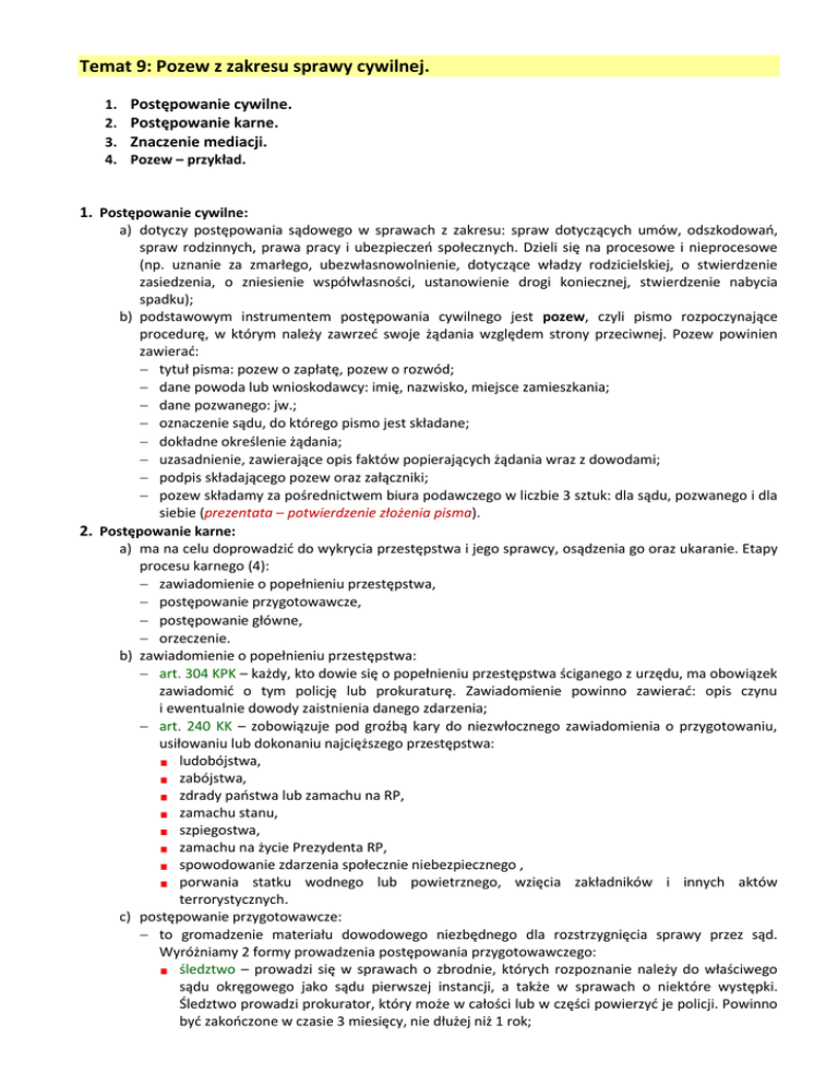 Temat 9: Pozew z zakresu sprawy cywilnej. 1. 2. 3. 4. Postępowanie cywilne. Postępowanie karne. Znaczenie mediacji. Pozew – przykład. 1. Postępowanie cywilne: a) dotyczy postępowania sądowego w sprawach z zakresu: spraw dotyczących umów, odszkodowań, spraw rodzinnych, prawa pracy i ubezpieczeń społecznych. Dzieli się na procesowe i nieprocesowe (np. uznanie za zmarłego, ubezwłasnowolnienie, dotyczące władzy rodzicielskiej, o stwierdzenie zasiedzenia, o zniesienie współwłasności, ustanowienie drogi koniecznej, stwierdzenie nabycia spadku); b) podstawowym instrumentem postępowania cywilnego jest pozew, czyli pismo rozpoczynające procedurę, w którym należy zawrzeć swoje żądania względem strony przeciwnej. Pozew powinien zawierać: tytuł pisma: pozew o zapłatę, pozew o rozwód; dane powoda lub wnioskodawcy: imię, nazwisko, miejsce zamieszkania; dane pozwanego: jw.; oznaczenie sądu, do którego pismo jest składane; dokładne określenie żądania; uzasadnienie, zawierające opis faktów popierających żądania wraz z dowodami; podpis składającego pozew oraz załączniki; pozew składamy za pośrednictwem biura podawczego w liczbie 3 sztuk: dla sądu, pozwanego i dla siebie (prezentata – potwierdzenie złożenia pisma). 2. Postępowanie karne: a) ma na celu doprowadzić do wykrycia przestępstwa i jego sprawcy, osądzenia go oraz ukaranie. Etapy procesu karnego (4): zawiadomienie o popełnieniu przestępstwa, postępowanie przygotowawcze, postępowanie główne, orzeczenie. b) zawiadomienie o popełnieniu przestępstwa: art. 304 KPK – każdy, kto dowie się o popełnieniu przestępstwa ściganego z urzędu, ma obowiązek zawiadomić o tym policję lub prokuraturę. Zawiadomienie powinno zawierać: opis czynu i ewentualnie dowody zaistnienia danego zdarzenia; art. 240 KK – zobowiązuje pod groźbą kary do niezwłocznego zawiadomienia o przygotowaniu, usiłowaniu lub dokonaniu najcięższego przestępstwa: ludobójstwa, zabójstwa, zdrady państwa lub zamachu na RP, zamachu stanu, szpiegostwa, zamachu na życie Prezydenta RP, spowodowanie zdarzenia społecznie niebezpiecznego , porwania statku wodnego lub powietrznego, wzięcia zakładników i innych aktów terrorystycznych. c) postępowanie przygotowawcze: to gromadzenie materiału dowodowego niezbędnego dla rozstrzygnięcia sprawy przez sąd. Wyróżniamy 2 formy prowadzenia postępowania przygotowawczego: śledztwo – prowadzi się w sprawach o zbrodnie, których rozpoznanie należy do właściwego sądu okręgowego jako sądu pierwszej instancji, a także w sprawach o niektóre występki. Śledztwo prowadzi prokurator, który może w całości lub w części powierzyć je policji. Powinno być zakończone w czasie 3 miesięcy, nie dłużej niż 1 rok; dochodzenie – jest prowadzone głównie w sprawach o występki, których rozpoznanie leży w gestii sądu rejonowego. Nie prowadzi się dochodzenia wobec osób nieletnich, głuchych, niemych, niewidomych – w takim przypadku prowadzone jest śledztwo. Dochodzenie prowadzi lub nadzoruje prokurator lub policja, fazy postępowania przygotowawczego: postępowanie in rem– postępowanie w sprawie, postępowanie in personam– postępowanie imienne, przeciw konkretnej osobie. d) postępowanie główne: wokanda – (łac. mający być wywołany); to lista spraw sądowych w kolejności, w jakiej mają się odbyć danego dnia. Jest ona podstawą do wywołania rozprawy w danym dniu (sprawa trafiła na wokandę, sprawa zeszła lub spadła z wokandy), najpierw sąd kontroluje akt oskarżenia, odbywa się formalna kontrola aktu oskarżenia, czy oskarżenie jest zasadne, rozpoczyna się rozprawa główna od sprawdzenia przez sąd obecności osób wezwanych i odczytanie aktu oskarżenia przez prokuratora, następnie sąd pyta oskarżonego, czy przyznaje się do stawianych zarzutów i czy chce złożyć wyjaśnienia, następny etap to postępowanie dowodowe, czyli przesłuchiwanie świadków, stron, zbieranie dowodów z dokumentów, korzystanie z opinii biegłych lub rzeczoznawców, po przeprowadzeniu wszystkich dowodów sąd zamyka przewód i udziela głosu stronom procesu, tzw. zdanie końcowe, sąd ogłasza przerwę i udaje się na naradę, podczas której ustala wyrok i sporządza go na piśmie, po powrocie na salę sąd ogłasza wyrok (w imieniu Rzeczypospolitej Polskiej) i ustnie uzasadnia orzeczenie, następnie sąd poucza strony o przysługujących środkach odwoławczych (zaskarżenie wyroku), przed uprawomocnieniem się wyroku stronom przysługuje złożenie apelacji (14 dni od otrzymania wyroku z uzasadnieniem), żądanie uzasadnienia wyroku – w terminie 7 dni od ogłoszenia sentencji wyroku, ważne: do sądu zwracamy się „wysoki sądzie” lub „panie sędzio”, „pani sędzio”, na pytanie prokuratora lub oskarżonego zawsze świadek lub strony zwracają się w kierunku sądu. 3. Postępowanie mediacyjne: jest to jedna z koncyliacyjnych metod rozstrzygania sporów; mediacja to pośrednictwo w sporze polegające na polubownym dojściu do porozumienia między zwaśnionymi stronami. Korzystamy z osoby mediatora, zasady postępowania mediacyjnego: dobrowolność, poufność, bezstronność, neutralność, akceptowalność osoby mediatora. mediacja w prawie karnym – na etapie postępowania przygotowawczego sprawy można kierować do mediacji prokuratura lub policja, a toku postępowania sądowego – sąd, postępowanie mediacyjne powinno trwać nie dłużej niż 1 miesiąc. 4. Pozew – przykład:
