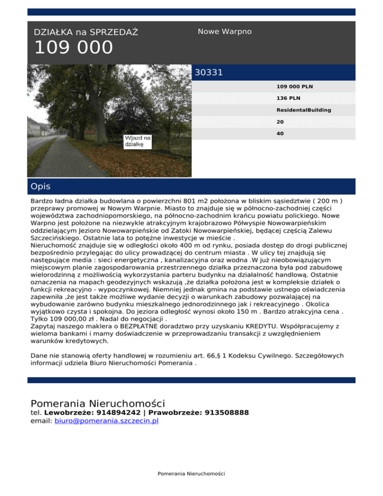Nowe Warpno DZIAŁKA na SPRZEDAŻ 109 000 30331 109 000 PLN 136 PLN ResidentalBuilding 20 40 Opis Bardzo ładna działka budowlana o powierzchni 801 m2 położona w bliskim sąsiedztwie ( 200 m ) przeprawy promowej w Nowym Warpnie. Miasto to znajduje się w północno-zachodniej części województwa zachodniopomorskiego, na północno-zachodnim krańcu powiatu polickiego. Nowe Warpno jest położone na niezwykle atrakcyjnym krajobrazowo Półwyspie Nowowarpieńskim oddzielającym Jezioro Nowowarpieńskie od Zatoki Nowowarpieńskiej, będącej częścią Zalewu Szczecińskiego. Ostatnie lata to potężne inwestycje w mieście . Nieruchomość znajduje się w odległości około 400 m od rynku, posiada dostęp do drogi publicznej bezpośrednio przylegając do ulicy prowadzącej do centrum miasta . W ulicy tej znajdują się następujące media : sieci energetyczna , kanalizacyjna oraz wodna .W już nieobowiązującym miejscowym planie zagospodarowania przestrzennego działka przeznaczona była pod zabudowę wielorodzinną z możliwością wykorzystania parteru budynku na działalność handlową. Ostatnie oznaczenia na mapach geodezyjnych wskazują ,że działka położona jest w kompleksie działek o funkcji rekreacyjno - wypoczynkowej. Niemniej jednak gmina na podstawie ustnego oświadczenia zapewniła ,że jest także możliwe wydanie decyzji o warunkach zabudowy pozwalającej na wybudowanie zarówno budynku mieszkalnego jednorodzinnego jak i rekreacyjnego . Okolica wyjątkowo czysta i spokojna. Do jeziora odległość wynosi około 150 m . Bardzo atrakcyjna cena . Tylko 109 000,00 zł . Nadal do negocjacji . Zapytaj naszego maklera o BEZPŁATNE doradztwo przy uzyskaniu KREDYTU. Współpracujemy z wieloma bankami i mamy doświadczenie w przeprowadzaniu transakcji z uwzględnieniem warunków kredytowych. Dane nie stanowią oferty handlowej w rozumieniu art. 66,§ 1 Kodeksu Cywilnego. Szczegółowych informacji udziela Biuro Nieruchomości Pomerania . Pomerania Nieruchomości tel. Lewobrzeże: 914894242 | Prawobrzeże: 913508888 email: [email protected] Pomerania Nieruchomości Powered by TCPDF (www.tcpdf.org)