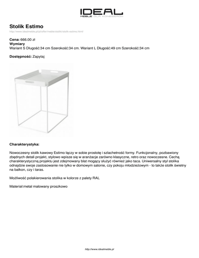 Stolik Estimo http://www.idealmeble.pl/pl/offer/meble/stoliki/stolik-estimo.html/ Cena: 666.00 zł Wymiary Wariant S Długość:34 cm Szerokość:34 cm. Wariant L Długość:49 cm Szerokość:34 cm Dostępność: Zapytaj Charakterystyka: Nowoczesny stolik kawowy Estimo łączy w sobie prostotę i szlachetność formy. Funkcjonalny, pozbawiony zbędnych detali projekt, stylowo wpisze się w aranżacje zarówno klasyczne, retro oraz nowoczesne. Cechą charakterystyczną projektu jest zdejmowany blat mogący służyć również jako taca. Uniwersalny styl stolika odnajdzie swoje zastosowanie nie tylko w domowym salonie, czy pokoju młodzieżowym - to także stolik świetny na balkon, czy i taras. Możliwość polakierowania stolika w kolorze z palety RAL Materiał:metal malowany proszkowo http://www.idealmeble.pl Dostępne wersje produktu: nazwa produktu Stolik Estimo S Długość:34 cm warianty kolor biały cena 555.00zł 444.00zł dostępne Zapytaj Stolik Estimo L Długość:49 cm kolor biały 666.00zł Zapytaj http://www.idealmeble.pl Zdjęcia produktu: http://www.idealmeble.pl Powered by TCPDF (www.tcpdf.org)