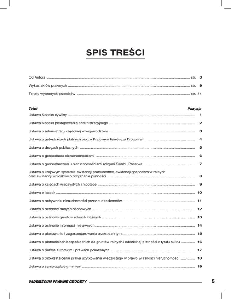 SPIS TREŚCI Od Autora .............................................................................................................................................. str. 3 Wykaz aktów prawnych ......................................................................................................................... str. 9 Teksty wybranych przepisów ................................................................................................................ str. 41 Tytuł Pozycja Ustawa Kodeks cywilny .............................................................................................................................. 1 Ustawa Kodeks postępowania administracyjnego ..................................................................................... 2 Ustawa o administracji rządowej w województwie ..................................................................................... 3 Ustawa o autostradach płatnych oraz o Krajowym Funduszu Drogowym ................................................. 4 Ustawa o drogach publicznych .................................................................................................................. 5 Ustawa o gospodarce nieruchomościami .................................................................................................. 6 Ustawa o gospodarowaniu nieruchomościami rolnymi Skarbu Państwa ................................................... 7 Ustawa o krajowym systemie ewidencji producentów, ewidencji gospodarstw rolnych oraz ewidencji wniosków o przyznanie płatności ....................................................................................... 8 Ustawa o księgach wieczystych i hipotece ................................................................................................ 9 Ustawa o lasach .......................................................................................................................................... 10 Ustawa o nabywaniu nieruchomości przez cudzoziemców ........................................................................ 11 Ustawa o ochronie danych osobowych ...................................................................................................... 12 Ustawa o ochronie gruntów rolnych i leśnych ............................................................................................. 13 Ustawa o ochronie informacji niejawnych ................................................................................................... 14 Ustawa o planowaniu i zagospodarowaniu przestrzennym ........................................................................ 15 Ustawa o płatnościach bezpośrednich do gruntów rolnych i oddzielnej płatności z tytułu cukru .............. 16 Ustawa o prawie autorskim i prawach pokrewnych .................................................................................... 17 Ustawa o przekształceniu prawa użytkowania wieczystego w prawo własności nieruchomości ............... 18 Ustawa o samorządzie gminnym ................................................................................................................ 19 VADEMECUM PRAWNE GEODETY 5 Ustawa o samorządzie powiatowym .......................................................................................................... 20 Ustawa o samorządzie województwa ......................................................................................................... 21 Ustawa o scalaniu i wymianie gruntów ....................................................................................................... 22 Ustawa o spółdzielniach mieszkaniowych .................................................................................................. 23 Ustawa o urzędowych nazwach miejscowości i obiektów fizjograficznych ............................................... 24 Ustawa o własności lokali .......................................................................................................................... 25 Ustawa o zasadach przekazywania zakładowych budynków mieszkalnych przez przedsiębiorstwa państwowe ................................................................................................................................................. 26 Ustawa Prawo budowlane .......................................................................................................................... 27 Ustawa Prawo geodezyjne i kartograficzne ............................................................................................... 28 Ustawa Prawo geologiczne i górnicze ........................................................................................................ 29 Ustawa Prawo wodne ................................................................................................................................. 30 Ustawa Prawo zamówień publicznych ........................................................................................................ 31 Rozporządzenie MB w sprawie szczegółowych zasad gospodarki finansowej Funduszu Gospodarki Zasobem Geodezyjnym i Kartograficznym ................................................................................................. 32 Rozporządzenie MG w sprawie dokumentacji mierniczo-geologicznej ..................................................... 33 Rozporządzenie MGPiB w sprawie rodzaju i zakresu opracowań geodezyjno-kartograficznych oraz czynności geodezyjnych obowiązujących w budownictwie ............................................................... 34 Rozporządzenie MI w sprawie numeracji porządkowej nieruchomości ..................................................... 35 Rozporządzenie MI w sprawie określenia wymagań, jakim powinni odpowiadać wojewódzcy inspektorzy nadzoru geodezyjnego i kartograficznego, geodeci województw, geodeci powiatowi i geodeci gminni ... 36 Rozporządzenie MI w sprawie oznaczeń i nazewnictwa stosowanych w decyzji o ustaleniu lok