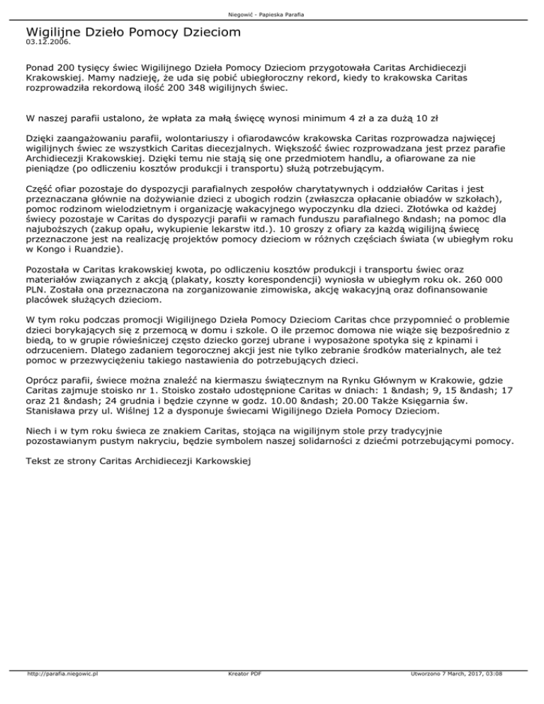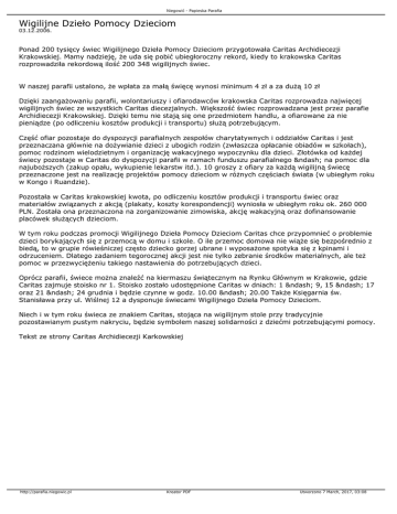 Niegowić - Papieska Parafia Wigilijne Dzieło Pomocy Dzieciom 03.12.2006. Ponad 200 tysięcy świec Wigilijnego Dzieła Pomocy Dzieciom przygotowała Caritas Archidiecezji Krakowskiej. Mamy nadzieję, że uda się pobić ubiegłoroczny rekord, kiedy to krakowska Caritas rozprowadziła rekordową ilość 200 348 wigilijnych świec. W naszej parafii ustalono, że wpłata za małą święcę wynosi minimum 4 zł a za dużą 10 zł Dzięki zaangażowaniu parafii, wolontariuszy i ofiarodawców krakowska Caritas rozprowadza najwięcej wigilijnych świec ze wszystkich Caritas diecezjalnych. Większość świec rozprowadzana jest przez parafie Archidiecezji Krakowskiej. Dzięki temu nie stają się one przedmiotem handlu, a ofiarowane za nie pieniądze (po odliczeniu kosztów produkcji i transportu) służą potrzebującym. Część ofiar pozostaje do dyspozycji parafialnych zespołów charytatywnych i oddziałów Caritas i jest przeznaczana głównie na dożywianie dzieci z ubogich rodzin (zwłaszcza opłacanie obiadów w szkołach), pomoc rodzinom wielodzietnym i organizację wakacyjnego wypoczynku dla dzieci. Złotówka od każdej świecy pozostaje w Caritas do dyspozycji parafii w ramach funduszu parafialnego – na pomoc dla najuboższych (zakup opału, wykupienie lekarstw itd.). 10 groszy z ofiary za każdą wigilijną świecę przeznaczone jest na realizację projektów pomocy dzieciom w różnych częściach świata (w ubiegłym roku w Kongo i Ruandzie). Pozostała w Caritas krakowskiej kwota, po odliczeniu kosztów produkcji i transportu świec oraz materiałów związanych z akcją (plakaty, koszty korespondencji) wyniosła w ubiegłym roku ok. 260 000 PLN. Została ona przeznaczona na zorganizowanie zimowiska, akcję wakacyjną oraz dofinansowanie placówek służących dzieciom. W tym roku podczas promocji Wigilijnego Dzieła Pomocy Dzieciom Caritas chce przypomnieć o problemie dzieci borykających się z przemocą w domu i szkole. O ile przemoc domowa nie wiąże się bezpośrednio z biedą, to w grupie rówieśniczej często dziecko gorzej ubrane i wyposażone spotyka się z kpinami i odrzuceniem. Dlatego zadaniem tegorocznej akcji jest nie tylko zebranie środków materialnych, ale też pomoc w przezwyciężeniu takiego nastawienia do potrzebujących dzieci. Oprócz parafii, świece można znaleźć na kiermaszu świątecznym na Rynku Głównym w Krakowie, gdzie Caritas zajmuje stoisko nr 1. Stoisko zostało udostępnione Caritas w dniach: 1 – 9, 15 – 17 oraz 21 – 24 grudnia i będzie czynne w godz. 10.00 – 20.00 Także Księgarnia św. Stanisława przy ul. Wiślnej 12 a dysponuje świecami Wigilijnego Dzieła Pomocy Dzieciom. Niech i w tym roku świeca ze znakiem Caritas, stojąca na wigilijnym stole przy tradycyjnie pozostawianym pustym nakryciu, będzie symbolem naszej solidarności z dziećmi potrzebującymi pomocy. Tekst ze strony Caritas Archidiecezji Karkowskiej http://parafia.niegowic.pl Kreator PDF Utworzono 7 March, 2017, 03:08