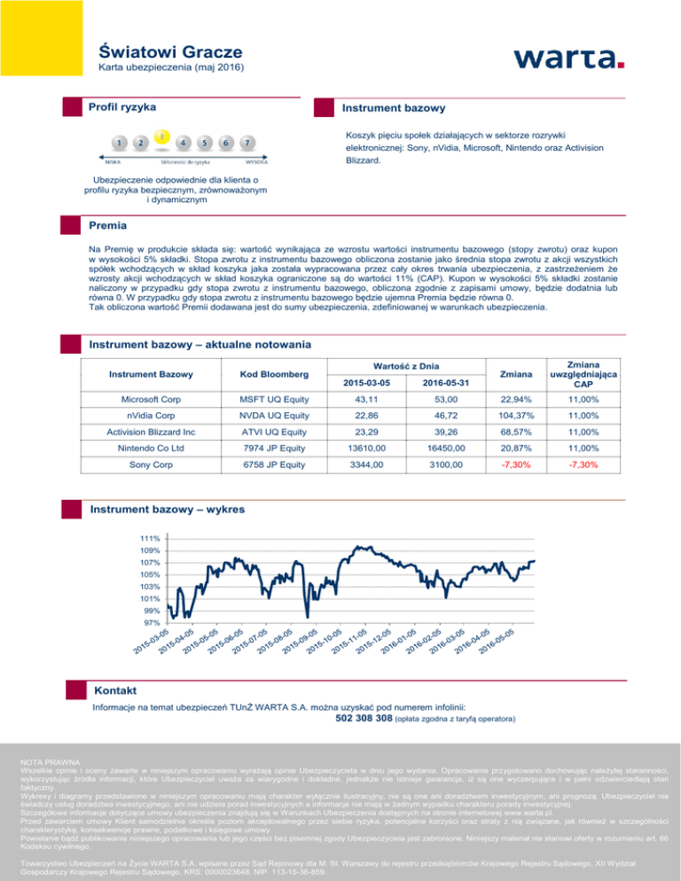 Światowi Gracze Karta ubezpieczenia (maj 2016) Profil ryzyka Instrument bazowy Koszyk pięciu społek działających w sektorze rozrywki elektronicznej: Sony, nVidia, Microsoft, Nintendo oraz Activision Blizzard. Ubezpieczenie odpowiednie dla klienta o profilu ryzyka bezpiecznym, zrównoważonym i dynamicznym Premia Na Premię w produkcie składa się: wartość wynikająca ze wzrostu wartości instrumentu bazowego (stopy zwrotu) oraz kupon w wysokości 5% składki. Stopa zwrotu z instrumentu bazowego obliczona zostanie jako średnia stopa zwrotu z akcji wszystkich spółek wchodzących w skład koszyka jaka została wypracowana przez cały okres trwania ubezpieczenia, z zastrzeżeniem że wzrosty akcji wchodzących w skład koszyka ograniczone są do wartości 11% (CAP). Kupon w wysokości 5% składki zostanie naliczony w przypadku gdy stopa zwrotu z instrumentu bazowego, obliczona zgodnie z zapisami umowy, będzie dodatnia lub równa 0. W przypadku gdy stopa zwrotu z instrumentu bazowego będzie ujemna Premia będzie równa 0. Tak obliczona wartość Premii dodawana jest do sumy ubezpieczenia, zdefiniowanej w warunkach ubezpieczenia. Instrument bazowy – aktualne notowania Wartość z Dnia Instrument Bazowy Kod Bloomberg 2015-03-05 2016-05-31 Zmiana Zmiana uwzględniająca CAP Microsoft Corp MSFT UQ Equity 43,11 53,00 22,94% 11,00% nVidia Corp NVDA UQ Equity 22,86 46,72 104,37% 11,00% Activision Blizzard Inc ATVI UQ Equity 23,29 39,26 68,57% 11,00% Nintendo Co Ltd 7974 JP Equity 13610,00 16450,00 20,87% 11,00% Sony Corp 6758 JP Equity 3344,00 3100,00 -7,30% -7,30% Instrument bazowy – wykres 111% 109% 107% 105% 103% 101% 99% 97% Kontakt Informacje na temat ubezpieczeń TUnŻ WARTA S.A. można uzyskać pod numerem infolinii: 502 308 308 (opłata zgodna z taryfą operatora) NOTA PRAWNA Wszelkie opinie i oceny zawarte w niniejszym opracowaniu wyrażają opinie Ubezpieczyciela w dniu jego wydania. Opracowanie przygotowano dochowując należytej staranności, wykorzystując źródła informacji, które Ubezpieczyciel uważa za wiarygodne i dokładne, jednakże nie istnieje gwarancja, iż są one wyczerpujące i w pełni odzwierciedlają stan faktyczny. Wykresy i diagramy przedstawione w niniejszym opracowaniu mają charakter wyłącznie ilustracyjny, nie są one ani doradztwem inwestycyjnym, ani prognozą. Ubezpieczyciel nie świadczy usług doradztwa inwestycyjnego, ani nie udziela porad inwestycyjnych a informacje nie mają w żadnym wypadku charakteru porady inwestycyjnej. Szczegółowe informacje dotyczące umowy ubezpieczenia znajdują się w Warunkach Ubezpieczenia dostępnych na stronie internetowej www.warta.pl. Przed zawarciem umowy Klient samodzielnie określa poziom akceptowalnego przez siebie ryzyka, potencjalne korzyści oraz straty z nią związane, jak również w szczególności charakterystykę, konsekwencje prawne, podatkowe i księgowe umowy. Powielanie bądź publikowanie niniejszego opracowania lub jego części bez pisemnej zgody Ubezpieczyciela jest zabronione. Niniejszy materiał nie stanowi oferty w rozumieniu art. 66 Kodeksu cywilnego. Towarzystwo Ubezpieczeń na Życie WARTA S.A. wpisane przez Sąd Rejonowy dla M. St. Warszawy do rejestru przedsiębiorców Krajowego Rejestru Sądowego, XII Wydział Gospodarczy Krajowego Rejestru Sądowego, KRS: 0000023648, NIP 113-15-36-859.