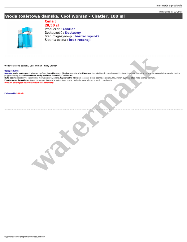 Informacje o produkcie Utworzono 07-03-2017 Woda toaletowa damska, Cool Woman - Chatler, 100 ml Cena : 28,50 zł Producent : Chatler Dostępność : Dostępny Stan magazynowy : bardzo wysoki Średnia ocena : brak recenzji er m ar k Woda toaletowa damska, Cool Woman - firmy Chatler Opis produktu: Damska woda toaletowa, kwiatowe, perfumy damskie, marki Chatler o nazwie, Cool Woman, istota kobiecości, przyjemności i całego bogactwa tego co w przyrodzie najcenniejsze - wody, bardzo przypominający, damskie markowe wody perfumy, Davidoff, Cool Water. Nuta podstawowa: irys, brzoskwinia, morwa,wetiwer, ambra, Wyczuwalne również - ananas, pigwa, czarna porzeczka, lilia, melon, cytryna, lotos, róża, jaśmin, konwalia. Ekskluzywne damskie perfumy, to damska świeżość w najczystszej postaci, daje doznanie wigoru, energii i zmysłowości. Produkt polski jest nowy i fabrycznie zapakowany w at Pojemność: 100 ml. Wygenerowano w programie www.oscGold.com