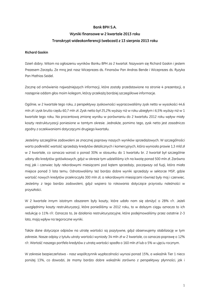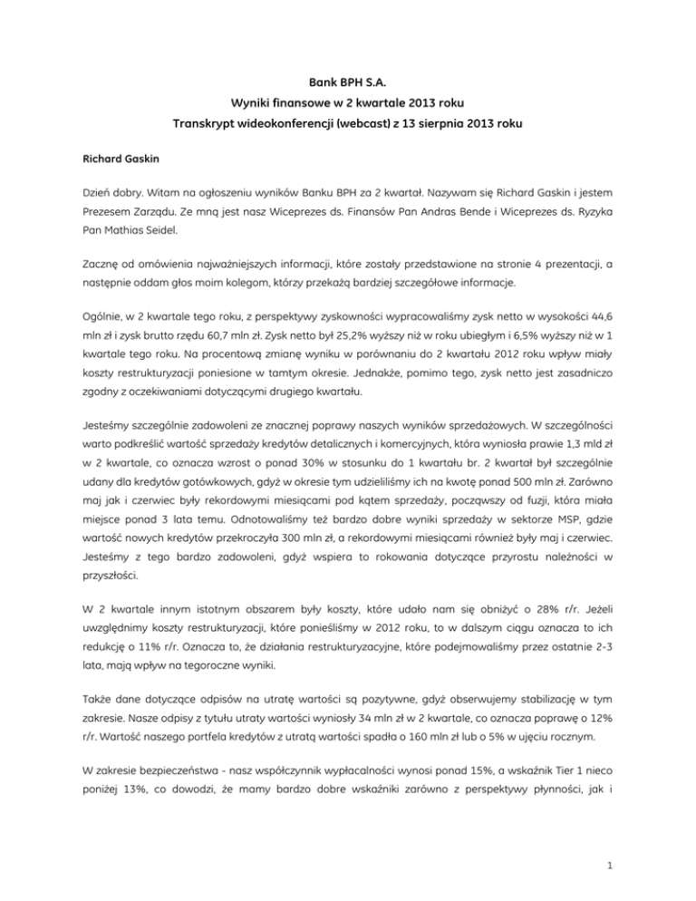 Bank BPH S.A. Wyniki finansowe w 2 kwartale 2013 roku Transkrypt wideokonferencji (webcast) z 13 sierpnia 2013 roku Richard Gaskin Dzień dobry. Witam na ogłoszeniu wyników Banku BPH za 2 kwartał. Nazywam się Richard Gaskin i jestem Prezesem Zarządu. Ze mną jest nasz Wiceprezes ds. Finansów Pan Andras Bende i Wiceprezes ds. Ryzyka Pan Mathias Seidel. Zacznę od omówienia najważniejszych informacji, które zostały przedstawione na stronie 4 prezentacji, a następnie oddam głos moim kolegom, którzy przekażą bardziej szczegółowe informacje. Ogólnie, w 2 kwartale tego roku, z perspektywy zyskowności wypracowaliśmy zysk netto w wysokości 44,6 mln zł i zysk brutto rzędu 60,7 mln zł. Zysk netto był 25,2% wyższy niż w roku ubiegłym i 6,5% wyższy niż w 1 kwartale tego roku. Na procentową zmianę wyniku w porównaniu do 2 kwartału 2012 roku wpływ miały koszty restrukturyzacji poniesione w tamtym okresie. Jednakże, pomimo tego, zysk netto jest zasadniczo zgodny z oczekiwaniami dotyczącymi drugiego kwartału. Jesteśmy szczególnie zadowoleni ze znacznej poprawy naszych wyników sprzedażowych. W szczególności warto podkreślić wartość sprzedaży kredytów detalicznych i komercyjnych, która wyniosła prawie 1,3 mld zł w 2 kwartale, co oznacza wzrost o ponad 30% w stosunku do 1 kwartału br. 2 kwartał był szczególnie udany dla kredytów gotówkowych, gdyż w okresie tym udzieliliśmy ich na kwotę ponad 500 mln zł. Zarówno maj jak i czerwiec były rekordowymi miesiącami pod kątem sprzedaży, począwszy od fuzji, która miała miejsce ponad 3 lata temu. Odnotowaliśmy też bardzo dobre wyniki sprzedaży w sektorze MSP, gdzie wartość nowych kredytów przekroczyła 300 mln zł, a rekordowymi miesiącami również były maj i czerwiec. Jesteśmy z tego bardzo zadowoleni, gdyż wspiera to rokowania dotyczące przyrostu należności w przyszłości. W 2 kwartale innym istotnym obszarem były koszty, które udało nam się obniżyć o 28% r/r. Jeżeli uwzględnimy koszty restrukturyzacji, które ponieśliśmy w 2012 roku, to w dalszym ciągu oznacza to ich redukcję o 11% r/r. Oznacza to, że działania restrukturyzacyjne, które podejmowaliśmy przez ostatnie 2-3 lata, mają wpływ na tegoroczne wyniki. Także dane dotyczące odpisów na utratę wartości są pozytywne, gdyż obserwujemy stabilizację w tym zakresie. Nasze odpisy z tytułu utraty wartości wyniosły 34 mln zł w 2 kwartale, co oznacza poprawę o 12% r/r. Wartość naszego portfela kredytów z utratą wartości spadła o 160 mln zł lub o 5% w ujęciu rocznym. W zakresie bezpieczeństwa - nasz współczynnik wypłacalności wynosi ponad 15%, a wskaźnik Tier 1 nieco poniżej 13%, co dowodzi, że mamy bardzo dobre wskaźniki zarówno z perspektywy płynności, jak i 1 adekwatności kapitałowej. Ryzyko rynkowe także utrzymuje się na bardzo bezpiecznym poziomie, więc ogólnie w 2 kwartale nasze wyniki były zadowalające. Jednym z ważniejszych wydarzeń w 2 kwartale był znaczny wzrost sprzedaży. Było to skutkiem wielu inicjatyw i, z całą pewnością, konsekwentnego wdrażania strategii Fair Play. Zostało to omówione na 5 stronie. Naszym celem jest zdobycie pozycji nr 1 w Polsce pod kątem fair play i zaufania. Przyjęliśmy tę strategię kilka lat temu i co kwartał wprowadzamy nowe inicjatywy, które są dla niej wsparciem. W 2 kwartale wprowadziliśmy szereg inicjatyw, które przedstawiono po lewej stronie slajdu. Wprowadziliśmy funkcję Rzecznika Klientów Banku BPH. Do Rzecznika będą mogli zwrócić się Klienci uważający, że ich sprawa nie została odpowiednio rozpatrzona przez innych pracowników Banku, z którymi mieli kontakt. Jest to, więc pewnego rodzaju niezależny pracownik, który – jak wierzymy – będzie w stanie subiektywnie i uczciwie ocenić problem Klienta i uniknąć sytuacji, w której Klient szuka rozwiązania poza Bankiem, za pośrednictwem stron trzecich. Wprowadziliśmy infolinię dla Klientów, którzy mają problemy ze spłatą zadłużenia. W przeszłości zazwyczaj rozmawialiśmy z Klientami, gdy zauważyliśmy, że znaleźli się w trudnej sytuacji. Obecnie dajemy im szansę skontaktowania się z nami zanim taka sytuacja wystąpi, aby zaoferować im naszą wiedzę, porady i – mam nadzieję – sposób na rozwiązanie problemów. Już teraz otrzymujemy wiele rozmów przychodzących w ramach tej usługi. W ubiegłym roku wprowadziliśmy jednostronicowe podsumowanie umowy (tzw. one pager) dla Klientów detalicznych. Celem było umieszczenie wszystkich najważniejszych ustaleń umowy kredytowej na jednej stronie tak, aby Klient: a) przeczytał je i b) zrozumiał je. Pomysł okazał się tak udany, że zdecydowaliśmy się wprowadzić dokładnie tę samą propozycję dla Klientów z segmentu małych i średnich przedsiębiorstw, i spodziewamy się podobnej reakcji w tym segmencie. Rozmowa z Klientem stała się istotnym elementem naszych działań. Odbyliśmy wiele spotkań z Klientami detalicznymi i MSP, w których uczestniczyli członkowie Zarządu Banku, zespołu marketingu i zespołu sprzedaży. Mieliśmy możliwość porozmawiania z Klientami i pozyskania bezpośrednich opinii o tym, co podoba im się w naszych produktach i usługach oraz, co bardzo ważne, o tym, co chcieliby poprawić. Stało się to podstawą realizacji wielu inicjatyw, o których wspomniałem oraz tych, które zostaną zrealizowane w przyszłości. Rozmawialiśmy z Klientami o ich definicji pojęcia fair play i o tym, jakich standardów oczekują od banku określanego mianem fair play. Nie chcieliśmy sami ogłaszać się zwycięzcami w tym zakresie, dlatego poprosiliśmy niezależną firmę audytorską o przeprowadzenie oceny Banku pod kątem tych standardów i opracowanie niezależnego raportu pokazującej nasze rzeczywiste zaangażowanie w bankowość fair play i realizację założonych celów. 2 Jesteśmy zadowoleni z poziomu kluczowych wskaźników marki, które 