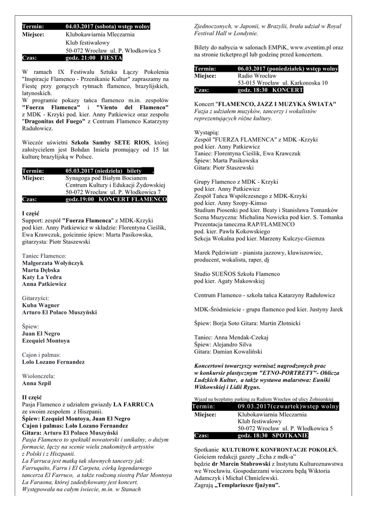 Termin: Miejsce: Czas: 04.03.2017 (sobota) wstęp wolny Klubokawiarnia Mleczarnia \ Klub festiwalowy 50-072 Wrocław ul. P. Włodkowica 5 godz. 21:00 FIESTA W ramach IX Festiwalu Sztuka Łączy Pokolenia "Inspiracje Flamenco - Przenikanie Kultur" zapraszamy na Fiestę przy gorących rytmach flamenco, brazylijskich, latynoskich. W programie pokazy tańca flamenco m.in. zespołów "Fuerza Flamenca" i "Viento del Flamenco" z MDK - Krzyki pod. kier. Anny Patkiewicz oraz zespołu "Dragonitas del Fuego" z Centrum Flamenco Katarzyny Radułowicz. Wieczór uświetni Szkoła Samby SETE RIOS, której założycielem jest Bohdan Imiela promujący od 15 lat kulturę brazylijską w Polsce. Termin: Miejsce: Czas: 05.03.2017 (niedziela) bilety . Synagoga pod Białym Bocianem Centrum Kultury i Edukacji Żydowskiej 50-072 Wrocław ul. P. Włodkowica 7 godz.19:00 KONCERT FLAMENCO I część Support: zespół "Fuerza Flamenca" z MDK-Krzyki pod kier. Anny Patkiewicz w składzie: Florentyna Cieślik, Ewa Krawczuk, gościnnie śpiew: Marta Pasikowska, gitarzysta: Piotr Staszewski Taniec Flamenco: Małgorzata Wołyńczyk Marta Dębska Katy La Yedra Anna Patkiewicz Gitarzyści: Kuba Wagner Arturo El Polaco Muszyński Śpiew: Juan El Negro Ezequiel Montoya Cajon i palmas: Lolo Lozano Fernandez Wiolonczela: Anna Szpil II część Pasja Flamenco z udziałem gwiazdy LA FARRUCA ze swoim zespołem z Hiszpanii. Śpiew: Ezequiel Montoya, Juan El Negro Cajon i palmas: Lolo Lozano Fernandez Gitara: Arturo El Polaco Muszyński Pasja Flamenco to spektakl nowatorski i unikalny, o dużym formacie, łączy na scenie wielu znakomitych artystów z Polski i z Hiszpanii. La Farruca jest matką tak sławnych tancerzy jak: Farruquito, Farru i El Carpeta, córką legendarnego tancerza El Farruco, a także rodzoną siostrą Pilar Montoya La Faraona, której zadedykowany jest koncert. Występowała na całym świecie, m.in. w Stanach Zjednoczonych, w Japonii, w Brazylii, brała udział w Royal Festival Hall w Londynie. Bilety do nabycia w salonach EMPiK, www.eventim.pl oraz na stronie ticketpro.pl lub godzinę przed koncertem. Termin: Miejsce: Czas: 06.03.2017 (poniedziałek) wstęp wolny Radio Wrocław 53-015 Wrocław ul. Karkonoska 10 godz. 18:30 KONCERT Koncert "FLAMENCO, JAZZ I MUZYKA ŚWIATA" Fuzja z udziałem muzyków, tancerzy i wokalistów reprezentujących różne kultury. Wystąpią: Zespół "FUERZA FLAMENCA" z MDK -Krzyki pod kier. Anny Patkiewicz Taniec: Florentyna Cieślik, Ewa Krawczuk Śpiew: Marta Pasikowska Gitara: Piotr Staszewski Grupy Flamenco z MDK - Krzyki pod kier. Anny Patkiewicz Zespół Tańca Współczesnego z MDK-Krzyki pod kier. Anny Szopy-Kimso Studium Piosenki pod kier. Beaty i Stanisława Tomanków Scena Muzyczna: Michalina Nowicka pod kier. S. Tomanka Prezentacja taneczna RAP/FLAMENCO pod. kier. Pawła Kokowskiego Sekcja Wokalna pod kier. Marzeny Kulczyc-Giemza Marek Pędziwiatr - pianista jazzowy, klawiszowiec, producent, wokalista, raper, dj Studio SUEÑOS Szkoła Flamenco pod kier. Agaty Makowskiej Centrum Flamenco - szkoła tańca Katarzyny Radułowicz MDK-Śródmieście - grupa flamenco pod kier. Justyny Jarek Śpiew: Borja Soto Gitara: Martin Złotnicki Taniec: Anna Mendak-Czekaj Śpiew: Alejandro Silva Gitara: Damian Kowaliński Koncertowi towarzyszy wernisaż nagrodzonych prac w konkursie plastycznym "ETNO-PORTRETY"- Oblicza Ludzkich Kultur, a także wystawa malarstwa: Euniki Witkowskiej i Lidii Rygus. Wjazd na bezpłatny parking za Radiem Wrocław od ulicy Żołnierskiej Termin: Miejsce: Czas: 0 9.03.2017 (czwartek) wstęp wolny Klubokawiarnia Mleczarnia Klub festiwalowy 50-072 Wrocław ul. P. Włodkowica 5 godz. 18:30 SPOTKANIE Spotkanie KULTUROWE KONFRONTACJE POKOLEŃ. Gościem redakcji gazety „Echa z mdk-a” będzie dr Marcin Stabrowski z Instytutu Kulturoznawstwa we Wrocławiu. Gospodarzami wieczoru będą Wiktoria Adamczyk i Michał Chmielewski. Zagrają „Templariusze fjużynu”.