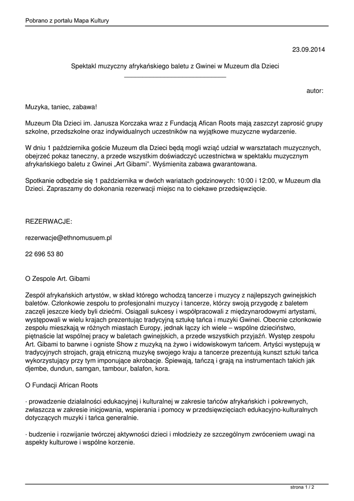 Pobrano z portalu Mapa Kultury 23.09.2014 Spektakl muzyczny afrykańskiego baletu z Gwinei w Muzeum dla Dzieci ____________________________ autor: Muzyka, taniec, zabawa! Muzeum Dla Dzieci im. Janusza Korczaka wraz z Fundacją Afican Roots mają zaszczyt zaprosić grupy szkolne, przedszkolne oraz indywidualnych uczestników na wyjątkowe muzyczne wydarzenie. W dniu 1 października goście Muzeum dla Dzieci będą mogli wziąć udział w warsztatach muzycznych, obejrzeć pokaz taneczny, a przede wszystkim doświadczyć uczestnictwa w spektaklu muzycznym afrykańskiego baletu z Gwinei „Art Gibami”. Wyśmienita zabawa gwarantowana. Spotkanie odbędzie się 1 października w dwóch wariatach godzinowych: 10:00 i 12:00, w Muzeum dla Dzieci. Zapraszamy do dokonania rezerwacji miejsc na to ciekawe przedsięwzięcie. REZERWACJE: [email protected] 22 696 53 80 O Zespole Art. Gibami Zespół afrykańskich artystów, w skład którego wchodzą tancerze i muzycy z najlepszych gwinejskich baletów. Członkowie zespołu to profesjonalni muzycy i tancerze, którzy swoją przygodę z baletem zaczęli jeszcze kiedy byli dziećmi. Osiągali sukcesy i współpracowali z międzynarodowymi artystami, występowali w wielu krajach prezentując tradycyjną sztukę tańca i muzyki Gwinei. Obecnie członkowie zespołu mieszkają w różnych miastach Europy, jednak łączy ich wiele – wspólne dzieciństwo, piętnaście lat wspólnej pracy w baletach gwinejskich, a przede wszystkich przyjaźń. Występ zespołu Art. Gibami to barwne i ogniste Show z muzyką na żywo i widowiskowym tańcem. Artyści występują w tradycyjnych strojach, grają etniczną muzykę swojego kraju a tancerze prezentują kunszt sztuki tańca wykorzystujący przy tym imponujące akrobacje. Śpiewają, tańczą i grają na instrumentach takich jak djembe, dundun, samgan, tambour, balafon, kora. O Fundacji African Roots · prowadzenie działalności edukacyjnej i kulturalnej w zakresie tańców afrykańskich i pokrewnych, zwłaszcza w zakresie inicjowania, wspierania i pomocy w przedsięwzięciach edukacyjno-kulturalnych dotyczących muzyki i tańca generalnie. · budzenie i rozwijanie twórczej aktywności dzieci i młodzieży ze szczególnym zwróceniem uwagi na aspekty kulturowe i wspólne korzenie. strona 1 / 2 Pobrano z portalu Mapa Kultury · promocja kultury, sztuki innych Kultur w celu szerzenia szacunku i zrozumienia dla innych Kultur. · działalność na rzecz integracji międzykulturowej oraz rozwijania kontaktów i współpracy między społeczeństwami. strona 2 / 2