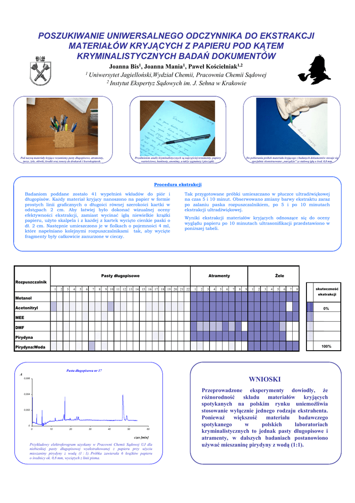 POSZUKIWANIE UNIWERSALNEGO ODCZYNNIKA DO EKSTRAKCJI MATERIAŁÓW KRYJĄCYCH Z PAPIERU POD KĄTEM KRYMINALISTYCZNYCH BADAŃ DOKUMENTÓW Joanna Bis1, Joanna Mania1, Paweł Kościelniak1,2 1 Uniwersytet Jagielloński,Wydział Chemii, Pracownia Chemii Sądowej 2 Instytut Ekspertyz Sądowych im. J. Sehna w Krakowie Pod nazwą materiały kryjące rozumiemy pasty długopisowe, atramenty, tusze, żele, ołówki, kredki oraz tonery do drukarek i kserokopiarek. Przedmiotem analiz kryminalistycznych są najczęściej testamenty, papiery wartościowe, banknoty, anonimy, a także sygnatury i pieczątki. Do pobierania próbek materiału kryjącego z badanych dokumentów stosuje się specjalnie skonstruowane „narzędzie” ze stalową igłą o śred. 0,8 mm. Procedura ekstrakcji Badaniom poddane zostało 41 wypełnień wkładów do piór i długopisów. Każdy materiał kryjący nanoszono na papier w formie prostych linii graficznych o długości równej szerokości kartki w odstępach 2 cm. Aby łatwiej było dokonać wizualnej oceny efektywności ekstrakcji, zamiast wycinać igłą niewielkie krążki papieru, użyto skalpela i z każdej z kartek wycięto cienkie paski o dł. 2 cm. Następnie umieszczono je w fiolkach o pojemności 4 ml, które napełniano kolejnymi rozpuszczalnikami tak, aby wycięte fragmenty były całkowicie zanurzone w cieczy. Tak przygotowane próbki umieszczano w płuczce ultradźwiękowej na czas 5 i 10 minut. Obserwowano zmiany barwy ekstraktu zaraz po zalaniu paska rozpuszczalnikiem, po 5 i po 10 minutach ekstrakcji ultradźwiękowej. Wyniki ekstrakcji materiałów kryjących odnoszące się do oceny wyglądu papieru po 10 minutach ultrasonifikacji przedstawiono w poniższej tabeli. Pasty długopisowe Atramenty Żele Rozpuszczalnik 1 2 3 4 5 6 7 8 9 10 11 12 13 14 15 16 17 18 19 20 21 22 1 2 3 4 5 6 7 8 9 1 2 3 4 5 6 7 8 skuteczność ekstrakcji Metanol Acetonitryl 0% MEE DMF Pirydyna Pirydyna:Woda 100% Pasta długopisowa nr 17 A WNIOSKI 0,006 0,004 0,002 0 0 10 20 30 40 50 60 czas [min] Przykładowy elektroferogram uzyskany w Pracowni Chemii Sądowej UJ dla niebieskiej pasty długopisowej wyekstrahowanej z papieru przy użyciu mieszaniny pirydyny z wodą (1 : 1). Próbka zawierała 6 krążków papieru o średnicy ok. 0,8 mm, wyciętych z linii pisma. Przeprowadzone eksperymenty dowiodły, że różnorodność składu materiałów kryjących spotykanych na polskim rynku uniemożliwia stosowanie wyłącznie jednego rodzaju ekstrahenta. Ponieważ większość materiału badawczego spotykanego w polskich laboratoriach kryminalistycznych to jednak pasty długopisowe i atramenty, w dalszych badaniach postanowiono używać mieszaninę pirydyny z wodą (1:1).