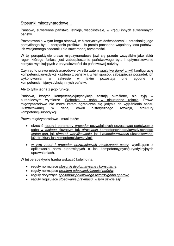 Stosunki międzynarodowe... Państwo, suwerenne państwo, istnieje, współistnieje, w kręgu innych suwerennych państw. Pozostawanie w tym kręgu stanowi, w historycznym doświadczeniu, przesłankę jego pomyślnego bytu i czerpania profitów – to prosta pochodna wspólnoty losu państw i ich wzajemnego szacunku dla suwerennej tożsamości. W tej perspektywie prawo międzynarodowe jawi się przede wszystkim jako zbiór reguł, którego funkcją jest zabezpieczenie państwowego bytu i optymalizowanie korzyści wynikających z przynależności do państwowej rodziny. Czyniąc to prawo międzynarodowe określa zatem właściwą danej chwili konfigurację kompetencji/jurysdykcji każdego z państw i, w ten sposób, zabezpiecza porządek ich wykonywania, w zakresie w jakim pozostają one zgodne z kompetencjami/jurysdykcją innych państw. Ale to tylko jedna z jego funkcji. Państwa, których kompetencje/jurysdykcje zostają określone, nie żyją w autarkicznym wymiarze. Wchodzą z sobą w nieustanne relacje. Prawo międzynarodowe nie może zatem ograniczać się jedynie do wyjaśnienia sensu ukształtowanej, w danej chwili historycznego rozwoju, struktury kompetencji/jurysdykcji. Prawo międzynarodowe - musi także: określić reguły i parametry procedur pozwalających pozostawać państwom z sobą w dialogu służącym tak utrwalaniu kompetencyjnego/jurysdykcyjnego status quo, jak również weryfikowaniu, jak i rekonfigurowaniu ukształtowanej już struktury ich kompetencji/jurysdykcji; w tym reguł i procedur pozwalających rozstrzygać spory, wynikające z aplikowania norm stanowiących o ich kompetencyjnych/jurysdykcyjnych uprawnieniach. W tej perspektywie trzeba wskazać kolejno na: reguły normujące stosunki dyplomatyczne i konsularne; reguły normujące problem odpowiedzialności państw; reguły dotyczące sposobów pokojowego rozstrzygania sporów; reguły regulujące stosowanie przymusu, w tym użycie siły; Prawo dyplomatyczne i konsularne – stosunki dyplomatyczne i konsularne - organy zewnętrzne państwa w stosunkach międzynarodowych. Potrzeba utrzymywania stałych kontaktów, stosunków między państwami wywołała potrzebę posługiwania się specjalnymi służbami wyspecjalizowanymi do pełnienia tej roli. Potrzeba kontaktów wzajemnych sięga czasów zamierzchłych, trudno byłoby wskazać moment pojawienia się 'pierwszego' posła. Zasadniczym problemem prawnym jaki wyłania uprawnianie tych stosunków polega na konkurencyjności kompetencji dwóch państw na tym samym terytorium. W założeniu służby te mają działać na rzecz przyjacielskich stosunków. Może się wszakże zdarzyć, że w relacjach „silny – słaby”, pokusa posługiwania się służbą zagraniczną w intencji wywoływania politycznych, bądź też innego rodzaju nacisków będzie nieodparta. Jasne zatem reguły porządkujące relacje dyplomatyczne i konsularne przyczyniają się do kształtowania relacji, w których udaje się w zasadniczym stopniu uniknąć ewentualnych pokus wywoływania niepożądanych presji. Prawo stosunków dyplomatycznych i konsularnych stara się godzić zatem zasadę pełnego zwierzchnictwa terytorialnego państwa z wymaganiami międzynarodowego obrotu. Gdy mowa o stosunkach dyplomatycznych, nie sposób nie dostrzec, że współcześnie uczestnicy międzynarodowego obrotu to nie tylko państwa, lecz również w znaczącej skali organizacje międzynarodowe (GO’s). Ten fakt czyni obrót dyplomatyczny bardziej złożonym. Przedmiotem naszego zainteresowania będą stosunki dyplomatyczne państw i stosunki dyplomatyczne z udziałem GO’s, oraz stosunki konsularne państw. I. Stosunki dyplomatyczne; - klasyczne prawo międzynarodowe uznaje, iż suwerenne państwa posiadają prawo legacji (refleks prawa zasadniczego – prawa do obrotu): prawo legacji: czynne i bierne; realizują je odpowiednio - 'państwo wysyłające' i 'państwo przyjmujące'; I.1. Stosunki dyplomatyczne między państwami. Do roku 1815 prawo dotyczące stosunków dyplomatycznych było prawem zwyczajowym; w 1815 roku na Kongresie wiedeńskim unormowano cząstkę tego prawa określając klasy i rangi przedstawicieli dyplomatycznych i uzupełniono regulację w tym względzie protokołem akwizgrańskim w 1818 roku o ministrach rezydentach. Próby skodyfikowania prawa dyplomatycznego podejmowano kilkakrotnie pod auspicjami Ligi Narodów; w pełni skuteczne próby podjęto jednak w ramach ONZ - w 1961 roku przyjęto konwencję o stosunkach dyplomatycznych, która weszła w życie 24 kwietnia 1964 roku i która stanowi rzeczywisty kodeks prawa dyplomatycznego naszej doby. Konwencja składa się z preambuły, 53 artykułów i dwóch Protokołów, z których jeden dotyczy metod rozstrzygania sporów pojawiających się na tle stosowania postanowień konwencji. Prawo dyplomatyczne jawi się jako jedno z najstarszych w systemie prawa międzynarodowego i jako prawo najbardziej ustabilizowane i zbiór norm całkowicie 'zamknięty'. I.1.2. Ustanowienie i zerwanie stosunków dyplomatycznych. Ustanowienie stosunków dyplomatycznych następuje na podstawie: wzajemnego porozumienia zainteresowanych państw; to wzajemne porozumienie jest zazwyczaj bardzo uroczyste - jego wyrazem jest wspólny komunikat, traktat przyjaźni … Dysponowanie prawem legacji a wykorzystywanie tegoż to dwie różne sprawy; decyzja o ustanowieniu stosunków dyplomatycznych jest zazwyczaj rezultatem długo ważonej decyzji. Często skutkiem tejże jest uznanie państwa. Wielowiekowa izolacja Chin i Japonii, nie nawiązywanie jakichkolwiek kontaktów dyplomatycznych ze światem zewnętrznym pozwala sądzić, że w ocenie władców owych krajów, w tamtej dobie, brak kontaktów dyplomatycznych w niczym nie szkodził państwowej egzystencji. Nikt nie ma obowiązku nawiązania stosunków dyplomatycznych czy też konsularnych, lecz jeśli państwo to uczyni musi być ono świadomym poddania się szeregu imperatywnym (ius cogens) regułom pra