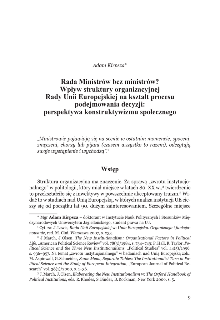 Adam Kirpsza* Rada Ministrów bez ministrów? Wpływ struktury organizacyjnej Rady Unii Europejskiej na kształt procesu podejmowania decyzji: perspektywa konstruktywizmu społecznego „Ministrowie pojawiają się na scenie w ostatnim momencie, spoceni, zmęczeni, chorzy lub pijani (czasem wszystko to razem), odczytują swoje wystąpienie i wychodzą”.1 Wstęp Struktura organizacyjna ma znaczenie. Za sprawą „zwrotu instytucjonalnego” w politologii, który miał miejsce w latach 80. XX w.,2 twierdzenie to przekształciło się z inwektywy w powszechnie akceptowany truizm.3 Widać to w studiach nad Unią Europejską, w których analiza instytucji UE cieszy się od początku lat 90. dużym zainteresowaniem. Szczególne miejsce * Mgr Adam Kirpsza – doktorant w Instytucie Nauk Politycznych i Stosunków Międzynarodowych Uniwersytetu Jagiellońskiego, student prawa na UJ. 1 Cyt. za: J. Lewis, Rada Unii Europejskiej w: Unia Europejska. Organizacja i funkcjonowanie, red. M. Cini, Warszawa 2007, s. 233. 2 J. March, J. Olsen, The New Institutionalism: Organizational Factors in Political Life, „American Political Science Review” vol. 78(3)/1984, s. 734–749; P. Hall, R. Taylor, Political Science and the Three New Institutionalisms, „Political Studies” vol. 44(5)/1996, s. 936–957. Na temat „zwrotu instytucjonalnego” w badaniach nad Unią Europejską zob.: M. Aspinwall, G. Schneider, Same Menu, Separate Tables: The Institutionalist Turn in Political Science and the Study of European Integration, „European Journal of Political Research” vol. 38(1)/2000, s. 1–36. 3 J. March, J. Olsen, Elaborating the New Institutionalism w: The Oxford Handbook of Political Institutions, eds. R. Rhodes, S. Binder, B. Rockman, New York 2006, s. 5. 9 Studia Europejskie, 4/2011 zajmują badania nad organizacją Rady,4 wciąż najważniejszego decydenta w UE.5 Dowodzą, że podejmowanie decyzji w tej instytucji odbywa się w rozbudowanej i skomplikowanej strukturze, zawierającej trzy szczeble: grup roboczych, komitetów specjalnych i ministrów. W wyniku obowiązującego specyficznego podziału pracy między tymi formacjami ok. 65% unijnych aktów prawodawczych jest rozstrzyganych na pierwszym i drugim poziomie.6 W rezultacie ministrowie mają niewielki wpływ na legislację, co pogłębia „deficyt demokracji” i przyczynia się do technokratyzacji prawodawstwa.7 Podział pracy w strukturze organizacyjnej Rady jest szeroko eksplorowany przez badaczy, ale niewielu z nich interesuje się odpowiedzią na pytanie, jakie czynniki wpływają na udział określonych szczebli w podejmowaniu decyzji. Rozstrzygnięcie tej kwestii ma duże znaczenie, gdyż w świetle badań empirycznych dominacja niższych poziomów Rady nie jest zasadą i ulega temporalnym fluktuacjom. W 1990 r. ministrowie faktycznie decydowali o ostatecznym kształcie 66% wszystkich aktów prawodawczych, w 1993 r. – 41%, w 1994 r. – 61%, w 1999 r. – 24%, w 2002 r. – 38%, w 2005 r.–19%, a w 2007 r. – 31%.8 Z zaobserwowanych znaczących różnic wynika, że wewnętrzny podział pracy w Radzie jest zależny od pewnych warunków i czynników występujących w strukturze organizacyjnej. Ich poznanie pozwoliłoby lepiej przewidywać, kiedy określone szczeble będą bardziej zaangażowane w proces decyzyjny, a kiedy mniej, a tym samym modelować polityczne elementy procedur legislacyjnych. 4 Zgodnie z art. 13 ust. 1 TUE, Rada jest właściwą nazwą tej instytucji. Potocznie używa się także terminów Rada Ministrów i Rada Unii Europejskiej. W artykule przyjęto traktatową nazwę. 5 Zob.: S. Hagemann, B. Høyland, Bicameral Politics in the European Union, „Journal of Common Market Studies” vol. 48(4)/2010, s. 811–833; A. Maurer, The European Parliament After Lisbon: Policy-Making and Control, Paper presented to the Federal Trust Workshop ‘The European Parliament in an enlarged European Union: Beyond the Lisbon treaty, London, 25.04.2008, s. 5. 6 F. Häge, Who Decides in the Council of the European Union?, „Journal Common Market Studies” vol. 46(3)/2008, s. 546; Idem, The Division of Labour in Legislative DecisionMaking of the Council of the European Union, „Journal of Legislative Studies” vol. 13(4)/2007, s. 503; M.P.M.C. van Schendelen, „The Council Decides”: Does the Council Decide?, „Journal of Common Market Studies” vol. 34(4)/1996, s. 538; F. Hayes-Renshaw, H. Wallace, The Council of Ministers, 2nd ed., Basingstoke 2006, s. 53. 7 A. Follesdal, S. Hix, Why There is a Democratic Deficit in the EU: A Response to Majone and Moravcsik, „Journal of Common Market Studies” vol. 44(3)/2006, s. 536–537, 554. 8 F. Häge, Politicising Council Decision-Making: The Effect of European Parliament Empowerment, „West European Politics” vol. 34(1)/2011, s. 34. 10 A. Kirpsza, Rada Ministrów bez ministrów?... Autor niniejszego artykułu podejmuje to wyzwanie. Przyjmując perspektywę konstruktywizmu społecznego, analizuje wpływ normatywnej struktury organizacyjnej oraz czynników pozainstytucjonalnych na zaangażowanie ministrów w proces podejmowania decyzji w Radzie. Artykuł jest podzielony na cztery części. W rozdziale pierwszym ma miejsce krótka prezentacja struktury organizacyjnej Rady, która pozwoli zrozumieć jej skomplikowaną naturę. W rozdziale drugim znajdują się rozważania teoretyczne nad konstruktywizmem społecznym, których efekt stanowią hipotezy określające czynniki zwiększające lub zmniejszające wpływ ministrów na proces decyzyjny w Radzie. Są one empirycznie weryfikowane w rozdziale trzecim, za pomocą regresji logistycznej bazującej na 439 aktach prawodawczych, przyjętych w Radzie między 1 lipca 2000 r. a 1 stycznia 2004. W konkluzjach podsumowano otrzymane wyniki. Struktura organizacyjna Rady Zgodnie z art. 16 ust. 2 TUE, Rada składa się z „przedstawicieli szczebla ministerialnego z każdego państwa członkowskiego, upoważnionych do zaciągania zobowi