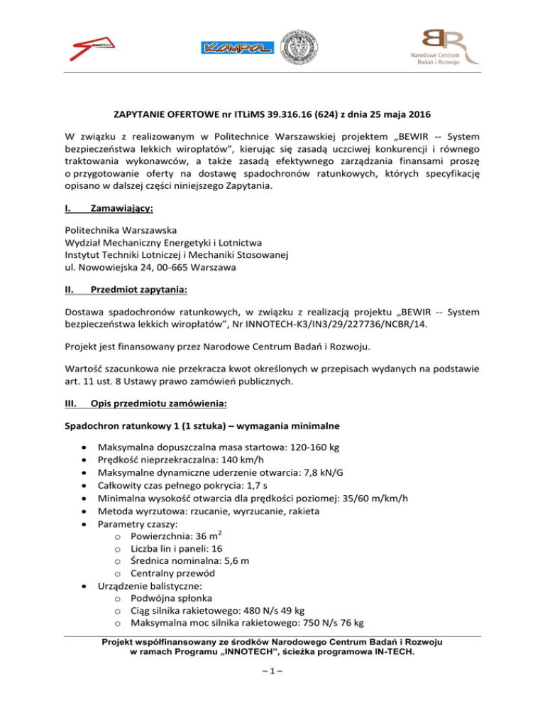 ZAPYTANIE OFERTOWE nr ITLiMS 39.316.16 (624) z dnia 25 maja 2016 W związku z realizowanym w Politechnice Warszawskiej projektem „BEWIR -- System bezpieczeostwa lekkich wiropłatów”, kierując się zasadą uczciwej konkurencji i równego traktowania wykonawców, a także zasadą efektywnego zarządzania finansami proszę o przygotowanie oferty na dostawę spadochronów ratunkowych, których specyfikację opisano w dalszej części niniejszego Zapytania. I. Zamawiający: Politechnika Warszawska Wydział Mechaniczny Energetyki i Lotnictwa Instytut Techniki Lotniczej i Mechaniki Stosowanej ul. Nowowiejska 24, 00-665 Warszawa II. Przedmiot zapytania: Dostawa spadochronów ratunkowych, w związku z realizacją projektu „BEWIR -- System bezpieczeostwa lekkich wiropłatów”, Nr INNOTECH-K3/IN3/29/227736/NCBR/14. Projekt jest finansowany przez Narodowe Centrum Badao i Rozwoju. Wartośd szacunkowa nie przekracza kwot określonych w przepisach wydanych na podstawie art. 11 ust. 8 Ustawy prawo zamówieo publicznych. III. Opis przedmiotu zamówienia: Spadochron ratunkowy 1 (1 sztuka) – wymagania minimalne Maksymalna dopuszczalna masa startowa: 120-160 kg Prędkośd nieprzekraczalna: 140 km/h Maksymalne dynamiczne uderzenie otwarcia: 7,8 kN/G Całkowity czas pełnego pokrycia: 1,7 s Minimalna wysokośd otwarcia dla prędkości poziomej: 35/60 m/km/h Metoda wyrzutowa: rzucanie, wyrzucanie, rakieta Parametry czaszy: o Powierzchnia: 36 m2 o Liczba lin i paneli: 16 o Średnica nominalna: 5,6 m o Centralny przewód Urządzenie balistyczne: o Podwójna spłonka o Ciąg silnika rakietowego: 480 N/s 49 kg o Maksymalna moc silnika rakietowego: 750 N/s 76 kg Projekt współfinansowany ze środków Narodowego Centrum Badań i Rozwoju w ramach Programu „INNOTECH”, ścieżka programowa IN-TECH. –1– o Masa urządzenia balistycznego: 2 kg o Czas spalania (w temp. -40oC - +60oC) – 1 s ±0,2s Wymiary: o Soft pack: 28x23x11 cm Masa całkowita 2,5 kg (soft pack), 4,5 kg (z modułem miotającym) Urządzenie spełniające wymagania: GRS 2/160 Spadochron ratunkowy 2 (1 sztuka) – wymagania minimalne Maksymalna dopuszczalna masa startowa: 560 kg Prędkośd nieprzekraczalna: 225 km/h Maksymalne dynamiczne uderzenie otwarcia: 24 kN/G Całkowity czas pełnego pokrycia: 3,0 - 4,0 s Opadanie rejestrowane: 6,8 m/s Maksymalna odpornośd na baldachim: 570 kg przy 190 km/h Maksymalne działanie dynamiczne: 26,0 kN Minimalna wysokośd otwarcia dla prędkości poziomej: 70/45 m/km/h Metoda wyrzutowa: container, krótki rękaw Parametry czaszy: o Powierzchnia: 115 m2 o Liczba lin i paneli: 26 o Średnica nominalna: 10,4 m o Slider Urządzenie balistyczne: o Podwójna spłonka o Ciąg silnika rakietowego: 670 N/s 68 kg o Maksymalna moc silnika rakietowego: 930 N/s 94 kg o Masa urządzenia balistycznego: 2,62 kg o Czas spalania (w temp. -40oC - +60oC) – 1 s ± 0,2s Wymiary: o Soft pack: 16,5x25x54 cm Masa całkowita 13,3 kg (soft pack), lina wyciągająca 5,5m, 0,74 kg Urządzenie spełniające wymagania: GRS 5/560 GYRO Projekt współfinansowany ze środków Narodowego Centrum Badań i Rozwoju w ramach Programu „INNOTECH”, ścieżka programowa IN-TECH. –2– IV. Wymagania wobec oferenta: Oferent na potwierdzenie spełnienia warunków udziału w postępowaniu składa wraz z ofertą następujące dokumenty i oświadczenia: 1) oryginał oświadczenia potwierdzającego spełnienie przez Oferenta warunków określonych w art. 22 ust. 1 Ustawy, sporządzone wg wzoru stanowiącego załącznik nr 2 do niniejszego Zapytania; 2) aktualny odpis z właściwego rejestru lub centralnej ewidencji i informacji o działalności gospodarczej, jeżeli odrębne przepisy wymagają wpisu do rejestru lub ewidencji, w celu wykazania braku podstaw do wykluczenia w oparciu o art. 24 ust. 1 pkt 2 Ustawy, wystawione nie wcześniej niż 6 miesięcy przed upływem terminu składania ofert. V. Termin wykonania oferty: 30 dni od podpisania umowy VI. Termin i miejsce składania ofert: Oferty należy składad w formie pisemnej do dnia 6 czerwca 2015 roku, do godziny 12:00 (oferty złożone po tym terminie zostaną zwrócone niezwłocznie bez otwierania, zgodnie z treścią art. 84 ust. 2 Ustawy). Opakowanie zawierające ofertę wraz z wszystkimi wymaganymi oświadczeniami i dokumentami winno byd oznaczone nazwą (firmą) i adresem Oferenta i zaadresowane do Zamawiającego –adres: Politechnika Warszawska Instytut Techniki Lotniczej i Mechaniki Stosowanej 00-665 Warszawa , ul. Nowowiejska 24, pokój pok. 121. z dopiskiem: Oferta na dostawę spadochronów ratunkowych Nie otwierad przed dniem 6 czerwca 2016 r., godz. 12:00 VII. Kryteria oceny oferty Wybór oferty zostanie dokonany na podstawie jednego kryterium – ceny oferty. Wzór określający kryterium wyboru ma postad: Liczba punktów = (cena minimalna / cena ofertowa) * 100 pkt. Projekt współfinansowany ze środków Narodowego Centrum Badań i Rozwoju w ramach Programu „INNOTECH”, ścieżka programowa IN-TECH. –3– Za najkorzystniejszą zostanie uznana oferta, która nie podlega odrzuceniu oraz uzyska największą liczbę punktów . Pod uwagę będą brane liczby po zaokrągleniu do dwóch miejsc po przecinku. Jeżeli w postępowaniu o udzielenie zamówienia, w którym jedynym kryterium oceny ofert jest cena, nie można dokonad wyboru oferty najkorzystniejszej ze względu na to, że zostały złożone oferty o takiej samej cenie, Zamawiający wezwie Wykonawców, którzy złożyli te oferty do złożenia w terminie określonym przez Zamawiającego ofert dodatkowych. Wykonawcy, którzy złożą ofert dodatkowe nie mogą zaoferowad cen wyższych niż zaoferowane w złożonych ofertach. Załączniki: Załącznik nr 1 - Projekt istotnych postanowieo umowy Załącznik nr 2 - Formularz oferty Załącznik nr 3 - Szczegółowa specyfikacja techniczna Projekt współfinansowany ze środków Narodowego Centrum Badań i Rozwoju w ramach Programu „INNOTECH”, ścieżka programowa IN-TE