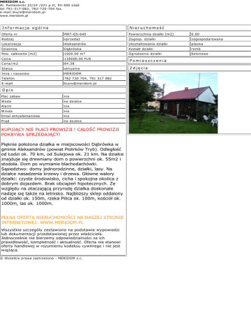MERIDOM s.c. Al. Politechniki 22/24 /221 p.II, 93-590 Łódź tel.791-317-082, 782-720-704 fax. e-mail:[email protected] www.meridom.pl Informacje ogólne Nieruchomość Oferta nr MRT-GS-640 Powierzchnia działki [m2] 0.00 Rodzaj sprzedaż Zagosp. działki zagospodarowana Lokalizacja Aleksandrów Ukształtowanie działki płaska Dzielnica Dąbrówka Kształt działki romb Pow. całkowita [m2] 1600.00 m² Ogrodzenie działki betonowe Cena 135000.00 PLN Cena/m2 84.38 Status aktualna Imię i nazwisko MERIDOM Telefon 782 720 704, 791 317 082 E-mail [email protected] Opis Plac zabaw nie Woda na działce Alarm nie Winda nie Drzwi antywłamaniowe nie Prąd na działce KUPUJĄCY NIE PŁACI PROWIZJI ! CAŁOŚĆ PROWIZJI POKRYWA SPRZEDAJĄCY! Pięknie położona działka w miejscowości Dąbrówka w gminie Aleksandrów (powiat Piotrków Tryb). Odległość od Łodzi ok. 70 km, od Sulejowa ok. 21 km. Na działce znajduje się drewniany dom o powierzchni ok. 55m2 i stodoła. Dom po wymianie blachodachówki. Sąsiedztwo: domy jednorodzinne, działki, lasy. Na działce nasadzenia krzewy i drzewa. Główne walory działki: czyste środowisko, cicha i spokojna okolica z dobrym dojazdem. Brak obciążeń hipotecznych. Ze względu na otaczającą przyrodę działka doskonale nadaje się także na letnisko. Najbliższy sklep oddalony od działki ok. 150m, rzeka Pilica ok. 100m, kościół ok. 1000m, las ok. 1000m. PEŁNA OFERTA NIERUCHOMOŚCI NA NASZEJ STRONIE INTERNETOWEJ: WWW.MERIDOM.PL Wszystkie szczegóły zestawiono na podstawie wypowiedzi lub dokumentacji przedstawionej przez właściciela. Jednocześnie nie bierzemy odpowiedzialności za ich prawidłowość, kompletność i aktualność. Oferta nie stanowi oferty handlowej w rozumieniu kodeksu cywilnego i nie jest wiążąca. © Wszelkie prawa zastrzeżone - MERIDOM s.c. Pomieszczenia Zdjęcia