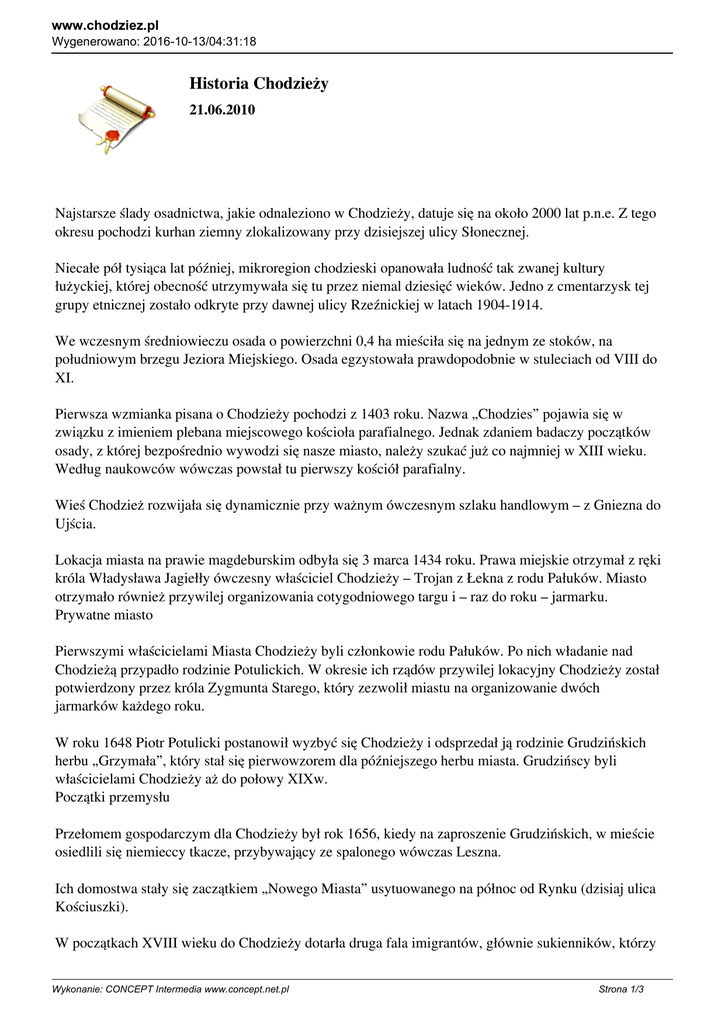 www.chodziez.pl Wygenerowano: 2016-10-13/04:31:18 Historia Chodzieży 21.06.2010 Najstarsze ślady osadnictwa, jakie odnaleziono w Chodzieży, datuje się na około 2000 lat p.n.e. Z tego okresu pochodzi kurhan ziemny zlokalizowany przy dzisiejszej ulicy Słonecznej. Niecałe pół tysiąca lat później, mikroregion chodzieski opanowała ludność tak zwanej kultury łużyckiej, której obecność utrzymywała się tu przez niemal dziesięć wieków. Jedno z cmentarzysk tej grupy etnicznej zostało odkryte przy dawnej ulicy Rzeźnickiej w latach 1904-1914. We wczesnym średniowieczu osada o powierzchni 0,4 ha mieściła się na jednym ze stoków, na południowym brzegu Jeziora Miejskiego. Osada egzystowała prawdopodobnie w stuleciach od VIII do XI. Pierwsza wzmianka pisana o Chodzieży pochodzi z 1403 roku. Nazwa „Chodzies” pojawia się w związku z imieniem plebana miejscowego kościoła parafialnego. Jednak zdaniem badaczy początków osady, z której bezpośrednio wywodzi się nasze miasto, należy szukać już co najmniej w XIII wieku. Według naukowców wówczas powstał tu pierwszy kościół parafialny. Wieś Chodzież rozwijała się dynamicznie przy ważnym ówczesnym szlaku handlowym – z Gniezna do Ujścia. Lokacja miasta na prawie magdeburskim odbyła się 3 marca 1434 roku. Prawa miejskie otrzymał z ręki króla Władysława Jagiełły ówczesny właściciel Chodzieży – Trojan z Łekna z rodu Pałuków. Miasto otrzymało również przywilej organizowania cotygodniowego targu i – raz do roku – jarmarku. Prywatne miasto Pierwszymi właścicielami Miasta Chodzieży byli członkowie rodu Pałuków. Po nich władanie nad Chodzieżą przypadło rodzinie Potulickich. W okresie ich rządów przywilej lokacyjny Chodzieży został potwierdzony przez króla Zygmunta Starego, który zezwolił miastu na organizowanie dwóch jarmarków każdego roku. W roku 1648 Piotr Potulicki postanowił wyzbyć się Chodzieży i odsprzedał ją rodzinie Grudzińskich herbu „Grzymała”, który stał się pierwowzorem dla późniejszego herbu miasta. Grudzińscy byli właścicielami Chodzieży aż do połowy XIXw. Początki przemysłu Przełomem gospodarczym dla Chodzieży był rok 1656, kiedy na zaproszenie Grudzińskich, w mieście osiedlili się niemieccy tkacze, przybywający ze spalonego wówczas Leszna. Ich domostwa stały się zaczątkiem „Nowego Miasta” usytuowanego na północ od Rynku (dzisiaj ulica Kościuszki). W początkach XVIII wieku do Chodzieży dotarła druga fala imigrantów, głównie sukienników, którzy Wykonanie: CONCEPT Intermedia www.concept.net.pl Strona 1/3 www.chodziez.pl Wygenerowano: 2016-10-13/04:31:18 po okresie dżumy szalejącej w Wielkopolsce w latach 1709-1710, znaleźli schronienie właśnie na chodzieskim Nowym Mieście. Zwarta zabudowa rzemieślnicza, jaką rozwijali utworzyła z czasem „przemysłowe” osiedle tkaczy. Rewolucja przemysłowa rozpoczęła się w Chodzieży w roku 1805, kiedy miejscowi sukiennicy sprowadzili z Berlina pierwszą maszynę do tkania i czesania sukna. Od miasta włókienników przez miasto porcelany do miasta turystyki Po pierwszym rozbiorze Polski, w 1773 roku, Chodzież znalazła się w granicach państwa pruskiego. W obrębie Prus miasto pozostało również po utworzeniu Królestwa Kongresowego. Taka przynależność spowodowała niekorzystną sytuację ekonomiczną, w związku z którą chodziescy tkacze stopniowo emigrowali w rejon Łodzi. W latach 1848-1886 właścicielem Chodzieży był Otto Koenigsmarck, który zapisał się tym w historii miasta, że sprzedał chodzieski zamek dwom niemieckim kupcom – Ludwikowi Schnorrowi i Hermanowi Mullerowi z Frankfurtu nad Odrą. Nowi posiadacze zamku Grudzińskich wybudowali w jego obrębie fabrykę fajansu. Odtąd – to jest od roku 1855 – rozwój Chodzieży był ściśle skorelowany z produkcją ceramiczną. Proces rozwoju nabrał tempa wraz z uruchomieniem linii kolejowej Poznań-Chodzież-Piła w roku 1878. W dziewiętnaście lat później otwarto w mieście fabrykę porcelany. Chodzież powróciła do Polski w wyniku działań zbrojnych Powstania Wielkopolskiego w roku 1920 – po 140 latach pruskiej niewoli. Stopniowo zaczęło się przejmowanie mienia z rąk niemieckich. Fabryka fajansu została odkupiona przez Stanisława Mańczaka w roku 1921 od koncernu „Annaburger Steinguttfabrik.” Od tego czasu, poza okresem załamania w latach 1932 -1936, fabryka notowała stały wzrost zarówno zatrudnienia, jak i produkcji. Swój najlepszy okres chodzieska ceramika przeżywała w latach 70' ubiegłego stulecia. Działające wówczas trzy państwowe zakłady Porcelany i Porcelitu zatrudniały blisko szóstą część mieszkańców miasta, które w tym okresie zdobyło tytuł Krajowego Mistrza Gospodarności i dwukrotnie tytuł wicemistrzowski. XXI wieku nie dotrwał zakład porcelitu. Fabryki porcelany sprywatyzowano, w wyniku czego w Chodzieży działają obecnie dwa duże zakłady produkujące ceramikę – Porcelana Chodzież S.A. i Stamar S.A. Obydwa należą do największych przedsiębiorstw przemysłowych miasta. Nowe stulecie rozpoczyna się dla Chodzieży, jako era turystyki. Właśnie na tę dziedzinę gospodarki stawia uchwalona przez Radę Miejską „Strategia rozwoju społeczno-gospodarczego...” Władze miasta współpracują z prywatnymi przedsiębiorcami i wspólnie przeprowadzają inwestycje wykorzystujące wielki potencjał turystyczno-rekreacyjny Chodzieży. Piękno okolicy oraz doskonałe warunki do uprawiania narciarstwa (Góra Talerz to najdłuższy stok pomiędzy Bałtykiem, a Karkonoszami, liczący około 600m), żeglarstwa, turystyki rowerowej i pieszej, wspierane są dbałością o ekologię. Miasto posiada nowoczesna oczyszczalnię ścieków, stację uzdatniania wody i scentralizowany system grzewczy, którego kotłownia zaopatrzona jest w wysokiej klasy filtry. Wykonanie: CONCEPT Intermedia www.concept.net.pl Strona 2/3 www.chodzi