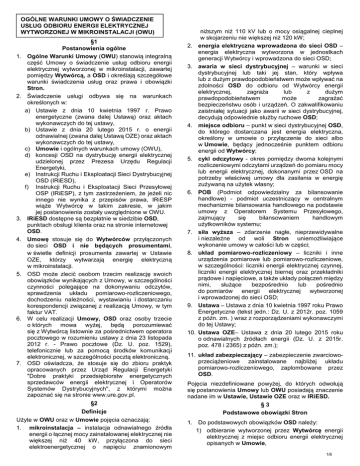 OGÓLNE WARUNKI UMOWY O ŚWIADCZENIE USŁUG ODBIORU ENERGII ELEKTRYCZNEJ WYTWORZONEJ W MIKROINSTALACJI (OWU) 1. 2. 3. 4. 5. 6. 7. §1 Postanowienia ogólne Ogólne Warunki Umowy (OWU) stanowią integralną część Umowy o świadczenie usług odbioru energii elektrycznej wytworzonej w mikroinstalacji, zawartej pomiędzy Wytwórcą, a OSD i określają szczegółowe warunki świadczenia usług oraz prawa i obowiązki Stron. Świadczenie usługi odbywa się na warunkach określonych w: a) Ustawie z dnia 10 kwietnia 1997 r. Prawo energetyczne (zwana dalej Ustawą) oraz aktach wykonawczych do tej ustawy, b) Ustawie z dnia 20 lutego 2015 r. o energii odnawialnej (zwana dalej Ustawą OZE) oraz aktach wykonawczych do tej ustawy, c) Umowie i ogólnych warunkach umowy (OWU), d) koncesji OSD na dystrybucję energii elektrycznej udzielonej przez Prezesa Urzędu Regulacji Energetyki, e) Instrukcji Ruchu i Eksploatacji Sieci Dystrybucyjnej OSD (IRiESD), f) Instrukcji Ruchu i Eksploatacji Sieci Przesyłowej OSP (IRiESP), z tym zastrzeżeniem, że jeżeli nic innego nie wynika z przepisów prawa, IRiESP wiąże Wytwórcę w takim zakresie, w jakim jej postanowienia zostały uwzględnione w OWU. IRiESD dostępne są bezpłatnie w siedzibie OSD, punktach obsługi klienta oraz na stronie internetowej OSD. Umowę stosuje się do Wytwórców przyłączonych do sieci OSD i nie będących prosumentami, w świetle definicji prosumenta zawartej w Ustawie OZE, którzy wytwarzają energię elektryczną w mikroinstalacji. OSD może zlecić osobom trzecim realizację swoich obowiązków wynikających z Umowy, w szczególności czynności polegające na dokonywaniu odczytów, sprawdzenia układu pomiarowo-rozliczeniowego, dochodzeniu należności, wystawianiu i dostarczaniu korespondencji związanej z realizacją Umowy, w tym faktur VAT. W celu realizacji Umowy, OSD oraz osoby trzecie o których mowa wyżej, będą porozumiewać się z Wytwórcą listownie za pośrednictwem operatora pocztowego w rozumieniu ustawy z dnia 23 listopada 2012 r. - Prawo pocztowe (Dz. U. poz. 1529), telefonicznie lub za pomocą środków komunikacji elektronicznej, w szczególności pocztą elektroniczną. OSD oświadcza, że stosuje się do zbioru praktyk opracowanych przez Urząd Regulacji Energetyki "Dobre praktyki przedsiębiorstw energetycznych sprzedawców energii elektrycznej i Operatorów Systemów Dystrybucyjnych", z którymi można zapoznać się na stronie www.ure.gov.pl. §2 Definicje Użyte w OWU oraz w Umowie pojęcia oznaczają: 1. mikroinstalacja – instalacja odnawialnego źródła energii o łącznej mocy zainstalowanej elektrycznej nie większej niż 40 kW, przyłączona do sieci elektroenergetycznej o napięciu znamionowym 2. 3. 4. 5. 6. 7. 8. 9. 10. niższym niż 110 kV lub o mocy osiągalnej cieplnej w skojarzeniu nie większej niż 120 kW; energia elektryczna wprowadzona do sieci OSD – energia elektryczna wytworzona w jednostkach generacji Wytwórcy i wprowadzona do sieci OSD; awaria w sieci dystrybucyjnej – warunki w sieci dystrybucyjnej lub taki jej stan, który wpływa lub z dużym prawdopodobieństwem może wpływać na zdolności OSD do odbioru od Wytwórcy energii elektrycznej, zagraża lub z dużym prawdopodobieństwem może zagrażać bezpieczeństwu osób i urządzeń. O zakwalifikowaniu zaistniałej sytuacji jako awarii w sieci dystrybucyjnej, decydują odpowiednie służby ruchowe OSD; miejsce odbioru – punkt w sieci dystrybucyjnej OSD, do którego dostarczana jest energia elektryczna, określony w umowie o przyłączenie do sieci albo w Umowie, będący jednocześnie punktem odbioru energii od Wytwórcy; cykl odczytowy - okres pomiędzy dwoma kolejnymi rozliczeniowymi odczytami urządzeń do pomiaru mocy lub energii elektrycznej, dokonanymi przez OSD na potrzeby właściwej umowy dla zasilania w energię zużywaną na użytek własny; POB (Podmiot odpowiedzialny za bilansowanie handlowe) - podmiot uczestniczący w centralnym mechanizmie bilansowania handlowego na podstawie umowy z Operatorem Systemu Przesyłowego, zajmujący się bilansowaniem handlowym użytkowników systemu; siła wyższa – zdarzenie nagłe, nieprzewidywalne i niezależne od woli Stron uniemożliwiające wykonanie umowy w całości lub w części; układ pomiarowo-rozliczeniowy – liczniki i inne urządzenia pomiarowe lub pomiarowo-rozliczeniowe, w szczególności: liczniki energii elektrycznej czynnej, liczniki energii elektrycznej biernej oraz przekładniki prądowe i napięciowe, a także układy połączeń między nimi, służące bezpośrednio lub pośrednio do pomiarów energii elektrycznej wytworzonej i wprowadzonej do sieci OSD; Ustawa – Ustawa z dnia 10 kwietnia 1997 roku Prawo Energetyczne (tekst jedn.: Dz. U. z 2012r. poz. 1059 z późn. zm. ) wraz z rozporządzeniami wykonawczymi do tej Ustawy; Ustawa OZE– Ustawa z dnia 20 lutego 2015 roku o odnawialnych źródłach energii (Dz. U. z 2015r. poz. 478 i 2365) z późn. zm.); 11. układ zabezpieczający – zabezpieczenie zwarciowoprzeciążeniowe zainstalowane najbliżej układu pomiarowo-rozliczeniowego, zaplombowane przez OSD. Pojęcia niezdefiniowane powyżej, do których odwołują się postanowienia Umowy lub OWU posiadają znaczenie nadane im w Ustawie, Ustawie OZE oraz w IRiESD. §3 Podstawowe obowiązki Stron 1. Do podstawowych obowiązków OSD należy: 1) odbieranie wytworzonej przez Wytwórcę energii elektrycznej z miejsc odbioru energii elektrycznej opisanych w Umowie, 1/6 2) przyjmowanie zgłoszeń zmiany POB Wytwórcy, 3) dokonywanie odczytów i ustalania ilości energii elektrycznej wprowadzonej do sieci OSD, 4) potwierdzanie na wnioskach Wytwórcy ilości energii elektrycznej wprowadzanej przez Wytwórcę do sieci OSD, w celu uzyskania przez Wytwórcę gwarancji pochodzenia energii elektrycznej, 5) przekazywanie danych pomiarowych sprzedawcy oraz podmiotowi odpowiedzialnemu za bilansowanie handlowe Wytwórcy, 6) przekazywanie Wytwórcy informac