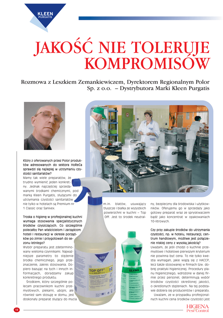 JAKOŚĆ NIE TOLERUJE KOMPROMISÓW Rozmowa z Leszkiem Zemankiewiczem, Dyrektorem Regionalnym Polor Sp. z o.o. – Dystrybutora Marki Kleen Purgatis Który z oferowanych przez Polor produk tów adresowanych do sektora HoReCa sprawdzi się najlepiej w utrzymaniu czy stości sanitariatów? Mamy tak wiele preparatów, że trudno wymienić jeden konkretny. Jednak najczęściej sprzedawanymi środkami chemicznymi, pod marką Kleen Purgatis, służącymi do utrzymania czystości sanitariatów nie tylko w hotelach są Premium nr m.in. usuwający ny, bezpieczny dla środowiska i użytkow- 1 Classic oraz Sanivex. tłuszcze i białka ze wszystkich ników. Oferujemy go w sprzedaży jako powierzchni w kuchni – Top gotowy preparat wraz ze spryskiwaczem Off. Jest to środek neutral- bądź jako koncentrat w opakowaniach Troska o higienę w profesjonalnej kuchni wymaga stosowania specjalistycznych blatów, 10-litrowych. środków czyszczących. Co szczególnie polecałby Pan właścicielom i zarządcom Czy przy zakupie środków do utrzymania hoteli i restauracji w okresie porząd - czystości, np. w hotelu, restauracji, cen - ków po zimie i przygotowań do se - trum handlowym, możliwe jest połącze - zonu letniego? nie niskiej ceny z wysoką jakością? Wybór preparatu jest zdetermino- Uważam, że jeśli chodzi o kuchnie prze- wany wieloma czynnikami. Najważ- mysłowe i hotelowe pierwszym kryterium niejsze stężenie nie powinna być cena. To nie tylko kwe- środka chemicznego, jego prze- stia wymagań, jakie wiążą się z HACCP, znaczenie, zakres stosowania. Do- lecz także stosowanej w firmach tzw. do- piero bazując na tych i innych in- brej praktyki higienicznej. Procedury pla- formacjach, nu higienicznego, wdrożone w danej fir- parametry to doradzamy zakup konkretnego produktu. środków czystości określonej jakości, lecam pracownikom kuchni prze- o określonych stężeniach. Na tej podsta- mysłowych, piekarni, ubojni, ale wie dobiera się producentów i preparaty. również sam stosuję w domu, jest doskonały preparat służący do mycia 12 mie przez personel, determinują wybór Środkiem, który szczególnie po- Uważam, ze w przypadku profesjonalnych kuchni cena środków czystości jest HIGIENA & Pest Control sprawą ważną, ale nie pierwszorzędną. teli czy restauracji priorytetem. Z do- Prawdziwą rewelacją są nowe pady Zaopatrywanie się w supermarketach świadczenia wiem, ze jeśli personel ma czyszczące, przeznaczone do maszyno- jest w efekcie kosztowniejsze niż nawią- jasno wytyczone procedury, zakres obo- wego i ręcznego czyszczenia podłóg, po- zanie stałej współpracy z profesjonalny- wiązków, plan higieny – wówczas się do wstałe na bazie naturalnych składników, mi dostawcami produktów czystościo- nich stosuje. Z kolei jeśli chodzi o firmę Polor, za- wych. trudniamy tylko fachowców, ponieważ Czy mogą Państwo liczyć na lojalność nie wyobrażam sobie jakichkolwiek kom- klientów? promisów w tej materii. Nie zajmujemy Jest wielu producentów i dostawców się przypadkową sprzedażą. Nasi han- środków czystościowych w kraju i za gra- dlowcy są wyposażeni w wiedzę i służą nicą. Przywiązanie klienta do marki jest kompetentną radą klientom, a nasze pro- zazwyczaj wynikiem jego wyjątkowego dukty są certyfikowane – w pełni bez- zadowolenia z użytkowania danego pre- pieczne i profesjonalne. Celem firmy Po- paratu oraz faktu, że legitymuje się on lor jest nie tylko sprzedaż preparatów, wymaganymi atestami, dokumentami, lecz może przede wszystkim komplekso- a zatem spełnia wymogi jakościowe i sa- wa obsługa w zakresie rozwiązywania nitarne. Jeśli do tego ma w miarę przy- problemów higienicznych – tworzenie stępną cenę, klient nie ma powodu, by długofalowej strategii rozwoju współpra- zmieniać dystrybutora. Nie dotyczy to cy z naszą firmą. oczywiście przypadku przetargów w jednostkach gospodarczych z udziałem Czy w najbliższym czasie pojawią się Skarbu Państwa, gdzie nie ma mowy ani w ofercie Polor nowości produktowe? o lojalności, ani wyborze właściwej ofer- Producent – marka Kleen – zmienił ostat- ty. Decyduje tylko cena. nio design i tworzywo, z którego wykonane są litrowe opakowania preparatów. A jak Pan ocenia kierunek zmian na rynku Zmiana środków do utrzymania czystości? wszystkim troską o środowisko naturalne W porównaniu do lat 90., kiedy zaczyna- – opakowania łatwiej poddają się recy- łem pracę w tym zawodzie, zmieniło się klingowi i są tańsze w produkcji. uwarunkowana była przede bardzo wiele. Przede wszystkim rozbudo- Jeśli chodzi o nowości produktowe, to wano w Polsce bazę hotelową oraz re- wprowadzamy je systematycznie. Doty- stauracyjną, na korzyść zmieniła się rów- czy to preparatów chemicznych, ale nie eliminujące w znacznym stopniu koniecz- nież jakość obsługi. Przy czym trzeba tylko. ność stosowania chemikaliów. Jest to podkreślić, że nie wszyscy właści- sprzęt ekologiczny i ekonomicz- ciele i administratorzy tego typu ny. Odpowiada światowym ten- obiektów zdają sobie w pełni dencjom do stosowania środ- sprawę ze złożoności zagadnie- ków nia, jakim jest obsługa gości. Nie również każdy bierze pod uwagę fakt, że nadmiernych ilości szkodliwych gra toczy się o zdrowie i życie lu- substancji chemicznych. Zainte- dzi, ich bezpieczeństwo, a nie wy- resowanych odsyłam do odwie- strój i standard lokalu. Stąd, dzenia zwłaszcza w mniejszych obiektach www.brudnyharry.pl biodegradowalnych, redukcji strony jak stosowania internetowej – motelach, pensjonatach – zdarza się, ze jest brudno lub sprząta W jakim kierunku i z myślą się nadal domowymi sposobami. o której z branż chcą Państwo Natomiast, na szczęście, w przy- rozwijać swój asortyment pro - padku dużych hoteli standardy duktów i usług w 2010 roku? przeważnie nie odbiegają od eu- Największe pole do popisu ma- ropejskich. my w odniesieniu