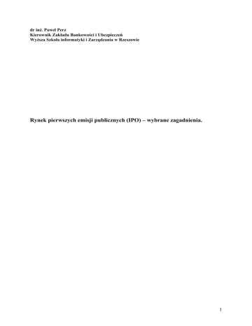 dr inż. Paweł Perz Kierownik Zakładu Bankowości i Ubezpieczeń Wyższa Szkoła informatyki i Zarządzania w Rzeszowie Rynek pierwszych emisji publicznych (IPO) – wybrane zagadnienia. 1 Wprowadzenie W literaturze poświęconej rynkom finansowym wiele miejsca zajmują zagadnienia związane z pierwszymi publicznymi ofertami akcji (IPO). Rozważania koncentrują się wokół dwóch problemów. Pierwszy dotyczy ceny, po jakiej sprzedawane są akcje w ramach IPO, ceny ich giełdowego debiutu oraz zachowania się kursów akcji IPO na giełdzie. Drugi dotyczy motywów, jakimi kierują się spółki decydując się na publiczną emisję akcji, oraz konsekwencji finansowych przeprowadzonych emisji. Z pewnością impulsem, który pobudził tak szeroką dyskusję na temat IPO, jest zaobserwowanie kilku niełatwych do jednoznacznego wyjaśnienia zjawisk. Empirycznie stwierdzono bowiem następujące fakty: − akcje kupione w ramach IPO i sprzedane w dniu ich giełdowego debiutu dają ponadprzeciętne stopy zwrotu. Zjawisko to występuje od wielu lat, na większości rynków finansowych, − w długim okresie czasu (do 5 lat) akcje debiutującego IPO kupione w trakcie pierwszego ich notowania na giełdzie zachowują się znacznie gorzej niż inne obarczone podobnym ryzykiem papiery wartościowe, − aktywność w ramach emisji pierwotnych wykazuje znaczne wahania pod względem ilości przeprowadzanych emisji, przy czym w stosunkowo krótkim okresie czasu wiele spółek o podobnym profilu decyduje się na przeprowadzenie swoich IPO. Niniejszy artykuł jest próbą przybliżenia najistotniejszych faktów i teorii próbujących wyjaśnić opisywane zjawiska. Swoją uwagę w artykule koncentruje przed wszystkim na efekcie ponadprzeciętnej stopy zwrotu z IPO, przedstawiając wyniki badań z rynku polskiego. Zdaniem autora, przy próbach wyjaśniania niektórych z tych zagadnień warto zwrócić uwagę na rzadko poruszane kwestie związane z kosztami pełnomocnictwa oraz na znany z finansów behawioralnych efekt dyspozycji. Ponadprzeciętna stopa zwrotu z IPO Dane empiryczne wskazują na zjawisko niedowartościowania akcji sprzedawanych w ramach IPO. Badania były prowadzone w różnych krajach i praktycznie na wszystkich rynkach zaobserwowano to zjawisko, przy czym w poszczególnych krajach stopy zwrotu dla pierwszego notowania są mocno zróżnicowane. Najobszerniejsze badania prowadzone dla rynku amerykańskiego w latach 19601996 na próbce 13 308 IPO pokazują, iż średnia stopa zwrotu z tych ofert wynosi 15,8%1. W tabeli zostały zestawione niektóre wyniki badań prowadzonych w różnych krajach. Dane mogłyby sugerować, iż zjawisko niedowartościowania IPO jest mocniejsze w krajach należących do rynków wschodzących (emerging markets) niż na rynkach dojrzałych. Niemniej jednak wszystkie powyższe badania powinny być traktowane z pewną ostrożnością ze względu na to, iż próby badawcze w poszczególnych krajach bardzo się od siebie różnią (pod względem ilości badanych spółek i okresu, w którym były przeprowadzane). Ponadto w przypadku niewielkich prób kilka ofert dających nieproporcjonalne wysokie stopy zwrotu może spowodować duży wzrost średniej stopy zwrotu dla całej próby. Tab. 1. Średnie stopy zwrotu z IPO w różnych krajach. kraj USA Wielka Brytania Niemcy Chiny Grecja Korea Malezja Singapur autor/autorzy badania wielkość badanej próby Rynki dojrzałe badany okres Ibbotson, Sindelar, 13 308 1960-1996 Ritter Dimson 2 133 1959-1990 Ljungqvist 170 1978-1992 Wybrane emerging markets Datar, Mao 226 1989-1996 Kazantzis, Levis 79 1987-1991 Dhatt, kim, Lim 347 1980-1990 Isa 132 1980-1991 Lee, Taylor, 128 1973-1992 Wlater średnia stopa zwrotu w % 15,8 12,0 10,9 388,0 48,5 78,1 80,3 31,4 1 T. Loughran, J. Ritter, K. Rydqvist, Initial public offerings: International insights, „Pacific-Basin Finance Journal” 1994, 2. 2 Tajwan Turcja Chen Kiymaz 168 138 1971-1990 1990-1995 45,0 13,6 Źródło: T. Loughran, J. Ritter, K. Rydquist, op.cit. Badania prowadzone przez Rittera i Welcha2 wskazują, iż stopy zwrotu są bardzo zróżnicowane w czasie. Na przykład w latach 1999-2000 w grupie 803 IPO średnia stopa zwrotu wyniosła aż 65%. Na podstawie tych samych badań średnia dla rynku amerykańskiego z lat 1980-2001 obliczona dla próby 6 249 IPO wynosi 18,8%. W całym okresie objętym badaniem jedynie 14% pierwszych emisji publicznych debiutujących na giełdzie przyniosło inwestorom straty, 70% IPO zadebiutowało na giełdzie z ceną wyższą od ceny emisyjnej. Szczegółowe dane zaprezentowane zostały na wykresie. Wykres 1. Liczba pierwszych ofert publicznych i średnia stopa zwrotu z pierwszego notowania akcji sprzedawanych w IPO w USA w latach 1980-2001. 7000 70,0% 6000 60,0% 5000 50,0% 4000 40,0% 3000 30,0% 2000 20,0% 1000 10,0% 0 Stopa zwrotu z akcji sprzedawanych w ramach IPO w pierwszym dniu notowań Liczba IPO Liczba i średnia stopa zwrotu z IPO w USA w latach 1980-2001 0,0% 1980-1989 1990-1994 1995-1998 1999-2000 2001 1980-2001 Źródło: J.R. Ritter, I. Welch, A Review of IPO Activity, Pricing and Allocations, “The Journal of Finance” 2002, nr 4. W wielu przypadkach stopy zwrotu z ofert pierwotnych były zaskakująco wysokie. W grudniu 1999 r. akcje Linux sprzedane w IPO po cenie 30 $, na zamknięcie następnego dnia kosztowały 239,25 $, dając 698% dziennej stopy zwrotu. Podobnie akcje firmy theglobe.com sprzedawane po cenie 9 $ następnego dnia osiągnęły cenę 97 $ (na zamknięciu cena spadła do poziomu 63,5 $)3. W Polsce w 1994 r. akcje Banku Śląskiego przyniosły inwestorom stopę zwrotu przekraczającą 1200%. Dla rynku polskiego badania4 prowadzone na próbce 196 ofert pierwotnych w latach 1991-2000 dają wartość 68%. Autor badań, D. Sukacz, dla podniesienie istotności statystycznej badań usunął 2 J.R. Ritter, I. Welch, A Review of IPO Activity, Pricing and Allocations, „The Journal of Finance” 2002, 4. Z. Bodie, A. Kane, 