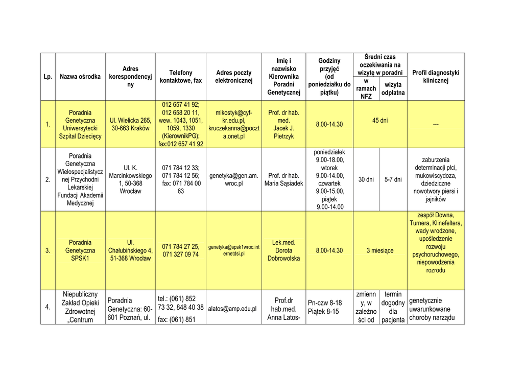 Adres korespondencyj ny Telefony kontaktowe, fax Ul. Wielicka 265, 30-663 Kraków 012 657 41 92; 012 658 20 11, mikostyk@cyfwew. 1043, 1051, kr.edu.pl, 1059, 1330 kruczekanna@poczt (KierownikPG); a.onet.pl fax:012 657 41 92 Lp. Nazwa ośrodka 1. Poradnia Genetyczna Uniwersytecki Szpital Dziecięcy 2. Poradnia Genetyczna Ul. K. Wielospecjalistycz Marcinkowskiego nej Przychodni 1, 50-368 Lekarskiej Wrocław Fundacji Akademii Medycznej 3. Poradnia Genetyczna SPSK1 4. Niepubliczny Zakład Opieki Zdrowotnej „Centrum Ul. Chałubińskiego 4, 51-368 Wrocław 071 784 12 33; 071 784 12 56; fax: 071 784 00 63 071 784 27 25, 071 327 09 74 Adres poczty elektronicznej Imię i nazwisko Kierownika Poradni Genetycznej Prof. dr hab. med. Jacek J. Pietrzyk [email protected]. Prof. dr hab. wroc.pl Maria Sąsiadek [email protected] ernetdsi.pl tel.: (061) 852 Poradnia Genetyczna: 60- 73 32, 848 40 38 [email protected] 601 Poznań, ul. fax: (061) 851 Średni czas Godziny oczekiwania na przyjęć wizytę w poradni (od w poniedziałku do wizyta ramach piątku) odpłatna NFZ 8.00-14.30 poniedziałek 9.00-18.00, wtorek 9.00-14.00, czwartek 9.00-15.00, piątek 9.00-14.00 Lek.med. Dorota Dobrowolska 8.00-14.30 Prof.dr hab.med. Anna Latos- Pn-czw 8-18 Piątek 8-15 45 dni 30 dni 5-7 dni 3 miesiące Profil diagnostyki klinicznej --- zaburzenia determinacji płci, mukowiscydoza, dziedziczne nowotwory piersi i jajników zespół Downa, Turnera, Klinefeltera, wady wrodzone, upośledzenie rozwoju psychoruchowego, niepowodzenia rozrodu zmienn termin y, w dogodny genetycznie uwarunkowane zależno dla ści od pacjenta choroby narządu Genetyki Medycznej” Grudzieniec 4 66 46 Bieleńska limitu badań bezpłat nych Biuro: 61659Poznań, ul. Za Cytadelą 19 wyznac zonych przez NFZ i liczby kierowa nych pacjent ów 5 Zakład Genetyki, Instytut tel.: (022) 45 82 Zakład Genetyki, 610, (022) 45 Psychiatrii i Prof. dr hab. Instytut [email protected] Neurologii 82 856 med. Jacek .pl Psychiatrii i fax: (022) 858 Sobieskiego 9, Zaremba Neurologii 02-957 91 69 Warszawa 8.00-15.30 Kobiety ciężarne przyjmowane są na bieżąco, pozostałe osoby oczekują na wizytę do 2 tygodni (niezależnie od sposobu finansowania) wzroku,mukowiscy doza, wady wrodzone, opóźnienie rozwoju, niepowodzenia rozrodu dystrofia mięśniowa Duchenne'a/Beckera, rdzeniowy zanik mięśni, opuszkowordzeniowy zanik mięśni, bezład rdzeniowo-móżdżkowy; odmiany genetyczne SCA1, SCA2, SCA3, SCA6, SCA8, SCA12, SCA17, DRPLA, zespół UnverrichtaLundborga (EPM1 padaczka miokloniczna typu 1), dystrofia miotoniczna typu 1 i 2, identyfikacja genotypu apolipoproteiny E, rodzinny defekt apolipoproteiny B (FDB), choroba Huntingtona, choroba 6. Poradnia Genetyczna, Zakład Genetyki Medycznej, Instytut Matki i Dziecka ul. Kasprzaka 17a, 01-211 Warszawa poradnia 022 32 77 138, sekretariat tel/fax022 32 77 361 [email protected] ed.pl Dr n.med. Ewa Obersztyn [email protected] l pon-wt 8-15 środa 8-18 czw-pt 8-15 Wilsona, deficyt G6PD (fawizm), leukodystrofia metachromatyczna , zespoły mikrodelecji, diagnostyka defektów metabolicznych, w tym choroby lizosomalne, diagnostyka wad otwartych cewy nerwowej Poradnictwo genetyczne i diagnostyka pre/postnatalna w Termin porady rodzinach ryzyka zróżnicowany genetycznego ze zależnie od szczególnym problemu uwzględnieniem takich diagnostycznego, zaburzeń jak: zespoły ustalany dysmorficzne i telefonicznie. niepełnosprawność Kobiety w ciąży – w intelektualna o zależności od nieustalonej etiologii: wielkości ciąży – zespoły mikrodelecyjne ( m.in. zespół Praderazawsze przed 14 Willego, Angelmana, Hbd. Czas oczekiwania Williamsa, Di Georga/VCF, Smithna badanie Magenis, Milleracytogenetyczne Diekera, CHARGE), różny od 2-6 aberracje miesięcy (poza subtelomerowe, przypadkami zespół łamliwego pilnymi) chromosomu X , mukowiscydoza, zapalenie trzustki, - Rdzeniowy zanik mięśni (SMA), - Głuchota wrodzona (mutacja w genie GJB2) - Choroba Friedreicha - Dystonia torsyjna, - Zespół Noonan, diagnostyka niepłodności ( w tym CBAVD, abberacje chromosomowe, delecje, AZF) 7. 8. 9. Poradnia Genetyczna, Zakład Genetyki Al. Dzieci Polskich Medycznej, 20, 04-730 Instytut”PomnikWarszawa Centrum Zdrowia Dziecka” 022 815 74 50 (sekretariat), 022 815 74 51 (poradnia); [email protected] fax: 022 815 74 57 Poradnia 022 751 12 15 do Ul. Genetyczna, 18, wew. 173; dziekanowlesny@tle M.Konopnickiej Szpital Dziecięcy, n.pl fax: 022 751 27 65, 05-092 Dziekanów Leśny 07 Łomianki k/o Warszawy Poradnia Ul. Inowrocławska 042 611 63 11; [email protected] Doc. dr hab. med. Krystyna Chrzanowska Poniedziałek 8.00-18.00, wtorek-piątek 8.00-16.00 Prof. dr hab.med. Antoni Rogóyski poniedziałek, wtorek, piątek: 9.30-14.00 Prof. dr 8.00-16.00 Zespół SmithaLemiego i Opita, Nijmegen, Pradera i Williego, Angelmana, Retta, Alagille’a, Corelli de Lange, 1-3 miesiący (bez Noonan, Williama, kariotypu) Coffina i Lowry’ego 3-6 miesięcy (z oraz ATR-X, kariotypem), mikrodelecje Kobiety w ciąży –w chromosomowe, zależności od zespoły wieku ciąży (11dysmorficzne, 15Hbd) niepełnosprawność intelektualna o niewyjaśnionej etiologii, niepowodzenia rozrodu 7 dni 1-7 dni ----- 10. 11. 12. 13. Genetyczna 9/132, 91-020 Niepubliczny Łódź Zakład Opieki Zdrowotnej ”GENOS”, www.genos.com.p l Poradnia Genetyczna, Samodzielny Publiczny ZOZ, Ul. Sterlinga 1/3, Uniwersytecki 91-425 Łódź Szpital Kliniczny nr 3 im. dr S. Sterlinga UM w Łodzi Poradnia Genetyczna Szpitala Ul. M. CurieUniwersyteckiego Skłodowskiej 9, im. dr A. Jurasza, 85-094 Katedra i Zakład Bydgoszcz Genetyki Klinicznej CM UMK Prenatalna Poradnia Genetyczna, Ul. Ujejskiego 75, Wojewódzki 85-168 Szpital im. dr Bydgoszcz Biziela, Katedra i Zakład Genetyki Klinicznej CM UMK Genetyczna Ul. M. Curie- fax: 042 611 63 12 042 633 27 42; fax: 042 632 70 02 hab.med. Bogdan Kałużewski [email protected] odz.pl Lek. med. Tamara Michalska 8.00-17.00 1-7 dni wtorki 12.3017.