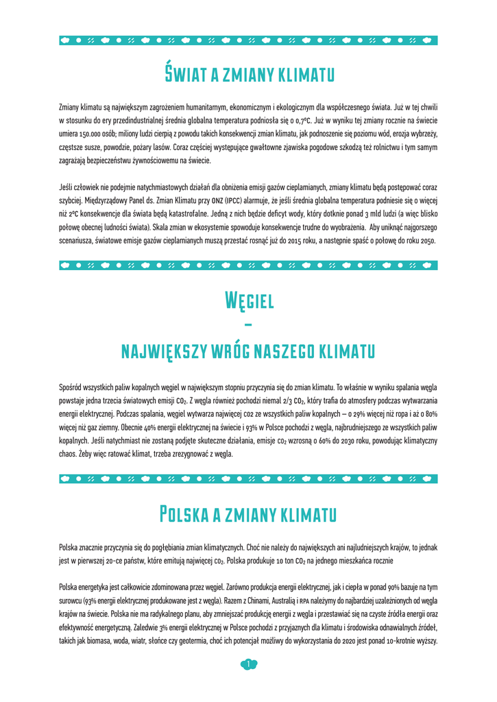 Świat a zmiany klimatu Zmiany klimatu są największym zagrożeniem humanitarnym, ekonomicznym i ekologicznym dla współczesnego świata. Już w tej chwili w stosunku do ery przedindustrialnej średnia globalna temperatura podniosła się o 0,7ºC. Już w wyniku tej zmiany rocznie na świecie umiera 150.000 osób; miliony ludzi cierpią z powodu takich konsekwencji zmian klimatu, jak podnoszenie się poziomu wód, erozja wybrzeży, częstsze susze, powodzie, pożary lasów. Coraz częściej występujące gwałtowne zjawiska pogodowe szkodzą też rolnictwu i tym samym zagrażają bezpieczeństwu żywnościowemu na świecie. Jeśli człowiek nie podejmie natychmiastowych działań dla obniżenia emisji gazów cieplarnianych, zmiany klimatu będą postępować coraz szybciej. Międzyrządowy Panel ds. Zmian Klimatu przy ONZ (IPCC) alarmuje, że jeśli średnia globalna temperatura podniesie się o więcej niż 2ºC konsekwencje dla świata będą katastrofalne. Jedną z nich będzie deficyt wody, który dotknie ponad 3 mld ludzi (a więc blisko połowę obecnej ludności świata). Skala zmian w ekosystemie spowoduje konsekwencje trudne do wyobrażenia. Aby uniknąć najgorszego scenariusza, światowe emisje gazów cieplarnianych muszą przestać rosnąć już do 2015 roku, a następnie spaść o połowę do roku 2050. Węgiel – największy wróg naszego klimatu Spośród wszystkich paliw kopalnych węgiel w największym stopniu przyczynia się do zmian klimatu. To właśnie w wyniku spalania węgla powstaje jedna trzecia światowych emisji CO₂. Z węgla również pochodzi niemal 2/3 CO₂, który trafia do atmosfery podczas wytwarzania energii elektrycznej. Podczas spalania, węgiel wytwarza najwięcej CO2 ze wszystkich paliw kopalnych – o 29% więcej niż ropa i aż o 80% więcej niż gaz ziemny. Obecnie 40% energii elektrycznej na świecie i 93% w Polsce pochodzi z węgla, najbrudniejszego ze wszystkich paliw kopalnych. Jeśli natychmiast nie zostaną podjęte skuteczne działania, emisje CO₂ wzrosną o 60% do 2030 roku, powodując klimatyczny chaos. Żeby więc ratować klimat, trzeba zrezygnować z węgla. Polska a zmiany klimatu Polska znacznie przyczynia się do pogłębiania zmian klimatycznych. Choć nie należy do największych ani najludniejszych krajów, to jednak jest w pierwszej 20-ce państw, które emitują najwięcej CO₂. Polska produkuje 10 ton CO₂ na jednego mieszkańca rocznie Polska energetyka jest całkowicie zdominowana przez węgiel. Zarówno produkcja energii elektrycznej, jak i ciepła w ponad 90% bazuje na tym surowcu (93% energii elektrycznej produkowane jest z węgla). Razem z Chinami, Australią i RPA należymy do najbardziej uzależnionych od węgla krajów na świecie. Polska nie ma radykalnego planu, aby zmniejszać produkcję energii z węgla i przestawiać się na czyste źródła energii oraz efektywność energetyczną. Zaledwie 3% energii elektrycznej w Polsce pochodzi z przyjaznych dla klimatu i środowiska odnawialnych źródeł, takich jak biomasa, woda, wiatr, słońce czy geotermia, choć ich potencjał możliwy do wykorzystania do 2020 jest ponad 10-krotnie wyższy. 1 Dużym problemem polskiej energetyki jest scentralizowanie produkcji. Energię wytwarza się przede wszystkim w wielkich elektrowniach, zamiast w rozproszonych, lokalnych instalacjach. Oznacza to ogromne straty przy przesyle prądu, a także brak bezpieczeństwa energetycznego w wypadku np. awarii i konieczności wyłączenia całego bloku o mocy kilkuset megawatów. Większość polskiej energii elektrycznej powstaje w nieefektywnych elektrowniach (które marnują ciepło), zamiast w mniejszych i zlokalizowanych blisko odbiorców ciepła elektrociepłowniach, co prowadzi do bezpowrotnej straty 2/3 energii zawartej w paliwie. Polska jest też niechlubnym „liderem” w Europie pod względem energochłonności gospodarki. Aby wyprodukować 1000 euro PKB, zużywamy ponad 2 razy więcej energii niż średnia w 25 krajach Unii Europejskiej. Przygotowana przez rząd „Polityka energetyczna Polski do 2030 r.” to ogólnikowy dokument bez wizji unowocześnienia polskiej energetyki. Polski rząd przedstawił projekt „Polityki Energetycznej do 2030”. Jest to jedyny dokument o strategicznym znaczeniu, który przedstawia koncepcję rozwoju energetyki w naszym kraju. Projekt „Polityki” przewiduje wzrost wykorzystania OZE (odnawialne źródła energii) do 15% w roku 2020 r. (zgodnie z propozycją Komisji Europejskiej) i do 20% w 2030 r. Jego podstawową wadą jest jednak kompletny brak progresywnej i dalekowzrocznej wizji unowocześnienia polskiej energetyki i jakiejkolwiek próby uniezależnienia jej od najbrudniejszego paliwa, jakim jest węgiel. Zmiany klimatu w Polsce Już dziś, tak niegdyś typowe, wiosenne powodzie roztopowe czy zamarzanie Bałtyku praktycznie stały się wspomnieniem. Nasilają się za to zjawiska wcześniej nietypowe, takie jak fale upałów, susze, gwałtowne burze, trąby powietrzne czy powodzie opadowe. Statystycznie polskie zimy są coraz cieplejsze, zima nadchodzi późno i szybko się kończy, wydłuża się okres wegetacji. Nie występują tak kiedyś powszechne wiosenne powodzie opadowe. Bałtyk od lat ’40 XX wieku już nie zamarza. Na południu Polski zaczęliśmy uprawę afrykańskiego sorgo. Klimat Dolnego Śląska już dziś odpowiada klimatowi słynnego z uprawy winorośli węgierskiego rejonu Tokaju sprzed 20 lat. Przesunięcie się strefy zwrotnikowej na północ powoduje z kolei częstszy dopływ do Polski rozgrzanego powietrza zwrotnikowego, które zderza się z chłodnym powietrzem z rejonów polarnych, co w okresie letnim powoduje intensyfikację burz i nawałnic i powstawanie trąb powietrznych. Szczególnie niebezpieczne są ciepłe i niosące dużo wody niże genueńskie, powodujące największe powodzie. To wszystko stało się już na początku rozkręcających się dopiero zmian klimatu. Jak więc zmieni się klimat Pol