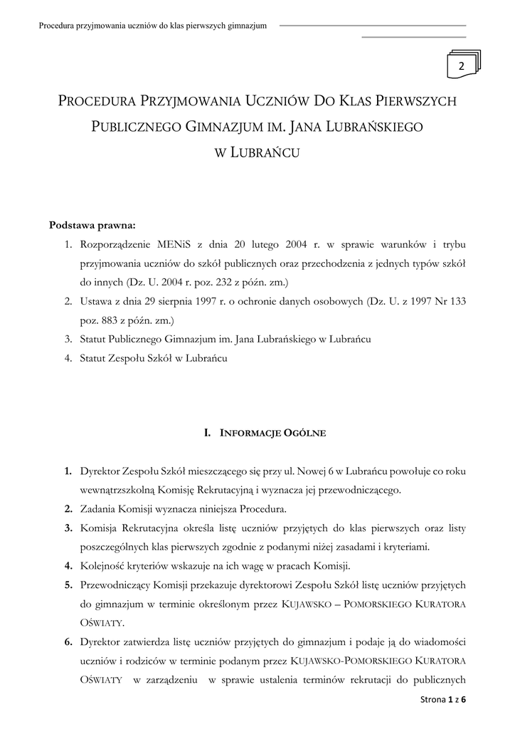 Procedura przyjmowania uczniów do klas pierwszych gimnazjum 2 PROCEDURA PRZYJMOWANIA UCZNIÓW DO KLAS PIERWSZYCH PUBLICZNEGO GIMNAZJUM IM. JANA LUBRAŃSKIEGO W LUBRAŃCU Podstawa prawna: 1. Rozporządzenie MENiS z dnia 20 lutego 2004 r. w sprawie warunków i trybu przyjmowania uczniów do szkół publicznych oraz przechodzenia z jednych typów szkół do innych (Dz. U. 2004 r. poz. 232 z późn. zm.) 2. Ustawa z dnia 29 sierpnia 1997 r. o ochronie danych osobowych (Dz. U. z 1997 Nr 133 poz. 883 z późn. zm.) 3. Statut Publicznego Gimnazjum im. Jana Lubrańskiego w Lubrańcu 4. Statut Zespołu Szkół w Lubrańcu I. INFORMACJE OGÓLNE 1. Dyrektor Zespołu Szkół mieszczącego się przy ul. Nowej 6 w Lubrańcu powołuje co roku wewnątrzszkolną Komisję Rekrutacyjną i wyznacza jej przewodniczącego. 2. Zadania Komisji wyznacza niniejsza Procedura. 3. Komisja Rekrutacyjna określa listę uczniów przyjętych do klas pierwszych oraz listy poszczególnych klas pierwszych zgodnie z podanymi niżej zasadami i kryteriami. 4. Kolejność kryteriów wskazuje na ich wagę w pracach Komisji. 5. Przewodniczący Komisji przekazuje dyrektorowi Zespołu Szkół listę uczniów przyjętych do gimnazjum w terminie określonym przez KUJAWSKO – POMORSKIEGO KURATORA OŚWIATY. 6. Dyrektor zatwierdza listę uczniów przyjętych do gimnazjum i podaje ją do wiadomości uczniów i rodziców w terminie podanym przez KUJAWSKO-POMORSKIEGO KURATORA OŚWIATY w zarządzeniu w sprawie ustalenia terminów rekrutacji do publicznych Strona 1 z 6 Procedura przyjmowania uczniów do klas pierwszych gimnazjum gimnazjów i szkół ponadgimnazjalnych w województwie kujawsko - pomorskim na dany rok szkolny oraz sposobu przeliczania na punkty ocen i wyników egzaminu gimnazjalnego, a także sposobu punktowania innych osiągnięć kandydatów. 7. Komisja Rekrutacyjna do dnia 20 sierpnia przekazuje dyrektorowi Zespołu Szkół skład osobowy klas pierwszych. 8. Dyrektor zatwierdza skład osobowy klas pierwszych i podaje do wiadomości rodziców i uczniów w ostatnim tygodniu sierpnia. II. ZASADY PRZYJMOWANIA UCZNIÓW DO GIMNAZJUM 1. Do klasy pierwszej gimnazjum przyjmowani są uczniowie: 1) z urzędu - absolwenci szkoły podstawowej zamieszkali w jego obwodzie, 2) na wniosek rodziców (prawnych opiekunów) - absolwenci szkół podstawowych zamieszkali poza obwodem gimnazjum, w przypadku gdy gimnazjum dysponuje wolnymi miejscami. 2. W związku z przyjęciem ucznia do gimnazjum należy złożyć w sekretariacie Zespołu Szkół następujące dokumenty: 1) kartę zgłoszenia według opracowanego wzoru dostępnego w sekretariacie Zespołu Szkół lub na stronie internetowej szkoły; 2) świadectwo ukończenia szkoły podstawowej oraz zaświadczenie z wynikami sprawdzianu po VI klasie szkoły podstawowej; 3) jedno zdjęcie (do legitymacji). III. ZASADY PRZYDZIAŁU KANDYDATÓW DO KLAS PIERWSZYCH 1. Komisja Rekrutacyjna, dokonując przydziału uczniów klas pierwszych do poszczególnych oddziałów, kieruje się zasadą „równego startu” tzn. równomiernego rozłożenia w klasach uczniów zdolnych, mniej zdolnych i sprawiających problemy wychowawcze. Przyjmując powyższy model tworzenia klas pierwszych, nie przewiduje się przenoszenia w całości struktur osobowych oddziałów istniejących w szkole podstawowej. 2. Przydział uczniów do klas jest formą oddziaływania wychowawczego mającą na celu: 1) kształtowanie postawy otwartości, szacunku i akceptacji, Strona 2 z 6 Procedura przyjmowania uczniów do klas pierwszych gimnazjum 2) zapewnienie warunków optymalnego rozwoju intelektualnego i osobowościowego poszczególnych uczniów, 3) rozwijanie umiejętności komunikowania się oraz nawiązywania i budowania nowych relacji, 4) stworzenie szans do adaptacji w nowych warunkach, 5) przeciwdziałanie formowaniu rankingowej pozycji klas i pojedynczych uczniów, 6) przeciwdziałanie zjawisku podporządkowywania sobie większej grupy przez jednostkę. 3. Przydział uczniów do poszczególnych klas następuje według następujących kryteriów: 1) uczniowie chodzący do jednej klasy w szkole podstawowej są rozdzielani do wszystkich klas w gimnazjum, 2) w miarę możliwości równa liczebność wszystkich klas, 3) równa liczebność chłopców i dziewcząt w każdym oddziale, 4) w przydzielaniu uczniów do poszczególnych klas obowiązuje zasada zachowania równomierności co do: a) wysokości wyników uzyskanych na sprawdzianie zewnętrznym, b) oceny zachowania na świadectwie ukończenia szkoły podstawowej, c) średniej ocen na świadectwie ukończenia szkoły podstawowej, 5) uczniowie drugoroczni i uczniowie z niepełnosprawnościami są przydzielani zgodnie z zasadą zachowania równomierności. UWAGA Wskaźnikiem równomierności jest zbliżona we wszystkich klasach średnia ze sprawdzianu zewnętrznego. 4. Przydział wychowawców jest losowy. IV. ZASADY ODWOŁANIA SIĘ OD DECYZJI DYREKTORA W uzasadnionych przypadkach rodzicom kandydatów przysługuje prawo do odwołania się od decyzji dyrektora Zespołu Szkół. W terminie do 2 dni od chwili ukazania się list, rodzice przedstawiają dyrektorowi pisemną prośbę z uzasadnieniem o zmianę decyzji. Dyrektor po rozpatrzeniu wniosków, podejmuje ostateczną decyzję do dnia 30 sierpnia. Procedura została zatwierdzona na posiedzeniu Rady Pedagogicznej dnia 10 października 2013 r. Strona 3 z 6 Procedura przyjmowania uczniów do klas pierwszych gimnazjum Załącznik nr 1 KARTA ZGŁOSZENIA UCZNIA DO PUBLICZNEGO GIMNAZJUM IM. JANA LUBRAŃSKIEGO W LUBRAŃCU NAZWISKO UCZNIA IMIĘ DRUGIE IMIĘ PESEL (UCZNIA) DATA URODZENIA MIEJSCE URODZENIA WOJEWÓDZTWO Adres zamieszkania ucznia ULICA NR DOMU KOD POCZTOWY GMINA NR MIESZKANIA MIEJSCOWOŚĆ POWIAT WOJEWÓDZTWO Adres zameldowania ucznia (jeżeli jest inny niż adres zamieszkania) ULICA NR DOMU KOD POCZTOWY GMINA NR MIESZKANIA MIEJSCOWOŚĆ POWIAT WOJEWÓDZTWO SZKOŁA PODSTAWOWA (do której uczęszczało dziecko) NAZWA I ADRES G