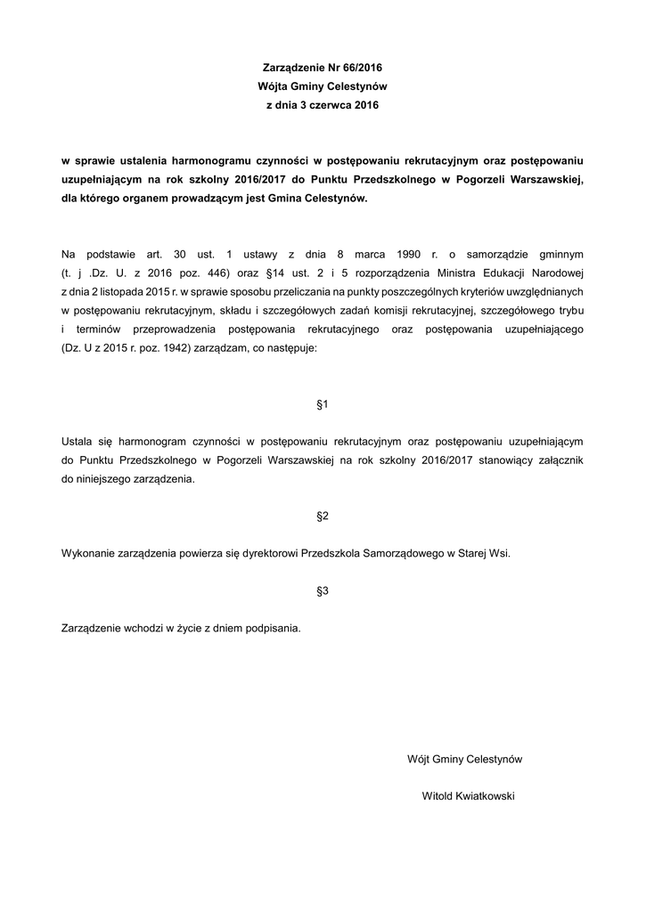 Zarządzenie Nr 66/2016 Wójta Gminy Celestynów z dnia 3 czerwca 2016 w sprawie ustalenia harmonogramu czynności w postępowaniu rekrutacyjnym oraz postępowaniu uzupełniającym na rok szkolny 2016/2017 do Punktu Przedszkolnego w Pogorzeli Warszawskiej, dla którego organem prowadzącym jest Gmina Celestynów. Na podstawie art. 30 ust. 1 ustawy z dnia 8 marca 1990 r. o samorządzie gminnym (t. j .Dz. U. z 2016 poz. 446) oraz §14 ust. 2 i 5 rozporządzenia Ministra Edukacji Narodowej z dnia 2 listopada 2015 r. w sprawie sposobu przeliczania na punkty poszczególnych kryteriów uwzględnianych w postępowaniu rekrutacyjnym, składu i szczegółowych zadań komisji rekrutacyjnej, szczegółowego trybu i terminów przeprowadzenia postępowania rekrutacyjnego oraz postępowania uzupełniającego (Dz. U z 2015 r. poz. 1942) zarządzam, co następuje: §1 Ustala się harmonogram czynności w postępowaniu rekrutacyjnym oraz postępowaniu uzupełniającym do Punktu Przedszkolnego w Pogorzeli Warszawskiej na rok szkolny 2016/2017 stanowiący załącznik do niniejszego zarządzenia. §2 Wykonanie zarządzenia powierza się dyrektorowi Przedszkola Samorządowego w Starej Wsi. §3 Zarządzenie wchodzi w życie z dniem podpisania. Wójt Gminy Celestynów Witold Kwiatkowski