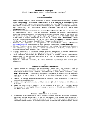 REGULAMIN KONKURSU „Zmień ekspozycję na lepszą i zostań Razowym zwycięzcą” §1 Postanowienia ogólne 1. 2. 3. 4. 5. 6. 7. 1. 2. 3. 4. Organizatorem konkursu „Zmień ekspozycję na lepszą i zostań Razowym zwycięzcą”, zwanego dalej: „Konkursem”, jest Grupa Eskadra Sp. z o. o. z siedzibą w Krakowie (30-422) ul. Jeleniogórska 17, wpisana do rejestru przedsiębiorców przez Sąd Rejonowy dla KrakowaŚródmieścia w Krakowie, XI Wydział Gospodarczy Krajowego Rejestru Sądowego pod numerem KRS 0000223980, NIP 5262823248, kapitał zakładowy: 195.000 PLN, zwana dalej „Organizatorem”. Konkurs organizowany jest na zlecenie i na rzecz Brand Marketing Sp. z o.o. z siedzibą przy ul. Kondratowicza 18/183, 032-285 Warszawa, wpisanej do rejestru przedsiębiorców Krajowego Rejestru Sądowego prowadzonego przez Sąd Rejonowy dla m. st. Warszawy, XIII Wydział Gospodarczy Krajowego Rejestru Sądowego, pod numerem KRS 0000655286, NIP 5242718494, o kapitale zakładowym 92.010.500 zł, zwanej dalej „Sponsorem”, celem promocji produkowanego przez Van Pur Sp. z o.o. [dalej: „Producent”] Razowego Kwasu Chlebowego [dalej: „Razowy Kwas Chlebowy"] o pojemności 0,5l i 1,5l. Konkurs jest ogłaszany w szczególności za pośrednictwem strony internetowej www.vanpur.com.pl, administrowanej przez Sponsora, zwanej dalej „Strona Konkursu”. Niniejszy Regulamin, zwany dalej „Regulaminem", jest wiążący dla Organizatora, Sponsora oraz Uczestników, reguluje zasady i warunki uczestnictwa w Konkursie, a także prawa i obowiązki Organizatora, Sponsora oraz Uczestników. Warunki uczestnictwa w Konkursie określa wyłącznie Regulamin, a wszelkie publikowane materiały promocyjno-reklamowe mają wyłącznie charakter informacyjny. Treść niniejszego Regulaminu jest dostępna do wglądu na Stronie Konkursu oraz w biurze Organizatora (tj. pod adresem wskazanym w § 1 ust. 1 Regulaminu) w dni robocze w godzinach 09:30 – 16:30. Sponsor i Producent oświadcza, że Strona Konkursu wykorzystuje pliki cookies (tzw. ciasteczka). §2 Przedmiot i czas trwania Konkursu Konkurs polega na przesłaniu, za pośrednictwem usługi MMS lub e-mail’em bądź za pośrednictwem przedstawiciela Producenta zdjęcia ekspozycji sklepowej kreatywnie eksponującej Razowy Kwas Chlebowy, przygotowanej w sklepie przez Uczestnika [dalej: „Praca konkursowa"] i następnie utrzymanej w tym sklepie do dnia wizyty przedstawiciela Producenta - o której mowa w § 5 ust. 9 - w terminie wskazanym w ust. 4 niniejszego paragrafu. Konkurs - w zakresie dokonywania zgłoszeń do Konkursu - trwa w dniach od 12 maja 2014 roku do 6 czerwca 2014 roku. Wstępne rozstrzygnięcie Konkursu - o którym mowa w § 5 ust. 8 - nastąpi do dnia 10 czerwca 2014 roku. Ostateczne rozstrzygnięcie Konkursu - o którym mowa w § 5 ust. 9 - i rozdanie Nagród Gwarantowanych oraz Nagród Głównych nastąpi w terminie od dnia 11 czerwca 2014 roku do dnia 4 lipca 2014 roku. §3 Warunki uczestnictwa w Konkursie 1. W Konkursie, z zastrzeżeniem §4 ust.12, mogą wziąć udział wyłącznie właściciele, kierownicy, pracownicy sklepów detalicznych, w których sprzedawany jest Razowy Kwas Chlebowy, i którzy najpóźniej w dniu wysłania zgłoszenia udziału w Konkursie uzyskali pełnoletniość, posiadający pełną zdolność do czynności prawnych, zamieszkali na terytorium Polski, którzy skutecznie dokonali zgłoszenia udziału w Konkursie za pomocą jednego ze sposobów opisanych w §4 ust. 2, zwani dalej „Uczestnikami”. 2. W Konkursie nie mogą uczestniczyć pracownicy ani osoby pozostające w stosunku zlecenia lub w innym stosunku prawnym, do którego stosuje się przepisy o zleceniu, z Organizatorem, Producentem bądź Sponsorem, członkowie ich organów zarządzających, podmioty i ich pracownicy współpracujący z nimi przy organizowaniu Konkursu, jak również członkowie najbliższych rodzin wymienionych osób, to jest małżonkowie, krewni i powinowaci w linii prostej (np. rodzice, dzieci, dziadkowie, wnuki), ich przysposobieni lub przysposabiający, a także rodzeństwo. 3. Warunkiem uczestnictwa w Konkursie jest akceptacja i przestrzeganie Regulaminu Konkursu. Akceptacja przez Uczestnika Regulaminu jest jednoznaczna z udzieleniem licencji, o której mowa w § 4 ust. 5, udzielanej pod warunkiem następnie przyznania Uczestnikowi Nagrody Gwarantowanej, z zastrzeżeniem §4 ust.10. §4 Zasady Konkursu 1. Konkurs polega na wyborze przez Komisję Konkursową 500 najciekawszych Prac konkursowych Uczestników, pod kątem ich kreatywności, wielkości i możliwości przyciągnięcia ekspozycją uwagi klienta sklepu. 2. Zgłoszenie uczestnictwa w Konkursie - zwane dalej łącznie „Zgłoszeniem" - następuje poprzez: I sposób: a) wysłanie Pracy konkursowej drogą elektroniczną (e-mail) na adres e-mail: [email protected] lub za pomocą usługi MMS pod numer telefonu 664 469 295; b) wysłanie w sposób wskazany w pkt a) - w odpowiedzi na e-mail lub SMS Organizatora - w terminie do dnia 6 czerwca 2014 roku następujących informacji: imię i nazwisko oraz numer telefonu kontaktowego Uczestnika, adres sklepu, w którym znajduje się ekspozycja przedstawiona w Pracy konkursowej, wyrażenia zgody przez Uczestnika na przetwarzane danych osobowych Uczestnika, zgodnie z przepisami Ustawy z 29.08.1997 r. o ochronie danych osobowych (tj. Dz.U. z 2002r., Nr 101, poz. 926 z późn. zm.), w celach związanych z przeprowadzeniem Konkursu, oświadczenia Uczestnika o zapoznaniu się z Regulaminem oraz o akceptacji jego postanowień; II sposób: c) wysłanie Pracy konkursowej za pośrednictwem przedstawiciela Producenta wraz z podaniem przez Uczestnika następujących informacji: . imię i nazwisko oraz numer telefonu kontaktowego lub adres e-mail Uczestnika adres sklepu, w którym znajduje się ekspozycja przedstawiona w Pracy konkursowej d) udzielenie w terminie do dnia 6 czerwca odpowiedzi na e-mail lub SMS pochodzący od Organizatora zawie