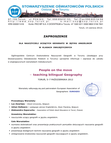 Toruń, 14 czerwca 2012r. ZAPROSZENIE DLA NAUCZYCIELI UCZĄCYCH GEOGRAFII W JĘZYKU ANGIELSKIM W KLASACH DWUJĘZYCZNYCH Ogólnopolskie Centrum Doskonalenia Nauczycieli Geografii w Toruniu (działające przy Stowarzyszeniu Oświatowców Polskich w Toruniu) uprzejmie informuje i zaprasza do udziału w anglojęzycznych warsztatach metodycznych: People on the move – teaching bilingual Geography TORUŃ, 5–7 PAŹDZIERNIKA 2012 Warsztaty odbywają się pod patronatem European Association of Geographers EUROGEO Prowadzący Warsztaty: Luc Zwartjes – Ghent University, Belgium Johan Delbaere – pedagogic advisor English&CLIL, West–Flandres, Belgium Aleksandra Zaparucha – Association of Polish Adult Educators in Toruń, Poland. Uczestnicy Warsztatów: nauczyciele uczący geografii w języku angielskim. Cele Warsztatów: wymiana doświadczeń oraz prezentacja praktycznych pomysłów dotyczących nauczania geografii w języku angielskim prezentacja dostępnych technik nauczania geografii w języku angielskim zintegrowanie środowiska nauczycieli geografii nauczających w języku angielskim. Program Warsztatów prezentuje Załącznik nr 1. JĘZYK WARSZTATÓW Językiem Warsztatów jest język angielski. REJESTRACJA Wstępnej rejestracji uczestnika należy dokonać w terminie do 10 sierpnia 2012 r. faxem, mailem ([email protected]) lub pocztą zwykłą na Formularzu zgłoszeniowym podając temat prezentacji (patrz Załącznik nr 2). Przypominamy, że prezentacja nie jest warunkiem koniecznym udziału w Warsztatach. Termin rejestracji ostatecznej upływa 15 września 2012 r. Opłata za udział w Warsztatach wynosi 370 zł (trzysta siedemdziesiąt złotych) i obejmuje: zakwaterowanie (5/6 i 6/7 października 2012r.) wyżywienie zwiedzanie interaktywnej wystawy w Orbitarium materiały warsztatowe egzemplarz publikacji powarsztatowej. Opłatę za udział w Warsztatach należy dokonać przelewem na konto do 15 września 2012 r.: Stowarzyszenie Oświatowców Polskich, Oddział w Toruniu PKO BP II/O Centrum w Toruniu 47 1020 5011 0000 9802 0156 7841 W adnotacjach: tytułem zapłaty prosimy wpisać: „Warsztaty 2012 – Bilingual teaching” Załączamy także: Kwestionariusz uczestnika – (patrz Załącznik nr 3) (prosimy o wypełnienie i przesłanie na adres organizatora wraz z Formularzem zgłoszeniowym – tylko nowi uczestnicy!) Mapkę Centrum Torunia – (patrz Załącznik nr 4). W przypadku pytań prosimy o kontakt elektroniczny [email protected] lub telefoniczny (56) 622 52 71, 622 43 09 i 655 54 94 (Marcin Stark). UWAGA! Jednocześnie informujemy, że publikacja powarsztatowa „Bilingual teaching – globalization, regional Geography and English integration 2011” będzie przesłana do uczestników warsztatów na wskazane przez nich adresy domowe w sierpniu br. Adres wysyłkowy prosimy przesłać na e-mail: [email protected] Serdecznie zapraszamy! Sekretarz Konferencji mgr Marcin Stark Załącznik nr 1 Program Warsztatów WORKSHOP PROGRAMME* People on the move – teaching bilingual Geography BILINGUAL EUROGEO* WORKSHOP, TORUŃ, OCTOBER 5-7, 2012 Workshop leaders Luc Zwartjes – Ghent University, Belgium Johan Delbaere – pedagogic advisor English&CLIL, West-Flandres, Belgium Aleksandra Zaparucha – Association of Polish Adult Educators in Toruń, Poland FRIDAY, 5 OCTOBER 2012 14.30–15.15 Registration at the National Centre for Further Training of Geography Teachers, 9 PCK Str. (once you have checked in at: Hotel Uniwersytecki, 83 Szosa Chełminska Str. or Association of Polish Adult Educators in Toruń accommodation base, 9 PCK Str.) 15.15–15.30 Opening and welcome speech Antoni Stark – the Head of the Association of Polish Adult Educators in Torun 15.30–16.15 Ice–breaker Luc Zwartjes Teaching bilingual Geography. People on the move 16.15–17.15 Presentation Luc Zwartjes Step 1 – Two sides of mobility: migration versus tourism 17.15–17.30 Coffee break 17.30–19.00 Presentation and workshop 19.15–19.30 Walk to the restaurant ”U Damroki” (1 Al. Solidarności Str.) 19.30–21.30 Welcome dinner Johan Delbaere Step 2 – Supporting bilingual teaching SATURDAY, 6 OCTOBER 2012 8.00–8.45 Workshop Luc Zwartjes Step 3 – Researching for migration & tourism study in bilingual Geography 8.45–10.30 Workshop Luc Zwartjes & Johan Delbaere Step 4 – Producing lesson resources on migration & tourism 10.30–10.45 Coffee break 10.45–12.00 Workshop Luc Zwartjes & Johan Delbaere Step 4 – Producing lesson resources on migration & tourism 12.00–13.30 Workshop Luc Zwartjes & Johan Delbaere Step 5 – Feedback: brief presentation from each of the groups 13.30–13.45 A coach to the Academic Canteen (1/3 Słowackiego Str.) 13.45–14.15 Lunch 14.15–14.30 Walk to the city centre 14.30–15.15 Visiting interactive exposition in Orbitarium (15/21 Franciszkańska Str.) 15.15–16.15 Free time 16.15–19.00 “Migration and tourism in Geography bilingual teaching” – best practice. Selected presentations given by participants (presentation time – 20 min) 19.15–21.00 Dinner – Catering at the National Centre SUNDAY, 7 OCTOBER 2012 9.00–10.00 10.00–11.00 Workshop: Language in Geography afternoon Johan Delbaere A collaborative Geography “dictionary” Luc Zwartjes & Johan Delbaere Final plenary 11.00–11.30 11.30–12.00 Luc Zwartjes Supporting bilingual teaching Some ideas from geographers Evaluation of the workshop Participants depart *EUROGEO – links European Geography teacher associations *Note that all workshop units and presentations to be hold at the National Centre for Further Training of Geography Teachers, 9 PCK Str. The workshop programme is viable to change once the organizers get all the presentation suggestions from the participants. Załącznik nr 2 Formularz zgłoszeniowy FORMULARZ ZGŁOSZENIOWY People on the move – teaching bilingual Geography BILINGUAL EUROGEO WORKSHOP, Toruń, 5-7 października 2012 Rejestracja wstępna – do 10 sierpnia 2012 