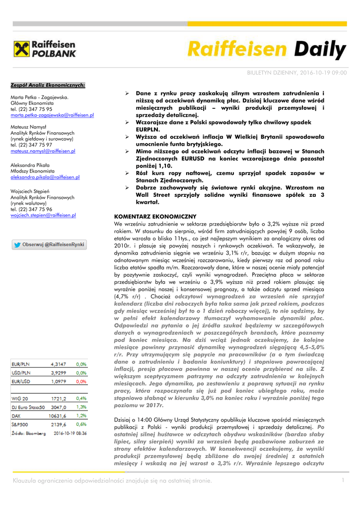 BIULETYN DZIENNY, 2016-10-19 09:00 Zespół Analiz Ekonomicznych: Marta Petka - Zagajewska. Główny Ekonomista tel. (22) 347 75 95 [email protected] Mateusz Namysł Analityk Rynków Finansowych (rynek giełdowy i surowcowy) tel. (22) 347 75 97 [email protected] Aleksandra Pikała Młodszy Ekonomista [email protected] Wojsciech Stępień Analityk Rynków Finansowych (rynek walutowy) tel. (22) 347 75 96 [email protected] Dane z rynku pracy zaskakują silnym wzrostem zatrudnienia i niższą od oczekiwań dynamiką płac. Dzisiaj kluczowe dane wśród miesięcznych publikacji – wyniki produkcji przemysłowej i sprzedaży detalicznej. Wczorajsze dane z Polski spowodowały tylko chwilowy spadek EURPLN. Wyższa od oczekiwań inflacja W Wielkiej Brytanii spowodowała umocnienie funta brytyjskiego. Mimo niższego od oczekiwań odczytu inflacji bazowej w Stanach Zjednoczonych EURUSD na koniec wczorajszego dnia pozostał poniżej 1,10. Rósł kurs ropy naftowej, czemu sprzyjał spadek zapasów w Stanach Zjednoczonych. Dobrze zachowywały się światowe rynki akcyjne. Wzrostom na Wall Street sprzyjały solidne wyniki finansowe spółek za 3 kwartał. KOMENTARZ EKONOMICZNY We wrześniu zatrudnienie w sektorze przedsiębiorstw było o 3,2% wyższe niż przed rokiem. W stosunku do sierpnia, wśród firm zatrudniających powyżej 9 osób, liczba etatów wzrosła o blisko 11tys., co jest najlepszym wynikiem za analogiczny okres od 2010r. i plasuje się powyżej naszych i rynkowych oczekiwań. Te wskazywały, że dynamika zatrudnienia sięgnie we wrześniu 3,1% r/r, bazując w dużym stopniu na odnotowanym miesiąc wcześniej rozczarowaniu, kiedy pierwszy raz od ponad roku liczba etatów spadła m/m. Rozczarowały dane, które w naszej ocenie miały potencjał by pozytywnie zaskoczyć, czyli wyniki wynagrodzeń. Przeciętna płaca w sektorze przedsiębiorstw była we wrześniu o 3,9% wyższa niż przed rokiem plasując się wyraźnie poniżej naszej i konsensowej prognozy, a także odczytu sprzed miesiąca (4,7% r/r) . Chociaż odczytowi wynagrodzeń za wrzesień nie sprzyjał kalendarz (liczba dni roboczych była taka sama jak przed rokiem, podczas gdy miesiąc wcześniej był to o 1 dzień roboczy więcej), to nie sądzimy, by w pełni efekt kalendarzowy tłumaczył wyhamowanie dynamiki płac. Odpowiedzi na pytania o jej źródła szukać będziemy w szczegółowych danych o wynagrodzeniach w poszczególnych branżach, które poznamy pod koniec miesiąca. Na dziś wciąż jednak oczekujemy, że kolejne miesiące powinny przynosić dynamikę wynagrodzeń sięgającą 4,5-5,0% r/r. Przy utrzymującym się popycie na pracowników (a o tym świadczą dane o zatrudnieniu i badania koniunktury) i stopniowo powracającej inflacji, presja płacowa powinna w naszej ocenie przybierać na sile. Z większym sceptycyzmem patrzymy na odczyty zatrudnienia w kolejnych miesiącach. Jego dynamika, po zestawieniu z poprawą sytuacji na rynku pracy, która rozpoczynała się już pod koniec ubiegłego roku, może stopniowo słabnąć w kierunku 3,0% na koniec roku i wyraźnie poniżej tego poziomu w 2017r. Dzisiaj o 14:00 Główny Urząd Statystyczny opublikuje kluczowe spośród miesięcznych publikacji z Polski - wyniki produkcji przemysłowej i sprzedaży detalicznej. Po ostatniej silnej huśtawce w odczytach obydwu wskaźników (bardzo słaby lipiec, silny sierpień) wyniki za wrzesień będą pozbawione zaburzeń ze strony efektów kalendarzowych. W konsekwencji oczekujemy, że wyniki produkcji przemysłowej będą zbliżone do swojej średniej z ostatnich miesięcy i wskażą na jej wzrost o 3,3% r/r. Wyraźnie lepszego odczytu Klauzula ograniczenia odpowiedzialności znajduje się na ostatniej stronie. 1 BIULETYN DZIENNY, 19 października 2016, GODZ 9.10 oczekujemy po stronie sprzedaży detalicznej, która wzrośnie naszym zdaniem o 5,6% r/r wspierana zarówno wyższymi dochodami gospodarstw domowych, jak i ograniczającą się deflacją jej cen. Umiarkowanie pozytywną wymowę, którą naszym zdaniem będą miały wyniki produkcji przemysłowej i sprzedaży detalicznej, zepsuć mogą wyniki produkcji budowlanej, która w naszej ocenie kontynuowała we wrześniu głębokie spadki (-17,6% r/r). Nasze prognozy produkcji przemysłowej i sprzedaży detalicznej plasują się nieznacznie poniżej rynkowego konsensusu, który zakłada wzrost produkcji o 3,45% r/r, a sprzedaży o 6,05% r/r. Przegląd informacji: Rzecznik rządu Rafał Bochenek poinformował, że pomimo prac nad nowym prawem wodnym w przyszłym roku zarówno dla przedsiębiorców jak i konsumentów obowiązywać będą takie same opłaty za wodę jak w tym roku. Wiceminister finansów powiedział, że resort rozważa wprowadzenie modyfikacji w konstrukcji podatku od instytucji finansowych. Modyfikacja ta uśredniałaby poziom aktywów stanowiących podstawę opodatkowania na wszystkie dni miesiąca (obecnie stan na koniec miesiąca) lub wprowadzała odwołanie do poziomu aktywów z bilansu instytucji na koniec poprzedniego roku. KOMENTARZ RYNKOWY W piątek doszło do umocnienia się funta po lepszym od oczekiwań odczycie inflacji konsumenckiej w Wielkiej Brytanii we wrześniu (1,0% r/r vs oczekiwane 0,9%r/r i 0,6% r/r przed miesiącem). Jest to najwyższy poziom inflacji w tym kraju od 2014 r. Początkowo dobrze zostały odebrane dane z Polski. Zatrudnienie wzrosło silniej niż oczekiwał tego konsensus rynkowy, lecz płace rosły wolniej niż zakładali analitycy. Po tych informacjach EURPLN szybko obniżył się o 0,5 grosza względem euro, jednak już po chwili skala ruchu została zmniejszona do 20 pipsów. Od wczorajszych danych ważniejsze będą te, które poznamy dzisiejszego popołudnia (14:00) tzn. o produkcji przemysłowej i sprzedaży detalicznej. Nasza prognoza plasuje się nieco poniżej rynkowego konsensusu i jej realizacja mogłaby oznaczać bardzo niewielkie osłabienie się złotego. EURUSD kolejny dzień oscylował wokół poziomu 1,1