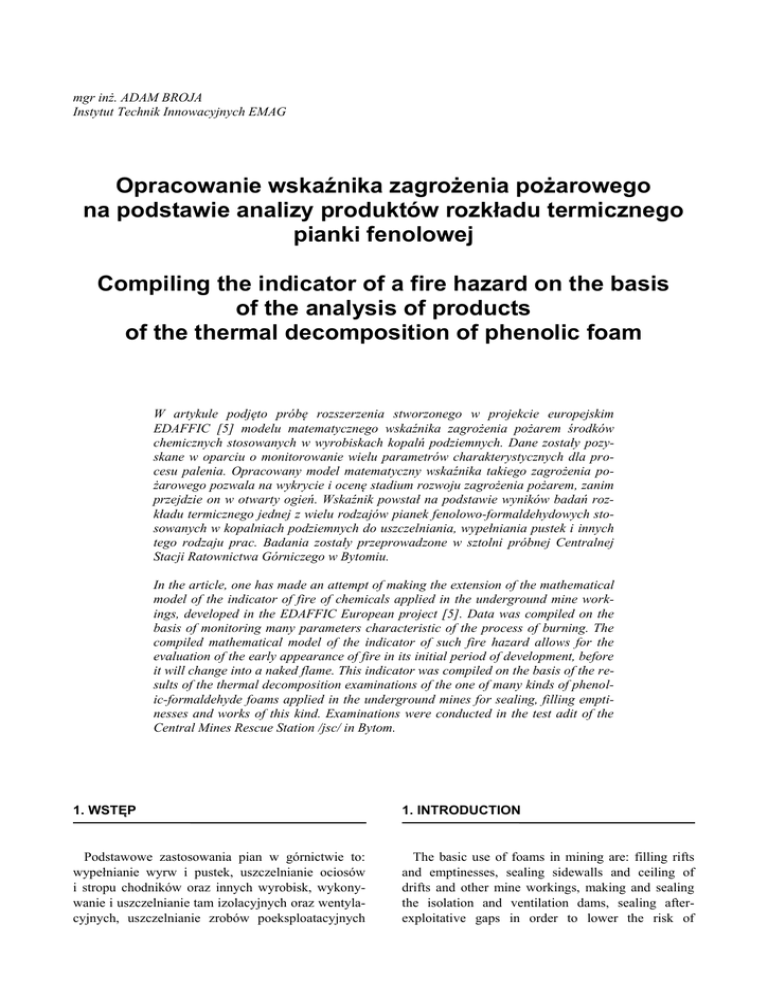 mgr inż. ADAM BROJA Instytut Technik Innowacyjnych EMAG Opracowanie wskaźnika zagrożenia pożarowego na podstawie analizy produktów rozkładu termicznego pianki fenolowej Compiling the indicator of a fire hazard on the basis of the analysis of products of the thermal decomposition of phenolic foam W artykule podjęto próbę rozszerzenia stworzonego w projekcie europejskim EDAFFIC [5] modelu matematycznego wskaźnika zagrożenia pożarem środków chemicznych stosowanych w wyrobiskach kopalń podziemnych. Dane zostały pozyskane w oparciu o monitorowanie wielu parametrów charakterystycznych dla procesu palenia. Opracowany model matematyczny wskaźnika takiego zagrożenia pożarowego pozwala na wykrycie i ocenę stadium rozwoju zagrożenia pożarem, zanim przejdzie on w otwarty ogień. Wskaźnik powstał na podstawie wyników badań rozkładu termicznego jednej z wielu rodzajów pianek fenolowo-formaldehydowych stosowanych w kopalniach podziemnych do uszczelniania, wypełniania pustek i innych tego rodzaju prac. Badania zostały przeprowadzone w sztolni próbnej Centralnej Stacji Ratownictwa Górniczego w Bytomiu. In the article, one has made an attempt of making the extension of the mathematical model of the indicator of fire of chemicals applied in the underground mine workings, developed in the EDAFFIC European project [5]. Data was compiled on the basis of monitoring many parameters characteristic of the process of burning. The compiled mathematical model of the indicator of such fire hazard allows for the evaluation of the early appearance of fire in its initial period of development, before it will change into a naked flame. This indicator was compiled on the basis of the results of the thermal decomposition examinations of the one of many kinds of phenolic-formaldehyde foams applied in the underground mines for sealing, filling emptinesses and works of this kind. Examinations were conducted in the test adit of the Central Mines Rescue Station /jsc/ in Bytom. 1. WSTĘP 1. INTRODUCTION Podstawowe zastosowania pian w górnictwie to: wypełnianie wyrw i pustek, uszczelnianie ociosów i stropu chodników oraz innych wyrobisk, wykonywanie i uszczelnianie tam izolacyjnych oraz wentylacyjnych, uszczelnianie zrobów poeksploatacyjnych The basic use of foams in mining are: filling rifts and emptinesses, sealing sidewalls and ceiling of drifts and other mine workings, making and sealing the isolation and ventilation dams, sealing afterexploitative gaps in order to lower the risk of Nr 4(518) LIPIEC-SIERPIEŃ 2014 w celu zmniejszenia zagrożenia samozapłonem, uszczelnianie silnie spękanego górotworu w celu likwidacji zagrożenia pożarowego, ograniczenie skłonności węgla do samozapalenia przez dezaktywację jego powierzchni, wypełnianie zer podsadzkowych, termoizolacja wyrobisk w strefach o podwyższonej temperaturze górotworu itp. Wykorzystuje się je w profilaktyce pożarowej i metanowej w celu poprawy bezpieczeństwa lub zwiększenia postępu robót. Ze względu na zastosowane do produkcji surowce można podzielić piany na organiczne (na bazie żywic fenolowo-formaldehydowych, mocznikowoformaldehydowych i krzemianowych) oraz nieorganiczne (na bazie cementów) [8]. Piany organiczne stosowane są najczęściej jako dwuskładnikowe systemy chemoutwardzalne o dużej szybkości spieniania i utwardzania. Rozróżnia się dwa mechanizmy wytwarzania pian: chemiczny i fizyczny. W pierwszym przypadku czynnikiem spieniającym jest dwutlenek węgla powstający w wyniku reakcji chemicznej pomiędzy składnikami systemu, w drugim – sprężone powietrze, mieszane zwykle z jednym z komponentów systemu. W obecnym czasie w górnictwie stosowane są pianki organiczne fenolowe, mocznikowo-formaldehydowe, krzemianowe. Najważniejsze, istotne dla bezpiecznego stosowania w wyrobisku górniczym, właściwości tych pian to ich trudnopalność, antystatyka i nietoksyczność [8]. Jednak niektóre z nich mogą stanowić zagrożenie pożarowe, np. pianki poliuretanowe, o czym świadczą zdarzenia zaistniałe w kopalniach francuskich, niemieckich i polskich [14, 13]. Do omawianych w artykule badań wykorzystano gotowe próbki pianki fenolowo-formaldehydowej typu Ekoflex. W ramach badań zostały one poddane próbom cieplnym. Wykonano dwa testy na dwóch różnych stanowiskach badawczych. Podczas tych testów obliczono wskaźnik wczesnego wykrycia zagrożenia pożarowego Wp i wyznaczono kryteria oceny poziomu tego sygnału dla: stanu normalnego, stanu ostrzegawczego, stanu alarmu, pożaru. Założono, że zadaniem wskaźnika zagrożenia pożarem środków chemicznych, nazywanego dalej wskaźnikiem zagrożenia pożarowego, jest wczesne wykrycie objawów pożaru w jego początkowym stadium, zanim przejdzie on w fazę rozgrzewania, trudną do zlokalizowania w początkowej fazie. 35 self-ignition, sealing strongly cracked in rock mass in order to liquidate a fire hazard, limiting the tendency of coal to the self-ignition by the deactivation of its area, filling zero goafs, thermal insulation of mine workings in zones with the increased temperature of rock mass and the like They are used in the fire and methane prevention, in order to improve the safety or increase the progress of works. From a point of view of raw materials used to the production of foams, it is possible to divide them into organic foams (on the basis of phenol-formaldehyde, urea-formaldehyde and silicate resins) and inorganic (on the basis of cements) [8]. Organic foams, applied most often as twocomponent chemo-hardenable systems with the high speed of frothing and hardening. Two mechanisms of creating foams are distinguished: chemical and physical. In the first case, a carbon dioxide coming into existence as a result of a chemical reaction between elements of the system, is a frothing factor. In the second case, a compressed air, usually mixed with one of the components of the system, is a frothing factor. Today, phenol organic, urea-for