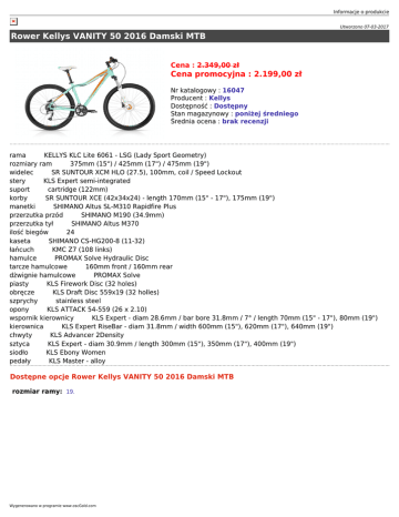 Informacje o produkcie Utworzono 07-03-2017 Rower Kellys VANITY 50 2016 Damski MTB Cena : 2.349,00 zł Cena promocyjna : 2.199,00 zł Nr katalogowy : 16047 Producent : Kellys Dostępność : Dostępny Stan magazynowy : poniżej średniego Średnia ocena : brak recenzji rama KELLYS KLC Lite 6061 - LSG (Lady Sport Geometry) rozmiary ram 375mm (15") / 425mm (17") / 475mm (19") widelec SR SUNTOUR XCM HLO (27.5), 100mm, coil / Speed Lockout stery KLS Expert semi-integrated suport cartridge (122mm) korby SR SUNTOUR XCE (42x34x24) - length 170mm (15" - 17"), 175mm (19") manetki SHIMANO Altus SL-M310 Rapidfire Plus przerzutka przód SHIMANO M190 (34.9mm) przerzutka tył SHIMANO Altus M370 ilość biegów 24 kaseta SHIMANO CS-HG200-8 (11-32) łańcuch KMC Z7 (108 links) hamulce PROMAX Solve Hydraulic Disc tarcze hamulcowe 160mm front / 160mm rear dżwignie hamulcowe PROMAX Solve piasty KLS Firework Disc (32 holes) obręcze KLS Draft Disc 559x19 (32 holles) szprychy stainless steel opony KLS ATTACK 54-559 (26 x 2.10) wspornik kierownicy KLS Expert - diam 28.6mm / bar bore 31.8mm / 7° / length 70mm (15" - 17"), 80mm (19") kierownica KLS Expert RiseBar - diam 31.8mm / width 600mm (15"), 620mm (17"), 640mm (19") chwyty KLS Advancer 2Density sztyca KLS Expert - diam 30.9mm / length 300mm (15"), 350mm (17"), 400mm (19") siodło KLS Ebony Women pedały KLS Master - alloy Dostępne opcje Rower Kellys VANITY 50 2016 Damski MTB rozmiar ramy: 19. Wygenerowano w programie www.oscGold.com