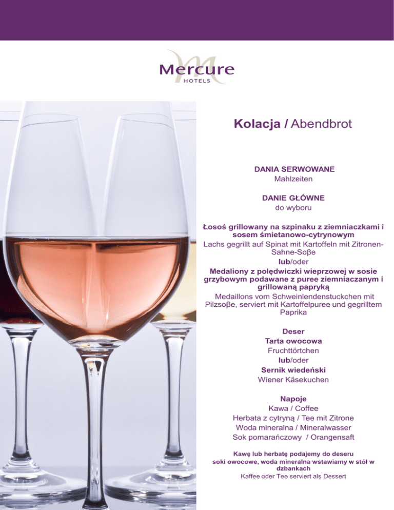 NAZWA MENU Kolacja / Abendbrot ZESTAW NAZWA ZESTAWU Cena: 29 PLN DANIA SERWOWANE Pozycja menu numer 1 Mahlzeiten Pozycja menu numer 2 DANIE GŁÓWNE do wyboru Pozycja menu numer 3 Łosoś grillowany na szpinaku z ziemniaczkami i Pozycja menu numer 4 sosem śmietanowo-cytrynowym Lachs gegrillt auf Spinat…mit Kartoffeln mit ZitronenSahne-Soβe lub/oder Medaliony z polędwiczki wieprzowej w sosie grzybowym podawane z puree ziemniaczanym i grillowaną papryką Medaillons vom Schweinlendenstuckchen mit Pilzsoβe, serviert mit Kartoffelpuree und gegrilltem Paprika Deser Tarta owocowa Fruchttörtchen lub/oder Sernik wiedeński Wiener Käsekuchen Napoje Kawa / Coffee Herbata z cytryną / Tee mit Zitrone Woda mineralna / Mineralwasser Sok pomarańczowy / Orangensaft Kawę lub herbatę podajemy do deseru soki owocowe, woda mineralna wstawiamy w stół w dzbankach Kaffee oder Tee serviert als Dessert