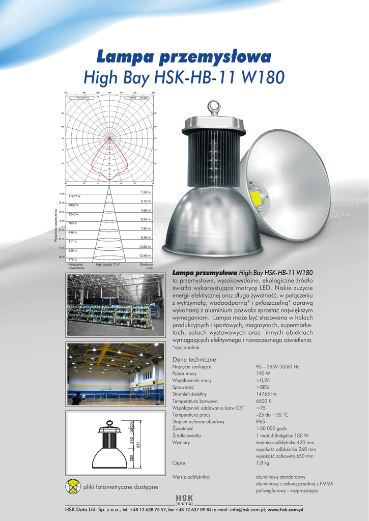 Lampa przemys³owa High Bay HSK-HB-11 W180 1m Wysokoæ zawieszenia 2m 3m 4m 5m 6m 7m 8m 1,56 m 11207 lx 3,12 m 2802 lx 4,68 m 1245 lx 6,24 m 700 lx 7,80 m 448 lx 9,36 m 311 lx 10,92 m 229 lx 12,48 m 175 lx Natê¿enie owietlenia K¹t rozsy³u 77,4° rednica pola Lampa przemys³owa High Bay HSK-HB-11 W180 to przemys³owe, wysokowydajne, ekologiczne ród³o wiat³a wykorzystuj¹ce matrycê LED. Niskie zu¿ycie energii elektrycznej oraz d³uga ¿ywotnoæ, w po³¹czeniu z wytrzyma³¹, wodoodporn¹* i py³oszczeln¹* opraw¹ wykonan¹ z aluminium pozwala sprostaæ najwiêkszym wymaganiom. Lampa mo¿e byæ stosowana w halach produkcyjnych i sportowych, magazynach, supermarketach, salach wystawowych oraz innych obiektach wymagaj¹cych efektywnego i nowoczesnego owietlenia. *opcjonalnie Dane techniczne: Napiêcie zasilaj¹ce Pobór mocy Wspó³czynnik mocy Sprawnoæ Strumieñ wietlny Temperatura barwowa Wspó³czynnik oddawania barw CRT Temperatura pracy Stopieñ ochrony obudowy ¯ywotnoæ ród³o wiat³a Wymiary Ciê¿ar Wersje odb³ynika: pliki fotometryczne dostêpne 95  265V 50/60 Hz 190 W >0,95 >88% 14765 lm 6500 K >75 25 do +35 °C IP65 >50 000 godz. 1 modu³ Bridgelux 180 W rednica odb³ynika 420 mm wysokoæ odb³ynika 260 mm wysokoæ ca³kowita 650 mm 7,8 kg aluminiowy standardowy aluminiowy z os³on¹ przedni¹ z PMMA poliwêglanowy  rozpraszaj¹cy HSK Data Ltd. Sp. z o.o., tel. +48 12 638 75 57, fax +48 12 637 09 84; e-mail: [email protected]; www.hsk.com.pl