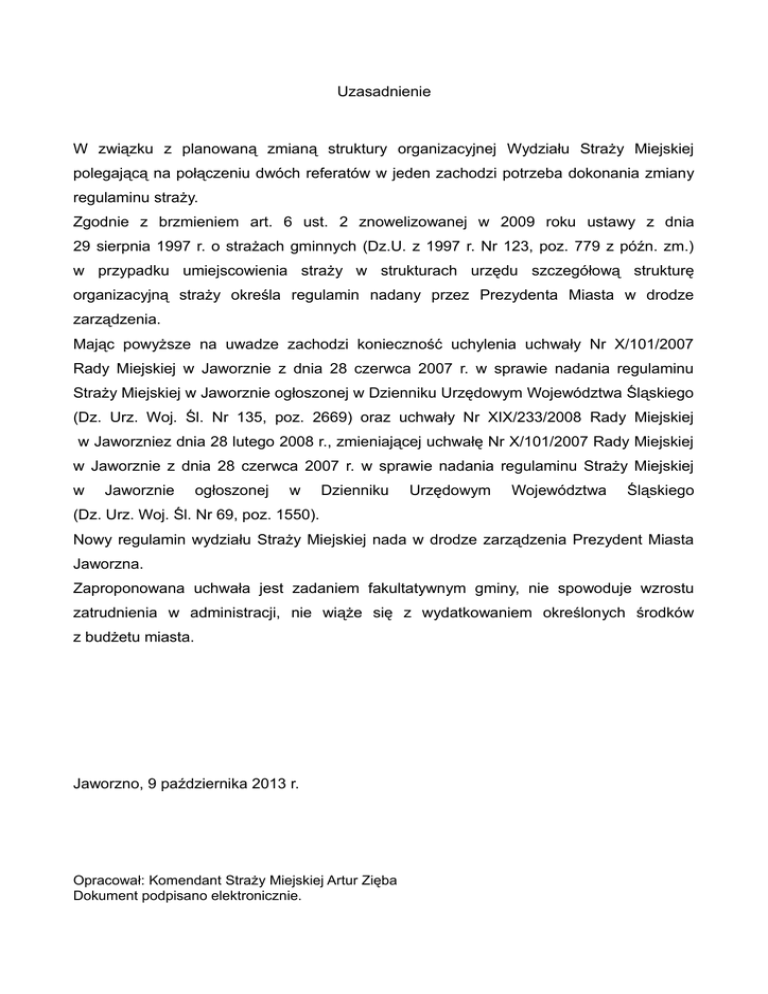 Uzasadnienie W związku z planowaną zmianą struktury organizacyjnej Wydziału Straży Miejskiej polegającą na połączeniu dwóch referatów w jeden zachodzi potrzeba dokonania zmiany regulaminu straży. Zgodnie z brzmieniem art. 6 ust. 2 znowelizowanej w 2009 roku ustawy z dnia 29 sierpnia 1997 r. o strażach gminnych (Dz.U. z 1997 r. Nr 123, poz. 779 z późn. zm.) w przypadku umiejscowienia straży w strukturach urzędu szczegółową strukturę organizacyjną straży określa regulamin nadany przez Prezydenta Miasta w drodze zarządzenia. Mając powyższe na uwadze zachodzi konieczność uchylenia uchwały Nr X/101/2007 Rady Miejskiej w Jaworznie z dnia 28 czerwca 2007 r. w sprawie nadania regulaminu Straży Miejskiej w Jaworznie ogłoszonej w Dzienniku Urzędowym Województwa Śląskiego (Dz. Urz. Woj. Śl. Nr 135, poz. 2669) oraz uchwały Nr XIX/233/2008 Rady Miejskiej w Jaworzniez dnia 28 lutego 2008 r., zmieniającej uchwałę Nr X/101/2007 Rady Miejskiej w Jaworznie z dnia 28 czerwca 2007 r. w sprawie nadania regulaminu Straży Miejskiej w Jaworznie ogłoszonej w Dzienniku Urzędowym Województwa Śląskiego (Dz. Urz. Woj. Śl. Nr 69, poz. 1550). Nowy regulamin wydziału Straży Miejskiej nada w drodze zarządzenia Prezydent Miasta Jaworzna. Zaproponowana uchwała jest zadaniem fakultatywnym gminy, nie spowoduje wzrostu zatrudnienia w administracji, nie wiąże się z wydatkowaniem określonych środków z budżetu miasta. Jaworzno, 9 października 2013 r. Opracował: Komendant Straży Miejskiej Artur Zięba Dokument podpisano elektronicznie.