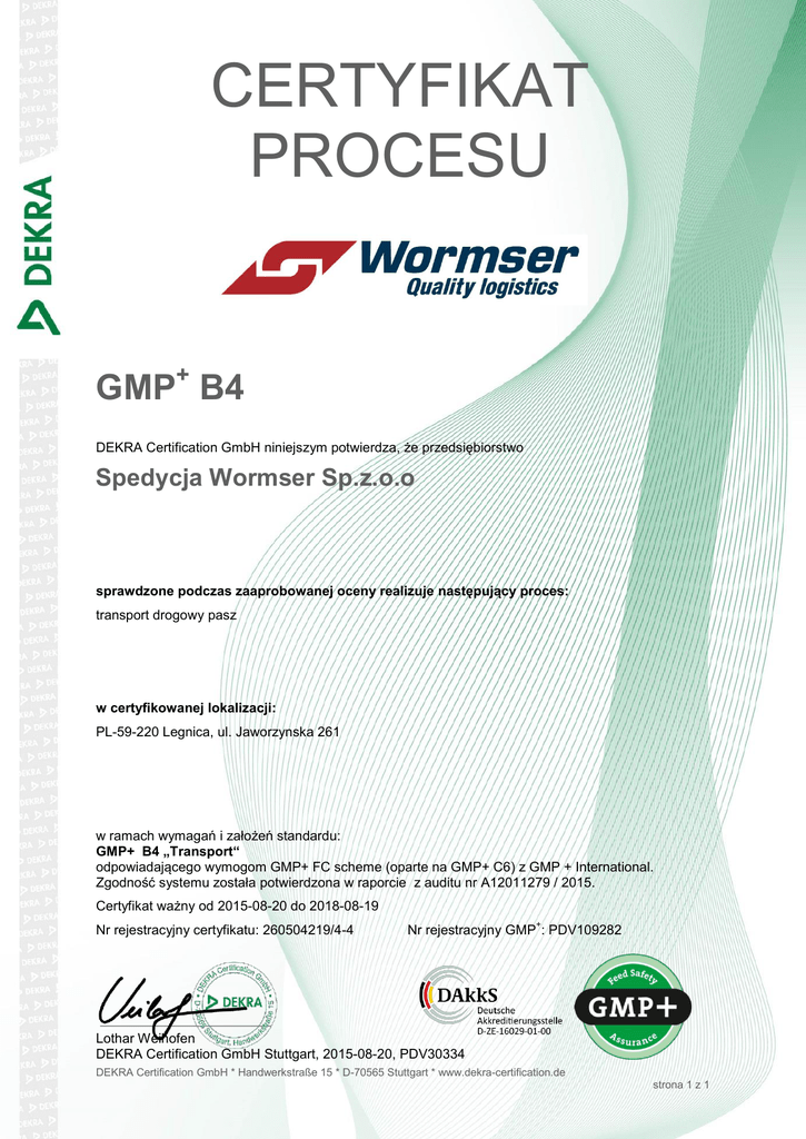 CERTYFIKAT PROCESU GMP+ B4 DEKRA Certification GmbH niniejszym potwierdza, że przedsiębiorstwo Spedycja Wormser Sp.z.o.o sprawdzone podczas zaaprobowanej oceny realizuje następujący proces: transport drogowy pasz w certyfikowanej lokalizacji: PL-59-220 Legnica, ul. Jaworzynska 261 w ramach wymagań i założeń standardu: GMP+ B4 „Transport“ odpowiadającego wymogom GMP+ FC scheme (oparte na GMP+ C6) z GMP + International. Zgodność systemu została potwierdzona w raporcie z auditu nr A12011279 / 2015. Certyfikat ważny od 2015-08-20 do 2018-08-19 Nr rejestracyjny certyfikatu: 260504219/4-4 + Nr rejestracyjny GMP : PDV109282 Lothar Weihofen DEKRA Certification GmbH Stuttgart, 2015-08-20, PDV30334 DEKRA Certification GmbH * Handwerkstraße 15 * D-70565 Stuttgart * www.dekra-certification.de strona 1 z 1