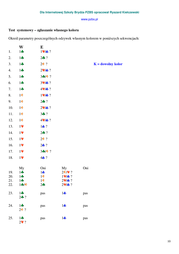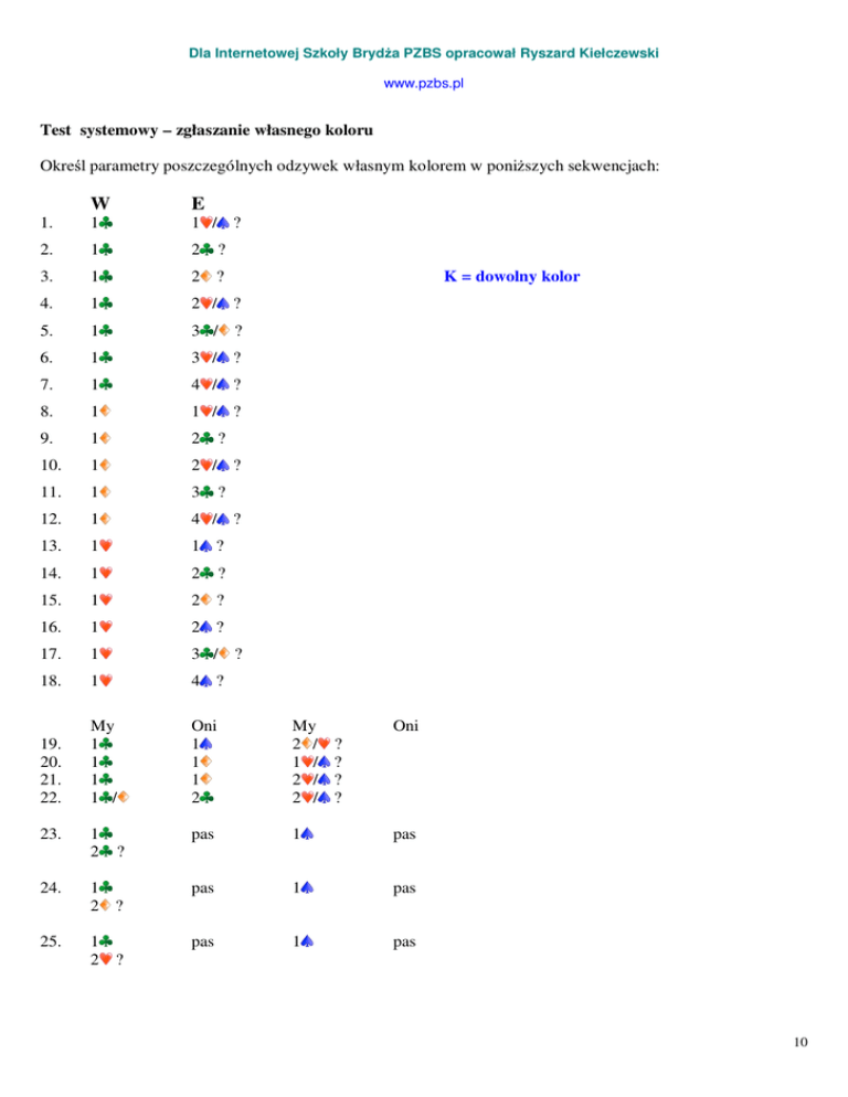 Dla Internetowej Szkoły Bryd a PZBS opracował Ryszard Kiełczewski www.pzbs.pl Test systemowy – zgłaszanie własnego koloru Okre l parametry poszczególnych odzywek własnym kolorem w poni szych sekwencjach: W E 2. 1 2 3. 1 2 ? 4. 1 2 / ? 5. 1 3 / ? 6. 1 3 / ? 7. 1 4 / ? 8. 1 1 / ? 9. 1 2 10. 1 2 / ? 11. 1 3 12. 1 4 / ? 13. 1 1 ? 14. 1 2 15. 1 2 ? 16. 1 2 ? 17. 1 3 / ? 18. 1 4 ? 19. 20. 21. 22. My 1 1 1 1 / Oni 1 1 1 2 My 2 / 1 / 2 / 2 / 23. 1 2 pas 1 pas 24. 1 2 ? pas 1 pas 25. 1 2 ? pas 1 pas 1. 1 1 / ? ? ? K = dowolny kolor ? ? ? ? ? ? ? Oni 10 Dla Internetowej Szkoły Bryd a PZBS opracował Ryszard Kiełczewski www.pzbs.pl W 1 1 BA E 1 / 2 ? 27. 1 1 BA 1 / 2 ? 28. 1 1 BA 1 1 BA 1 2 ? 1 2 ? 30. 1 1 BA 1 3 31. 1 1 BA 1 3 / ? 32. W 1 N ktr E 1 / ? 33. 1 ktr 2 / ? 34. 1 ktr 3 ? 35. 1 / ktr 2 ? 36. 1 ktr 3 / ? 37. 1 BA ktr 2K? 38. 2 (1) ktr 2 ? (1) blok 39. 2 (2) ktr 2 ? (2) dwukolorowe 40. 2 (1) ktr 3 / ? (1) blok 41. 2 / (1) 3 3 ? (1) blok 42. 2 / (2) 3 3 ? (2) dwukolorowe 43. 3 / ktr 3 / ? 44. 3 3 3 / ? 45. pas 3 ? 1 2 (3) ktr (3) Michaels 46. pas 3 ? 1 2 (3) ktr (3) Michaels 47. pas 2 / ? 1 1 BA(4) ktr (4) 4 st. – 5 mł. 26. 29. ? S 11 Dla Internetowej Szkoły Bryd a PZBS opracował Ryszard Kiełczewski www.pzbs.pl 48. pas 3 / ? 1 1 2 49. 2 (5) 2 3 / ? (5) Multi 50. 2 (6) 2 / 3 / ? (6) Wilkosz 51. 1 BA 2 ? pas 2 ktr 52. 1 / ktr pas 1 / ? 53. 1 / ktr pas 2 / ? 54. 1 / ktr pas 3 / ? 55. 2 (5) ktr pas 2 / ? 3 / ? (5) Multi 56. 2 (6) ktr pas Pas ? 2 / ? 3 ? 3 ? 3 / ? (6) Wilkosz 12