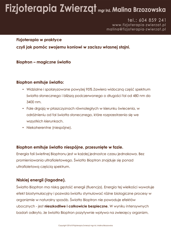 Fizjoterapia w praktyce czyli jak pomóc swojemu koniowi w zaciszu własnej stajni. Bioptron – magiczne światło Bioptron emituje światło: • Widzialne i spolaryzowane powyżej 95% Zawiera widoczną część spektrum światła słonecznego i bliższą podczerwonego o długości fal od 480 nm do 3400 nm. • Fale drgają w płaszczyznach równoległych w kierunku świecenia, w odróżnieniu od fal światła słonecznego, które rozprzestrzenia się we wszystkich kierunkach. • Niekoherentne (niespójne). Bioptron emituje światło niespójne, przesunięte w fazie. Energia fali świetlnej Bioptronu jest w każdej jednostce czasu jednakowa. Bez promieniowania ultrafioletowego. Światło Bioptron znajduje się ponad ultrafioletową częścią spektrum. Niskiej energii (łagodne). Światło Bioptron ma niską gęstość energii (fluencja). Energia tej wielkości wywołuje efekt biostymulacyjny i pozwala światłu stymulować różne biologiczne procesy w organizmie w naturalny sposób. Światło Bioptron nie powoduje efektów ubocznych - jest nieszkodliwe i całkowicie bezpieczne. W wyniku intensywnych badań odkryto, że światło Bioptron pozytywnie wpływa na zwierzęcy organizm, Copyright 2016 © Fizjoterapia Zwierząt mgr inż. Malina Brzozowska powodując jego biostymulację i wzmacniając funkcje obronne. Terapia światłem Bioptron znacznie przyspiesza gojenie się tkanek co pozwala na szybszą regenerację organizmu. Także w przypadku innych zachorowań istnieje wiele dowodów medycznych na to, że dzięki światłu Bioptronu stany zapalne ustępują, bóle - nawet te uciążliwe zostają uśmierzone lub poważnie złagodzone, nasila się przepływ krwi w komórkach, a układ immunologiczny organizmu poważnie się wzmacnia. Terapia światłem Bioptron daje dobre wyniki w leczeniu zachorowań narządów ruchu, jak reumatyzm, artrozy, zwyrodnienia i kontuzje sportowe. BIOSTYMULACJA Światło BIOPTRON posiada właściwości biostymulacyjne: działają na skórę zwierzęcia, stymuluje światłoczułe struktury wewnątrzkomórkowe oraz biocząsteczki. Stymulacja zapoczątkowuje komórkowe reakcje łańcuchowe i wyzwala tzw. reakcje wtórne, które nie ograniczają się wyłącznie do naświetlanego obszaru skóry, lecz dotyczą całego organizmu. Światło Bioptron posiada następujące cechy: • światło polichromatyczne - w odróżnieniu od światła emitowanego przez laser o bardzo wąskim zakresie długości fali ( monochromatyczne) i przenoszącym dużą ilość energii , • lampa Bioptron emituje światło o szerokim zakresie widma ( polichromatyczne) , przenoszące znacznie mniej energii. • światło spolaryzowane - fale elektromagnetyczne światła spolaryzowanego oscylują tylko w płaszczyznach równoległych , co przydaje światłu szczególnych właściwości. Copyright 2016 © Fizjoterapia Zwierząt mgr inż. Malina Brzozowska Te właśnie cechy są wykorzystywane w terapii światem Bioptron. Światło Bioptron jest jest spolaryzowane przez odbicie od specjalnego wielowarstwowego lustra ( Brewstera) , osiągając stopień spolaryzowania ponad 95 %. Polaryzacja przez odbicie jest znacznie bardziej wydatna niż polaryzacja kołowa. Niekoherencja - inaczej niż w wypadku światła lasera , światło lampy Bioptron nie charakteryzuje się czasową i przestrzenną synchronizacją toru fal świetlnych, co oznacza , że grzbiety fal , a przez to i natężenie światła , nie mogą się sumować ani odejmować. Zatem światło lampy Bioptron pada na naświetlony obszar skóry ze stałym równomiernym natężeniem, co generalnie pozwala dostarczyć niższą dawkę energii. Światło lampy Bioptron nie zawiera promieni ultrafioletowych i zawiera tylko niewielką część promieniowania podczerwonego. Spektrum elektromagnetyczne lampy Bioptron zaczyna się powyżej zakresu promieniowania ultrafioletowego. Dlatego światło emitowane przez lampę nie wywołuje zaczerwienienia, nie stanowi też jakiegokolwiek zagrożenia dla oczu zwierzęcia. Efekt przenikania wywołuje nieznacznie rozgrzewająca podczerwona część widma emitowanego przez lampę Bioptron. Przedłużenie czasu zabiegu zwiększa efekt przenikania. Copyright 2016 © Fizjoterapia Zwierząt mgr inż. Malina Brzozowska WSKAZANIA DO STOSOWANIA LAMPY BIOPTRON Gojenie ran: Bóle: • Rany urazowe • Bóle mięśni • Owrzodzenia • Bóle kręgosłupa • Rany pooperacyjne • Bóle układów ruchu • Urazy ścięgien, więzadeł Schorzenia dermatologiczne: Alergie: • Grzybice • Wyprysk alergiczny • Sarkoidy • Egzemy • RAO (COPD) Schorzenia laryngologiczne: Choroby układu nerwowego: • Zapalenie worków powietrznych • Zapalenie nerwów • Zapalenie zatok • Urazy pni nerwowych i splotów nerwowych • Choroba wrzodowa żołądka i Okulistyka: • Jaskra dwunastnicy • Zaćma • Zapalenie pęcherzyka • Zapalenie spojówek żółciowego • Zapalenie trzustki Copyright 2016 © Fizjoterapia Zwierząt mgr inż. Malina Brzozowska