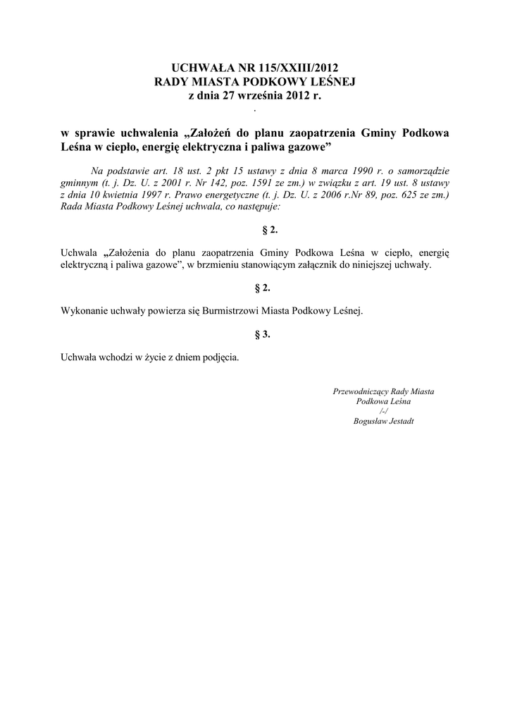 UCHWAŁA NR 115/XXIII/2012 RADY MIASTA PODKOWY LEŚNEJ z dnia 27 września 2012 r. . w sprawie uchwalenia „ZałoŜeń do planu zaopatrzenia Gminy Podkowa Leśna w ciepło, energię elektryczna i paliwa gazowe” Na podstawie art. 18 ust. 2 pkt 15 ustawy z dnia 8 marca 1990 r. o samorządzie gminnym (t. j. Dz. U. z 2001 r. Nr 142, poz. 1591 ze zm.) w związku z art. 19 ust. 8 ustawy z dnia 10 kwietnia 1997 r. Prawo energetyczne (t. j. Dz. U. z 2006 r.Nr 89, poz. 625 ze zm.) Rada Miasta Podkowy Leśnej uchwala, co następuje: § 2. Uchwala „ZałoŜenia do planu zaopatrzenia Gminy Podkowa Leśna w ciepło, energię elektryczną i paliwa gazowe”, w brzmieniu stanowiącym załącznik do niniejszej uchwały. § 2. Wykonanie uchwały powierza się Burmistrzowi Miasta Podkowy Leśnej. § 3. Uchwała wchodzi w Ŝycie z dniem podjęcia. Przewodniczący Rady Miasta Podkowa Leśna /-/ Bogusław Jestadt UZASADNIENIE uchwały Nr 115/XXIII/2012 Rady Miasta Podkowy Leśnej z dnia 27 września 2012 roku w sprawie uchwalenia „ZałoŜeń do planu zaopatrzenia Gminy Podkowa Leśna w ciepło, energię elektryczną i paliwa gazowe”. Zgodnie z art.19 ust.8 ustawy z dnia 10 kwietnia 1997 r. Prawo energetyczne (t. j. Dz. U. z 2006 r. Nr 89, poz. 625 ze zm.) rada gminy uchwala załoŜenia do planu zaopatrzenia w ciepło, energię elektryczną i paliwa gazowe, rozpatrując jednocześnie wnioski, zastrzeŜenia i uwagi zgłoszone w czasie wyłoŜenia projektu załoŜeń do publicznego wglądu. Posiadanie gminnego planu zaopatrzenia w ciepło, energię elektryczną i paliwa gazowe w Polsce jest obowiązkiem prawnym, wynikającym z : 1) Ustawy z dnia 8 marca 1990 r. o samorządzie gminnym (tekst jednolity: Dz. U. z 2001 r., Nr 142, poz. 1591 ze zm.), zgodnie z którą: • zaspakajanie zbiorowych potrzeb wspólnoty naleŜy do zadań własnych gminy, • wszelkie sprawy o znaczeniu lokalnym, o ile nie są zastrzeŜone ustawami na rzecz innych podmiotów są zadaniami własnymi gminy, • do grup zadań własnych gminy naleŜą zadania związane z infrastrukturą techniczną (m.in. drogi, ulice, wodociągi, kanalizacje, zaopatrzenie w energię, komunikacja publiczna etc.), • gmina moŜe realizować zadania publiczne równieŜ w ramach współdziałania z innymi gminami. 2) Ustawy z dnia 10 kwietnia 1997 r. Prawo energetyczne (t. j. Dz. U. z 2006 r. Nr 89, poz. 625 ze zm.), która stwierdza m.in, Ŝe: • gminy są odpowiedzialne za sprawy lokalne, do których naleŜą planowanie i organizacja zaopatrzenia w ciepło, energię elektryczną i paliwa gazowe na obszarze gminy, • gmina realizuje zadania zgodnie z załoŜeniami polityki energetycznej państwa oraz z ustaleniami miejscowego planu zagospodarowania przestrzennego. „Projekt załoŜeń do planu zaopatrzenia Gminy Podkowa Leśna w ciepło, energię elektryczną i paliwa gazowe”, zgodnie z obowiązującymi przepisami: 1) w oparciu o art. 19 ust. 5 ustawy Prawo energetyczne uzyskał pozytywną opinię Zarządu Województwa Mazowieckiego w Warszawie (pismo nr MBPR/OTS-ZRR-EP-4338-18/12 z dnia 19 kwietnia 2012 r.) w zakresie koordynacji współpracy z innymi gminami oraz zgodności z polityką energetyczną państwa, 2) stosownie do art. 19 ust. 6 ustawy Prawo energetyczne, dnia 8 maja 2012 r. został wyłoŜony na okres 21 dni do publicznego wglądu, z informacją o moŜliwości składania w ww. terminie - wniosków, zastrzeŜeń i uwag, przez osoby i jednostki organizacyjne zainteresowane zaopatrzeniem w ciepło, energię elektryczną i paliwa gazowe na obszarze Gminy Podkowa Leśna. O powyŜszym poinformowano poprzez wywieszenie ogłoszenia na tablicy informacyjnej Urzędu Miasta. Informacja wraz z „Projektem załoŜeń….” została zamieszczona na stronie internetowej Urzędu. Z projektem załoŜeń społeczeństwo mogło się zapoznać w Referacie Inwestycji, pok. Nr 14. W ustawowym terminie 21 dni (ani w terminie późniejszym) – nie wpłynął Ŝaden wniosek w powyŜszej sprawie, nie zanotowano równieŜ Ŝadnych zastrzeŜeń ani uwag do wyłoŜonego projektu załoŜeń. Plany zaopatrzenia w ciepło opracowuje się dwuetapowo. Etapem pierwszym jest opracowanie projektu załoŜeń do planu zaopatrzenia w ciepło, energię elektryczną i paliwa gazowe, a etapem drugim (opracowywanym fakultatywnie) - projektu planu zaopatrzenia w ciepło, energię elektryczną i paliwa gazowe. Zgodnie z art. 20 ust. 1 ustawy Prawo energetyczne projekt planu zaopatrzenia w ciepło, energię elektryczną i paliwa gazowe dla obszaru gminy lub jej części (drugi etap) opracowuje się tylko wówczas, gdy plany przedsiębiorstw energetycznych nie zapewniają realizacji załoŜeń do planu zaopatrzenia w ciepło, energię elektryczną i paliwa gazowe. Projekt planu opracowywany jest wtedy na podstawie uchwalonych przez radę gminy załoŜeń i winien być z nim zgodny. Jak wynika z analizy przeprowadzonej w „Projekcie załoŜeń do planu zaopatrzenia Gminy Podkowa Leśna w ciepło, energię elektryczną i paliwa gazowe” - przedsiębiorstwa dostarczające wszystkie rozwaŜane czynniki energetyczne dla Podkowy Leśnej, zapewniają dostawy tych mediów na poziomie zabezpieczającym potrzeby miasta i nie jest na dzień dzisiejszy konieczne opracowanie projektu planu zaopatrzenia w ciepło, energię elektryczną i paliwa gazowe. W związku z tym, Ŝe opracowany „Projekt załoŜeń do planu zaopatrzenia Gminy Podkowa Leśna w ciepło, energię elektryczną i paliwa gazowe” spełnia obowiązujące przepisy prawa (uzyskał wszystkie wymagane opinie), a w czasie jego wyłoŜenia do publicznego wglądu, nie wpłynął Ŝaden wniosek od osób i jednostek zainteresowanych, nie zanotowano teŜ Ŝadnych zastrzeŜeń i uwag - zgodnie z art.19 ust.8 ustawy z dnia 10 kwietnia 1997 r. Prawo energetyczne przedkłada się go Radzie Miasta Podkowy Leśnej, jako dokument, stanowiący podstawę do uchwalenia „ZałoŜeń do planu zaopatrzenia Gminy Podkowa Leśna w ciepło, ene