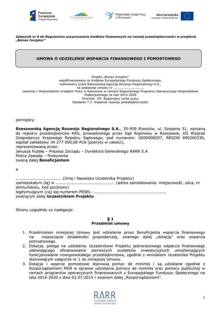 Załącznik nr 6 do Regulaminu przyznawania środków finansowych na rozwój przedsiębiorczości w projekcie „Biznes Inicjator” UMOWA O UDZIELENIE WSPARCIA FINANSOWEGO I POMOSTOWEGO Projekt „Biznes Inicjator” współfinansowany ze środków Europejskiego Funduszu Społecznego, realizowany przez Rzeszowską Agencję Rozwoju Regionalnego S.A., Oś priorytetowa VII. Regionalny rynek pracy na podstawie Umowy nr ............................ Działanie 7.3 Wsparcie przedsiębiorczości zawartej z Wojewódzkim Urzędem Pracy w Rzeszowie wrozwoju ramach Regionalnego Programu Operacyjnego Województwa Podkarpackiego na lata 2014-2020 Priorytet VII Regionalny rynek pracy Działanie 7.3 Wsparcie rozwoju przedsiębiorczości pomiędzy: Rzeszowską Agencją Rozwoju Regionalnego S.A., 35-959 Rzeszów, ul. Szopena 51, wpisaną do rejestru przedsiębiorców KRS, prowadzonego przez Sąd Rejonowy w Rzeszowie, XII Wydział Gospodarczy Krajowego Rejestru Sądowego, pod numerem: 0000008207, REGON 690260330, kapitał zakładowy 34 277 000,00 PLN (pokryty w całości), reprezentowaną przez: Janusza Fudałę – Prezesa Zarządu – Dyrektora Generalnego RARR S.A Piotra Zawadę – Prokurenta zwaną dalej Beneficjentem a .................................. (Imię i Nazwisko Uczestnika Projektu) zamieszkałym (łą) w ............................................ (adres zameldowania: miejscowość, ulica, nr domu/lokalu, kod pocztowy) legitymującym (cą) się numerem PESEL: ...................................................... zwaną/ym dalej Uczestnikiem Projektu Strony uzgodniły co następuje: §1 Przedmiot umowy 1. Przedmiotem niniejszej Umowy jest udzielenie przez Beneficjenta wsparcia finansowego na rozpoczęcie działalności gospodarczej, zwanego dalej „dotacją” oraz wsparcia pomostowego. 2. Dotacja, polega na udzieleniu Uczestnikowi Projektu jednorazowego wsparcia finansowego ułatwiającego sfinansowanie pierwszych wydatków inwestycyjnych umożliwiających funkcjonowanie nowopowstałego przedsiębiorstwa, zgodnie z wnioskiem Uczestnika Projektu stanowiącym załącznik nr 1 do niniejszej Umowy. 3. Dotacja i wparcie pomostowe stanowią pomoc de minimis i są udzielane zgodnie z Rozporządzeniem MIiR w sprawie udzielania pomocy de minimis oraz pomocy publicznej w ramach programów operacyjnych finansowanych z Europejskiego Funduszu Społecznego na lata 2014-2020 z dnia 02.07.2015 r zwanym dalej „Rozporządzeniem”. 1 4. Uczestnik projektu otrzymuje dotację na zasadach i warunkach określonych w niniejszej Umowie oraz załącznikach, które stanowią integralną część Umowy. 5. Uczestnik Projektu przyjmuje dotację i zobowiązuje się do jej wykorzystania zgodnie z harmonogramem rzeczowo-finansowym inwestycji będącym częścią biznesplanu. 6. Wsparcie pomostowe – wsparcie udzielane jest w dwóch formach: wsparcie pomostowe finansowe - bezzwrotna pomoc finansowa dla Uczestnika Projektu w formie comiesięcznej dotacji wypłacane przez okres nie dłuższy niż 12 miesięcy, licząc od daty podpisania umowy na otrzymanie wsparcia finansowego i pomostowego. wsparcie pomostowe w postaci usług doradczo-szkoleniowych o charakterze specjalistycznym. 7. Uczestnik Projektu otrzymuje wsparcie pomostowe i zobowiązuje się do jego wykorzystania na zasadach i warunkach określonych w niniejszej Umowie i regulaminie przyznawania środków finansowych na rozwój przedsiębiorczości w projekcie „BIZNES INICJATOR” oraz Regulaminie rekrutacji i uczestnictwa w projekcie „BIZNES INICJATOR”. 8. Uczestnik projektu ponosi wyłączną odpowiedzialność za szkody wyrządzone wobec osób trzecich w związku z realizowaną inwestycją. 9. Niniejsza Umowa obowiązuje od dnia podpisania do .......................... §2 Finansowanie dotacji i płatności 1. 2. 3. 4. 5. 6. 7. 8. 9. Całkowite wydatki inwestycyjne brutto wynoszą ................. PLN (słownie:…………………….PLN). Kwota dofinansowania wynosi …………… PLN (słownie: ………………………………….……………PLN). Koszty niekwalifikowalne wynoszą brutto ………………… PLN (słownie: ……………………………….PLN). Beneficjent wypłaci Uczestnikowi projektu kwotę dotacji, w następujący sposób: 1) zaliczka w wysokości 90% kwoty dotacji, tj. ………… PLN (słownie..............……………… PLN), zostanie przekazana w terminie do 14 dni od dnia złożenia zabezpieczenia, o którym mowa w § 4, ust. 2, pod warunkiem dostępności środków na rachunku bankowym Beneficjenta. 2) płatność końcowa w formie refundacji poniesionych przez Uczestnika projektu całkowitych wydatków na realizację inwestycji, w wysokości nie większej niż 10% kwoty dotacji, tj. ……………… PLN (słownie: .................................................... PLN), dokonana będzie w terminie 14 dni od dnia zatwierdzenia przez Beneficjenta całościowego rozliczenia wydatków inwestycyjnych objętych dotacją, pod warunkiem dostępności środków na rachunku bankowym Beneficjenta. Beneficjent w dniu podpisania niniejszej Umowy zobowiązany jest wydać Uczestnikowi projektu zaświadczenie o udzielonej pomocy de minimis, zgodnie ze wzorem określonym w załączniku do rozporządzenia Rady Ministrów z dnia 20 marca 2007 r. w sprawie zaświadczeń o pomocy de minimis i pomocy de minimis w rolnictwie lub rybołówstwie (Dz. U. Nr 53 poz. 354 z późn. zm.) Uczestnik projektu zobowiązany jest przechowywać dokumentację związaną z otrzymaną dotacją przez okres 10 lat, licząc od dnia podpisania niniejszej Umowy. Płatności będą dokonywane przez Beneficjenta na rachunek Uczestnika projektu wskazany w Zaświadczeniu o otwarciu wyodrębnionego rachunku bankowego stanowiącym załącznik nr 6 do Umowy. Wszystkie płatności dokonywane przez Uczestnika projektu tytułem zakupów dokonanych w ramach niniejszej umowy będą realizowane bezgotówkowo za pośrednictwem rachunku bankowego Benefic